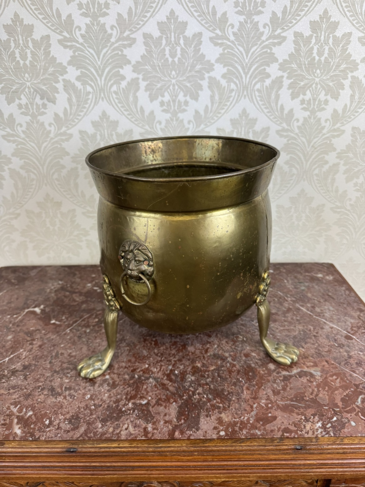 Mosazný květináč či obal na květináč, zdobený hlavami lvů s kruhovými uchy po stranách. Stojí na třech nohách ve tvaru lvích tlap zakončených drápy. Povrch s patinou stáří.1 980 Kč