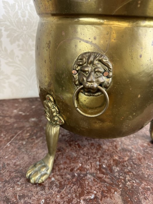 Mosazný květináč na lvích nohách s kruhovými madly - f228