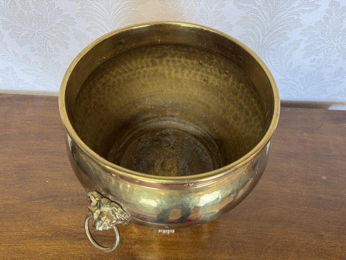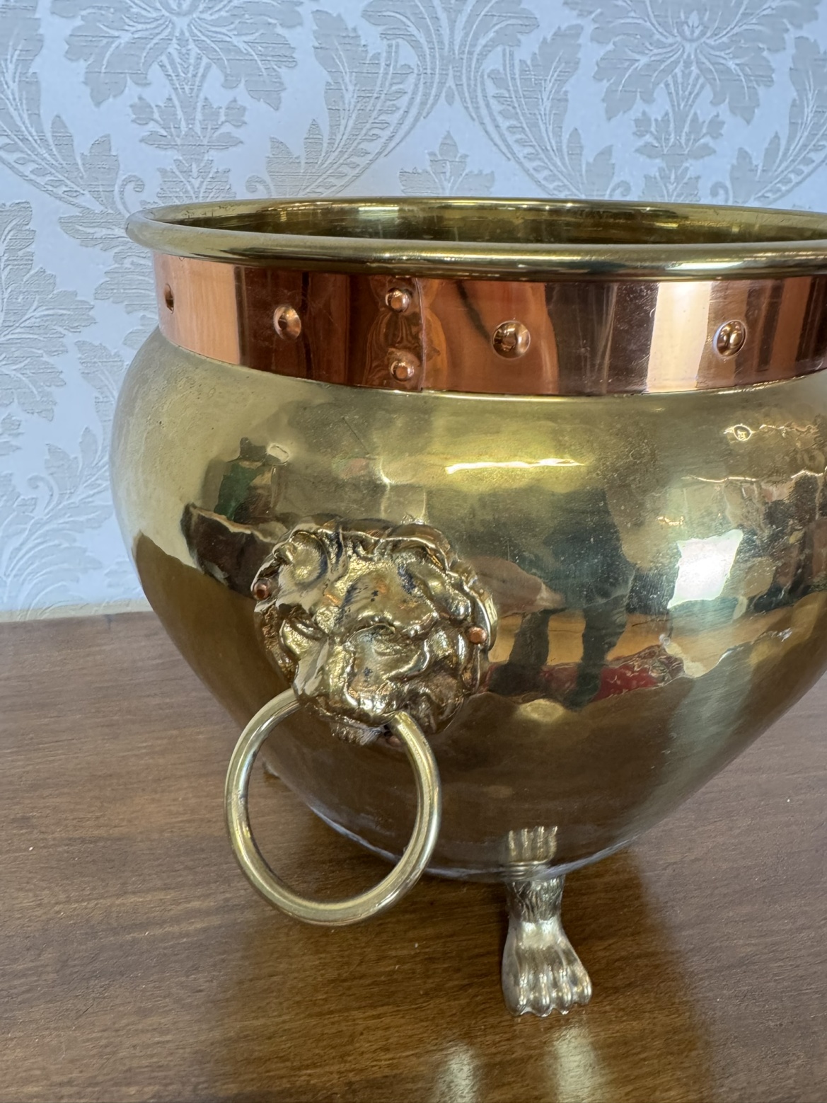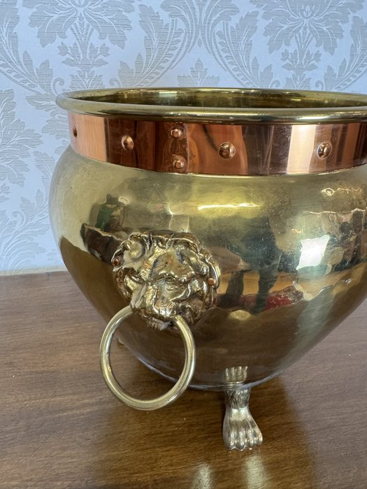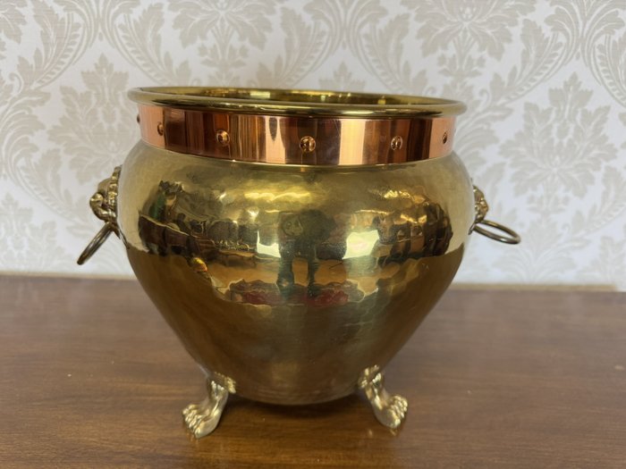 Mosazná nádoba s plastickým dekorem lvích hlav a výrazným měděným pruhem po obvodu horní části. Celkový dojem dotváří plastické tlapky na třech nožkách a úchyty v podobě kroužků. Vhodné i jako květináč.