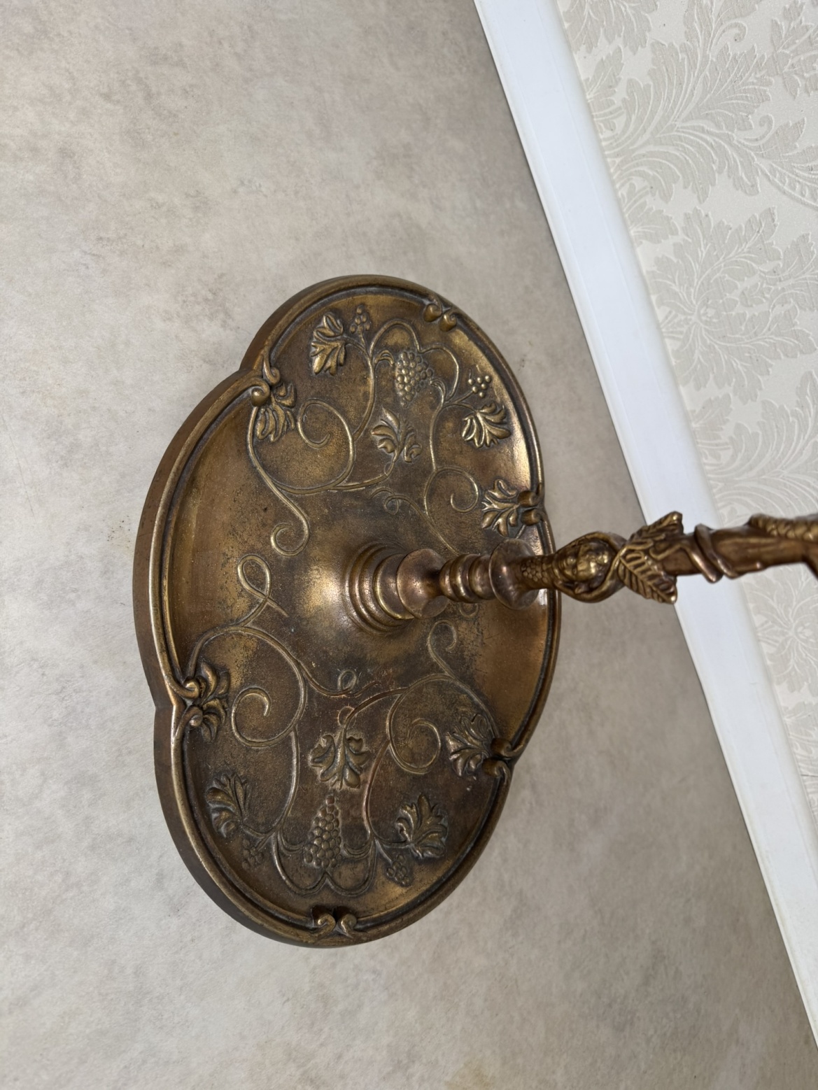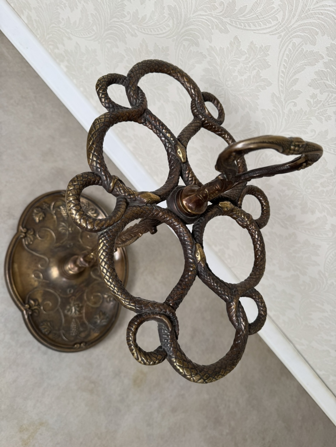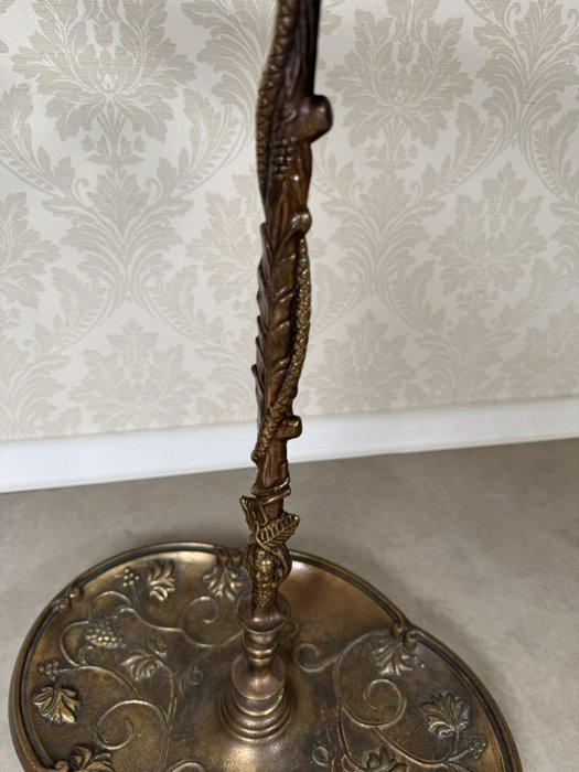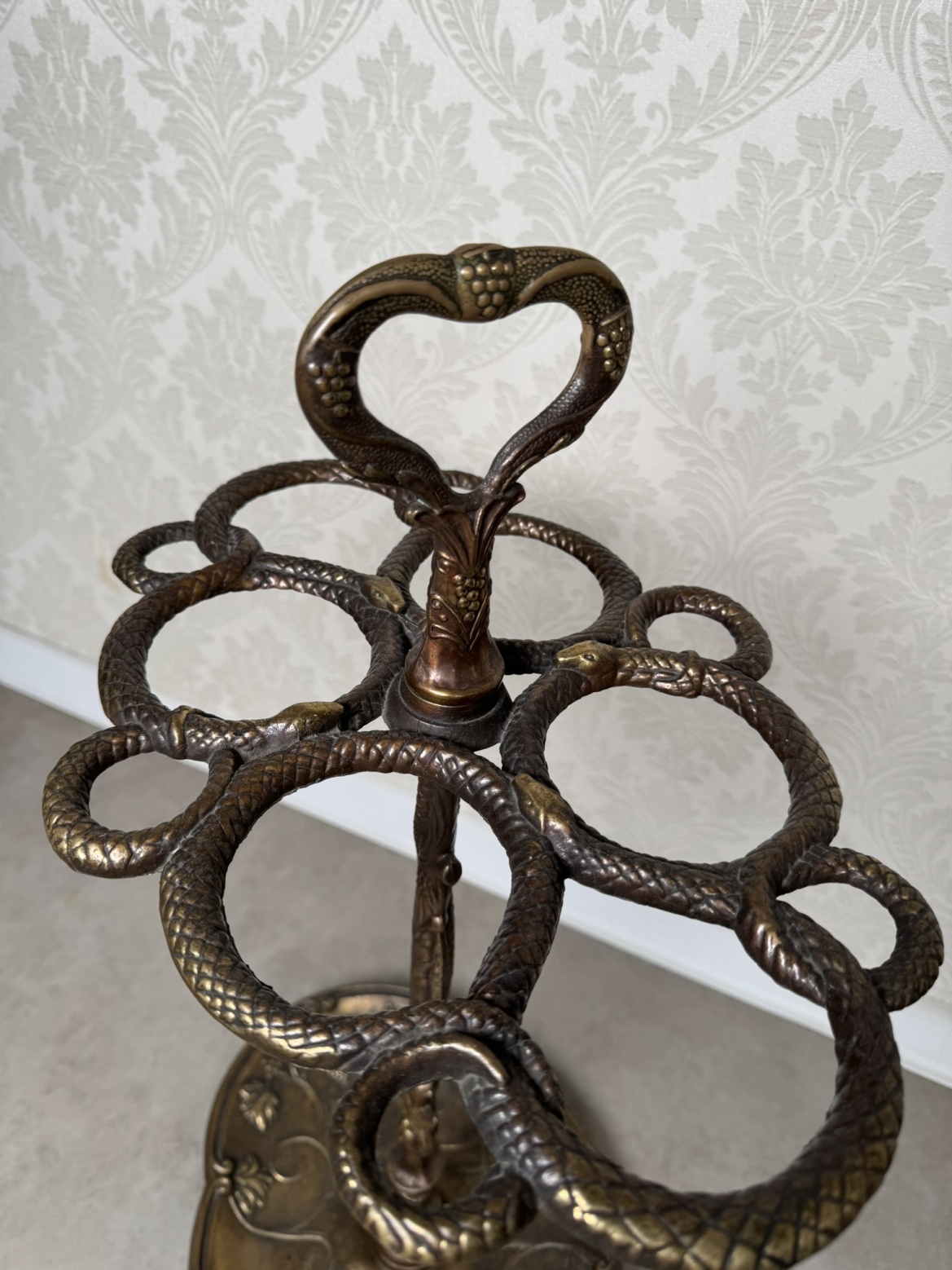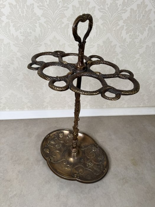 Dekorativní mosazný stojan na deštníky s horní částí tvořenou propletenými hady, jejichž těla vytvářejí držáky na jednotlivé kusy. Rukojeť ve tvaru srdce je zdobena hroznovým motivem, který se opakuje i na litinové podstavě.4 890 Kč