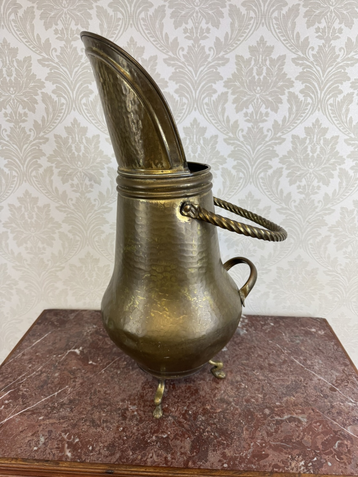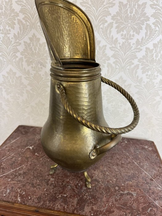 Mosazný uhlák s tepaným povrchem a ozdobným uchem - f235
