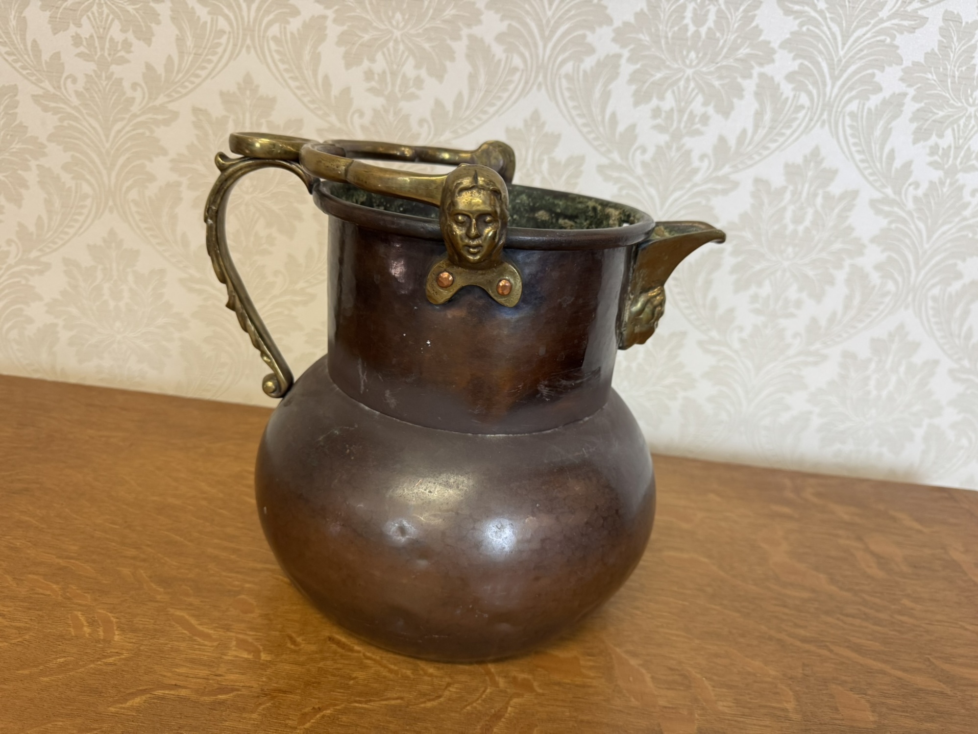 Nádoba s rozšířeným tělem a širokým hrdlem. Ozdobné mosazné držadlo zakončené kroužkem nese reliéf ženské tváře, druhá strana pak motiv zvířecí hlavy. Vnitřní zelená patina dokládá stáří.2 380 Kč