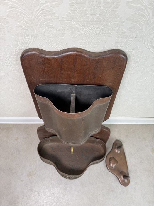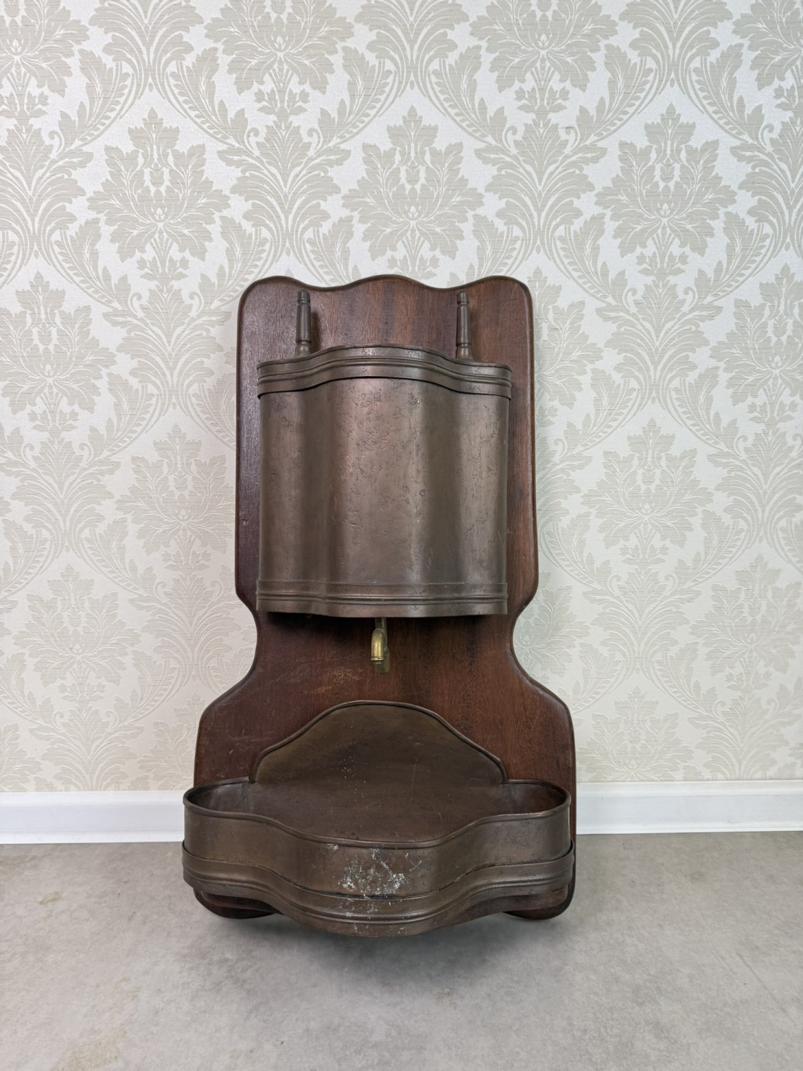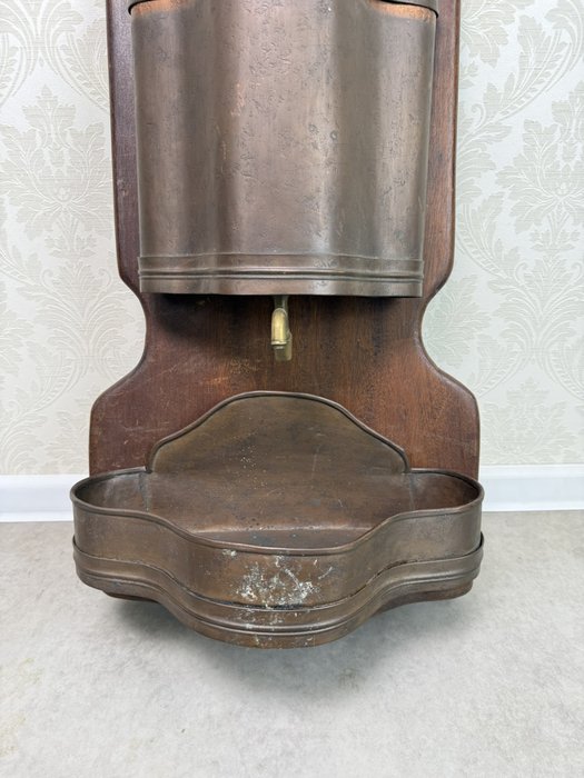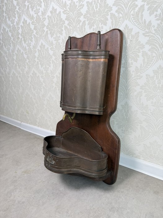 Umyvadlový set s nádržkou na vodu a mělkou miskou pro zachycení odtoku, uchycený na tvarovaném dřevěném podkladu. Nádrž je osazena mosazným kohoutkem, horní víko je odnímatelné. Šlo o praktický prvek do domácnosti, často umisťovaný do chodeb, ložnic nebo venkovských kuchyní – běžný před zavedením vodovodních systémů.