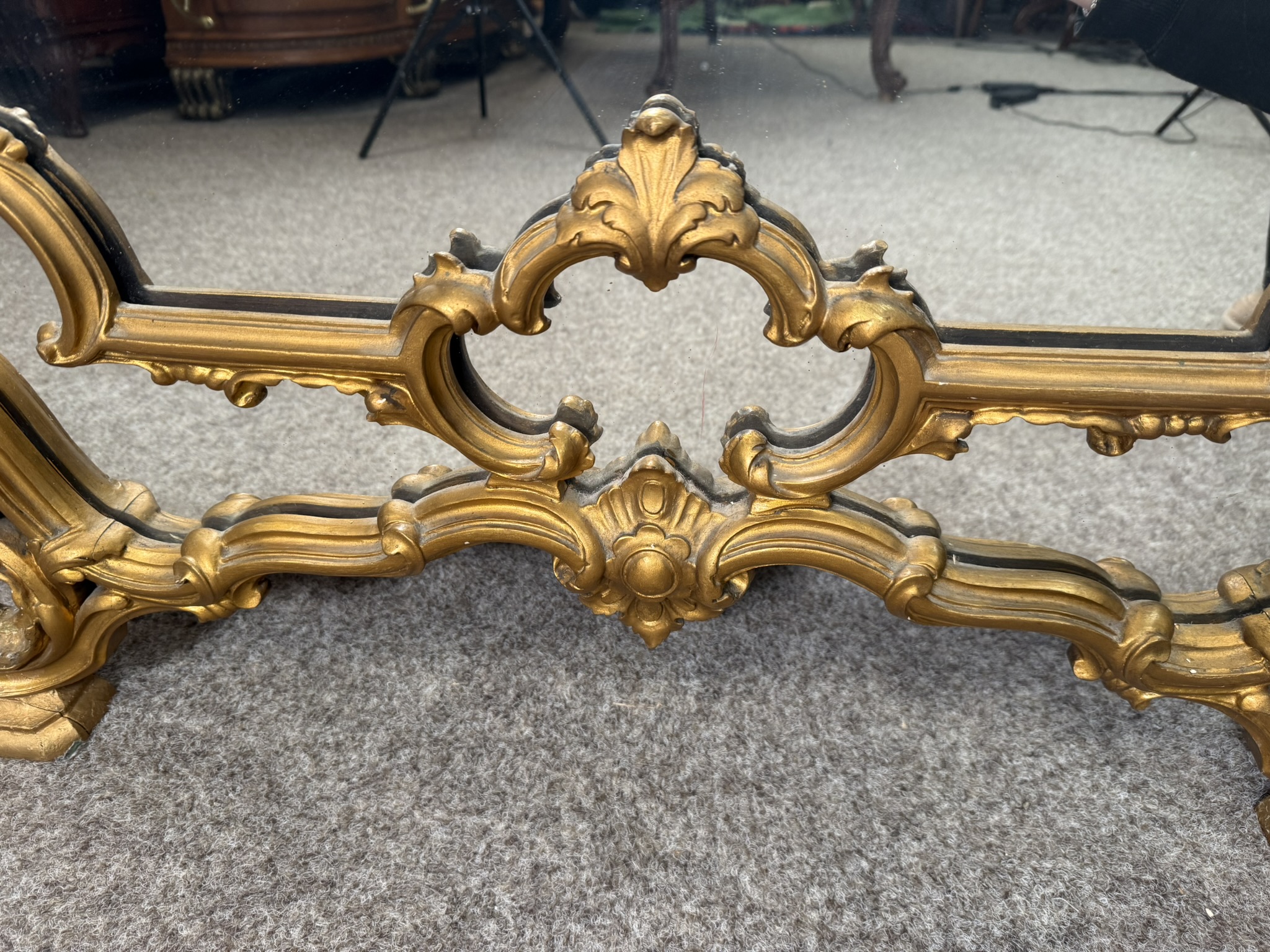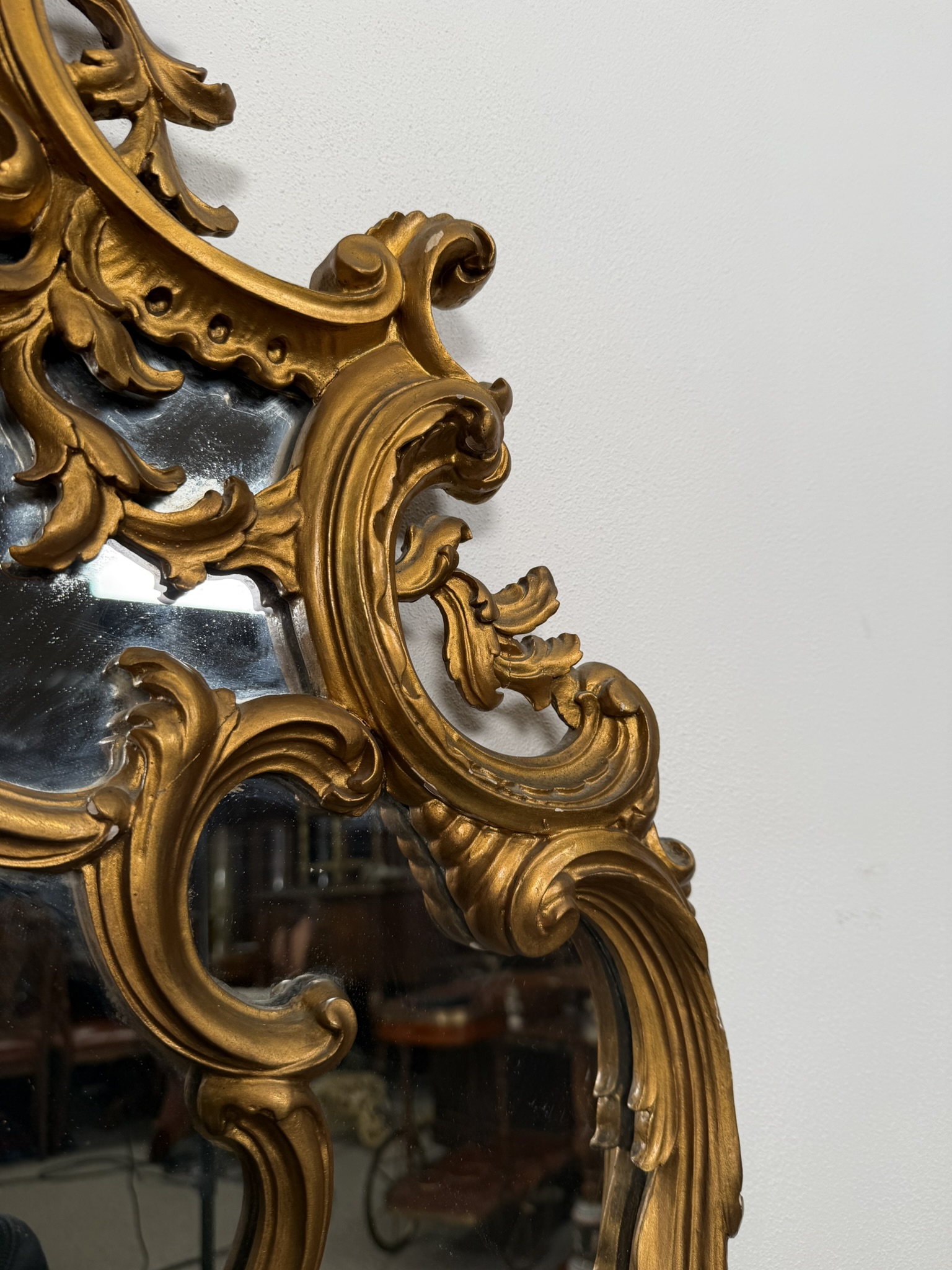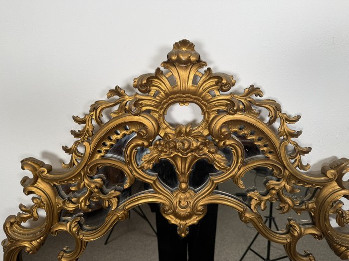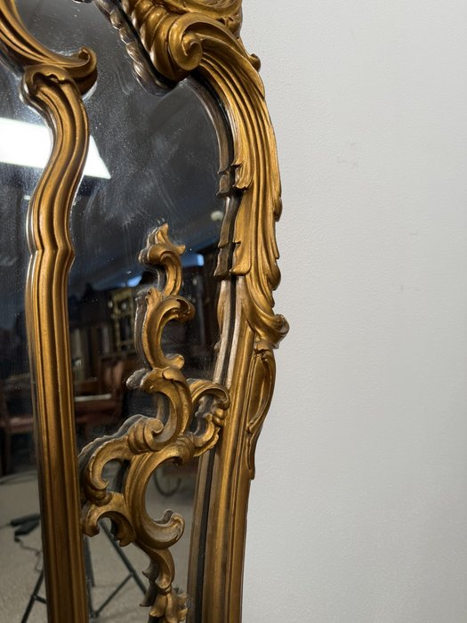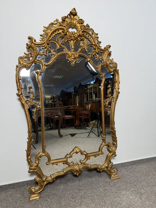 Reprezentativní nástěnné zrcadlo v profilovaném zlatě patinovaném rámu s výraznou řezbou. Dominují mu asymetrické volutové křivky, květinové motivy a dekorativní kartuše ve vrcholu. Spodní část doplňuje tvarovaná podnož s ornamentálními prvky.