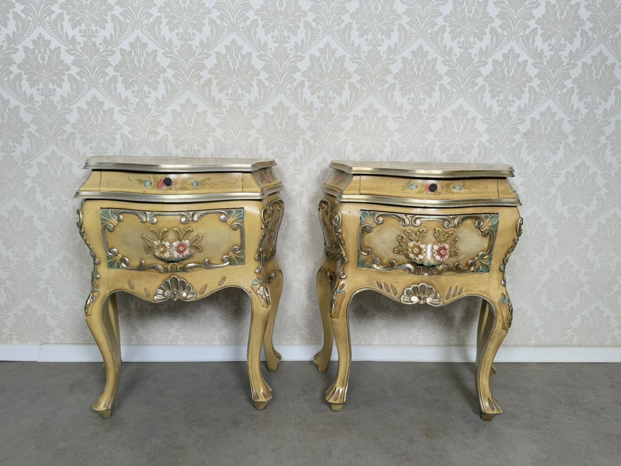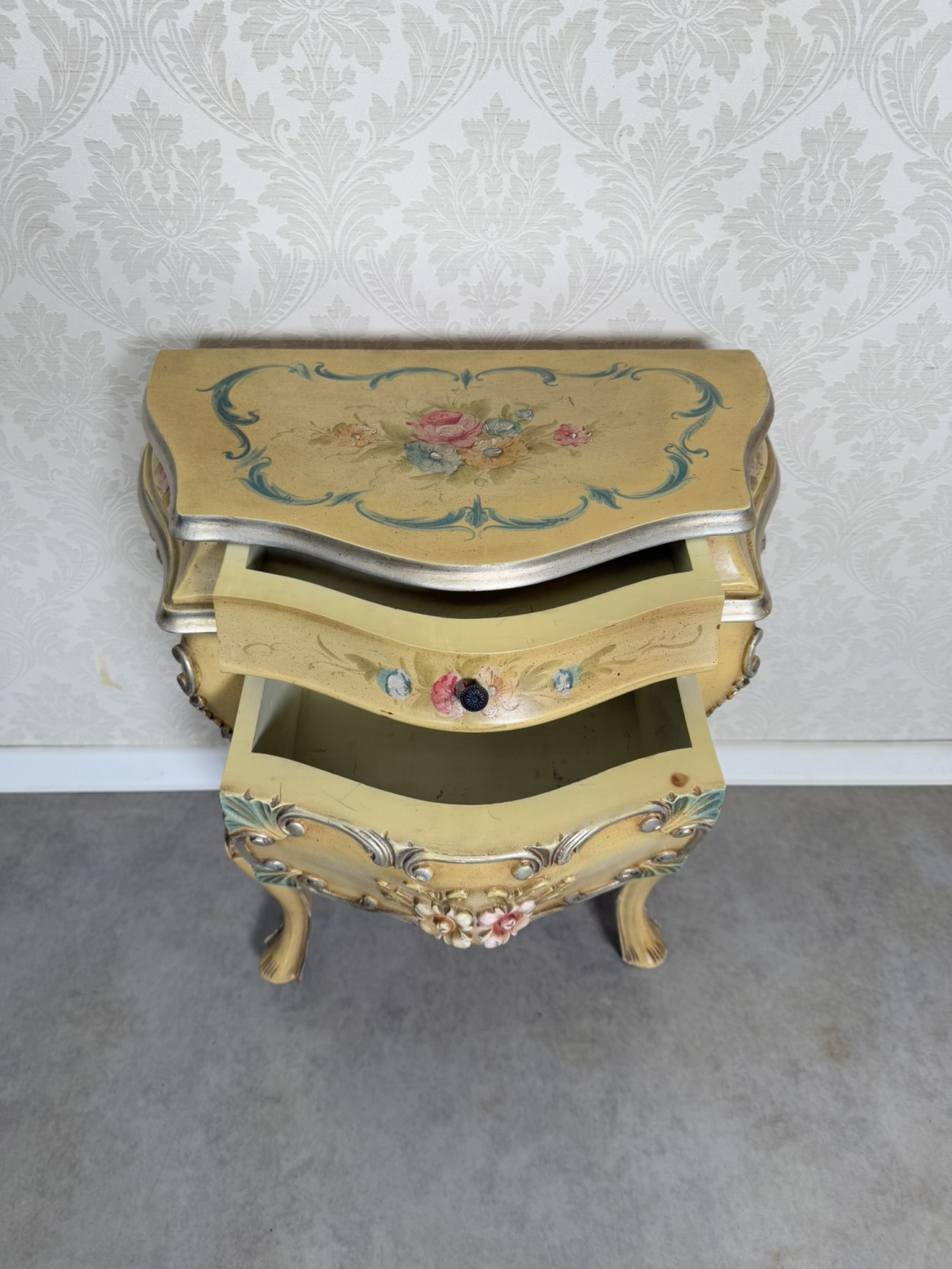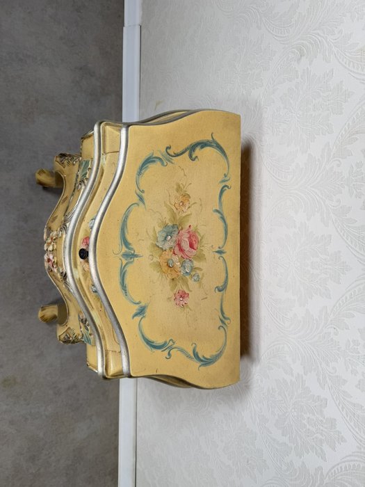 Elegantní noční stolek s ručně malovanými květinovými motivy v pastelových barvách. Korpus s jemně prohnutými liniemi, zdobený plastickými ornamenty a patinovaným povrchem v odstínu slonové kosti s efektním lemem.9 250 Kč