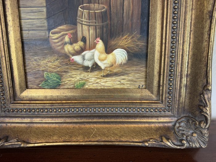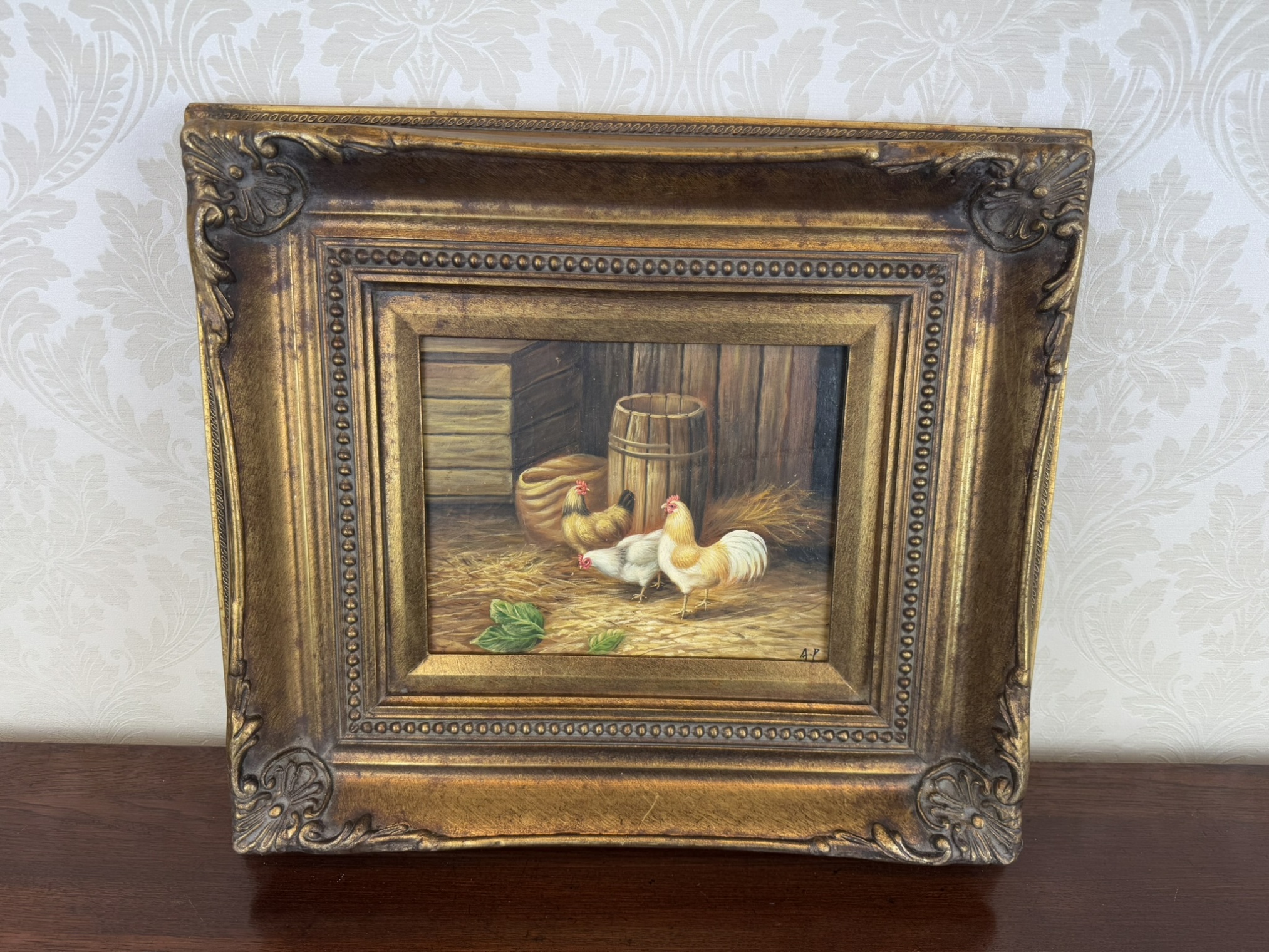 Obrázek je zasazený do bohatě zdobeného rámu z pryskyřice v antickém zlatém odstínu. Malba zobrazuje venkovskou scenérii s kohouty a slepicemi, laděnou do přírodních barev.
