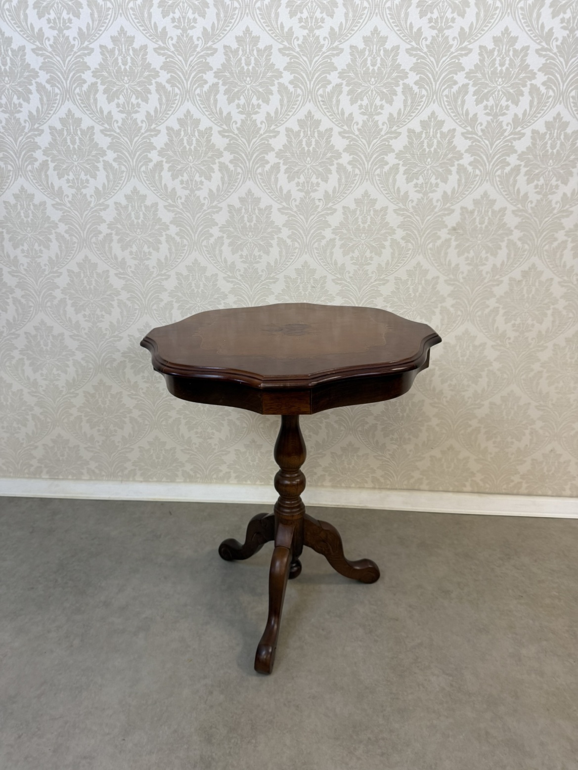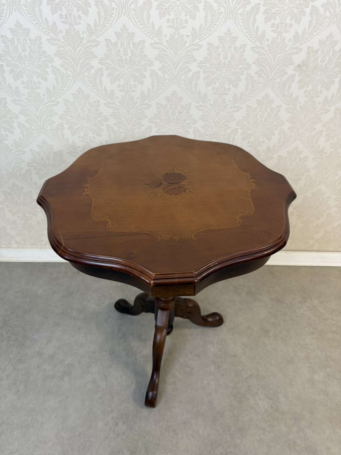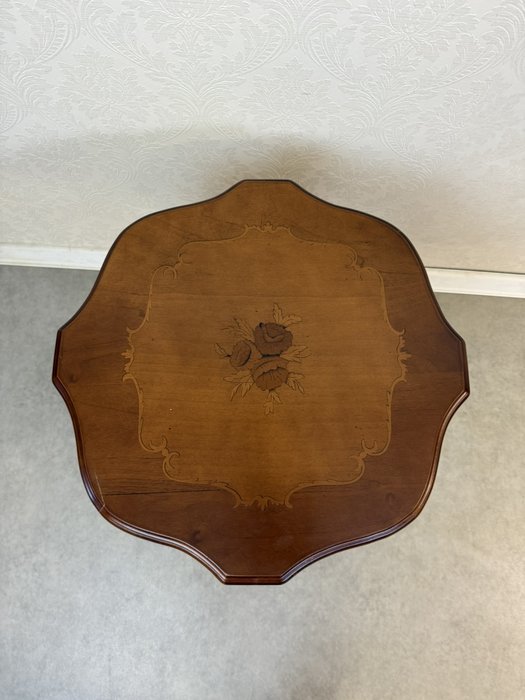 Kulatý stolek s profilovanou deskou, jejíž střed zdobí florální intarzie lemovaná jemným linkovým orámováním. Stolek stojí na jedné středové noze s trojicí klenutých nožek.