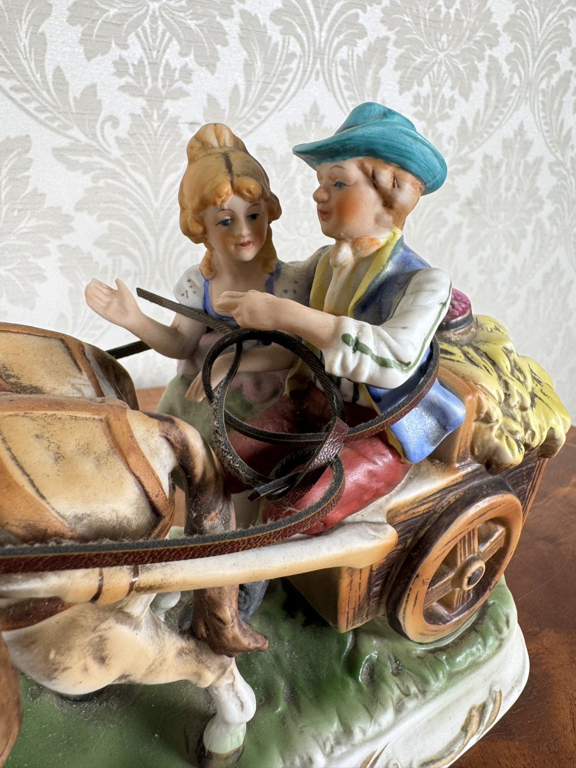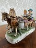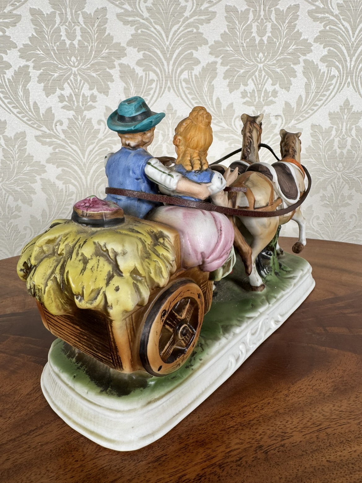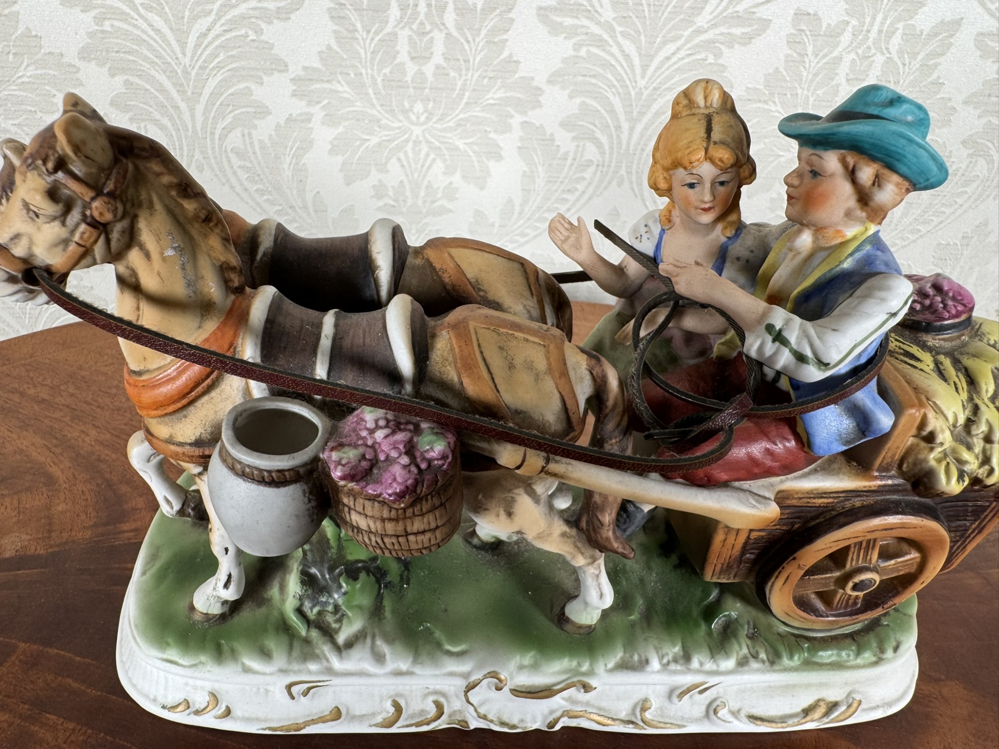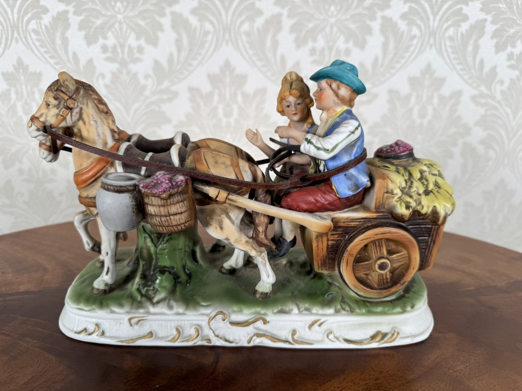 Detailně zpracovaná porcelánová figurka zobrazuje pár na venkovském povoze taženém koněm. Veselá výjev je plný barev, s důrazem na tradiční oděv, textury a prvky jako víno a seno. Zdobený podstavec dodává dekorativnosti.2 250 Kč