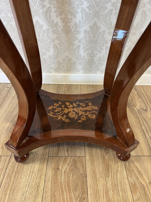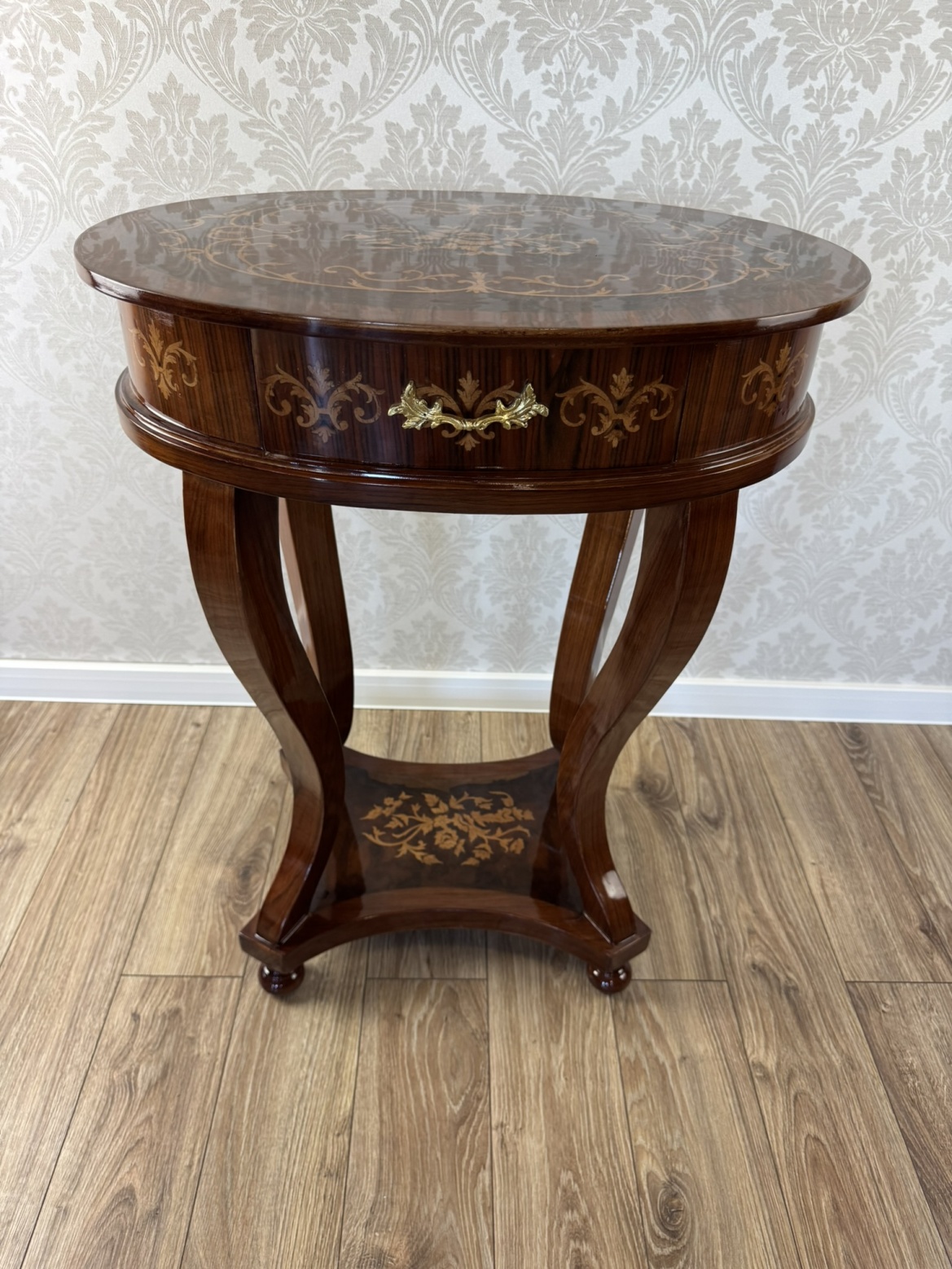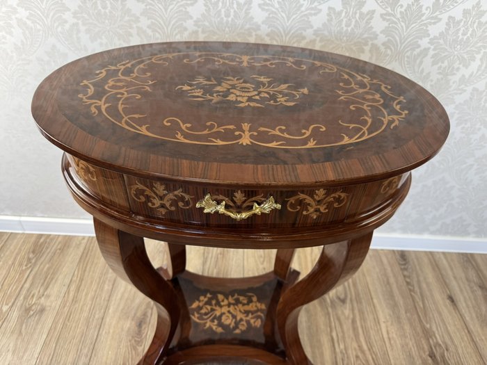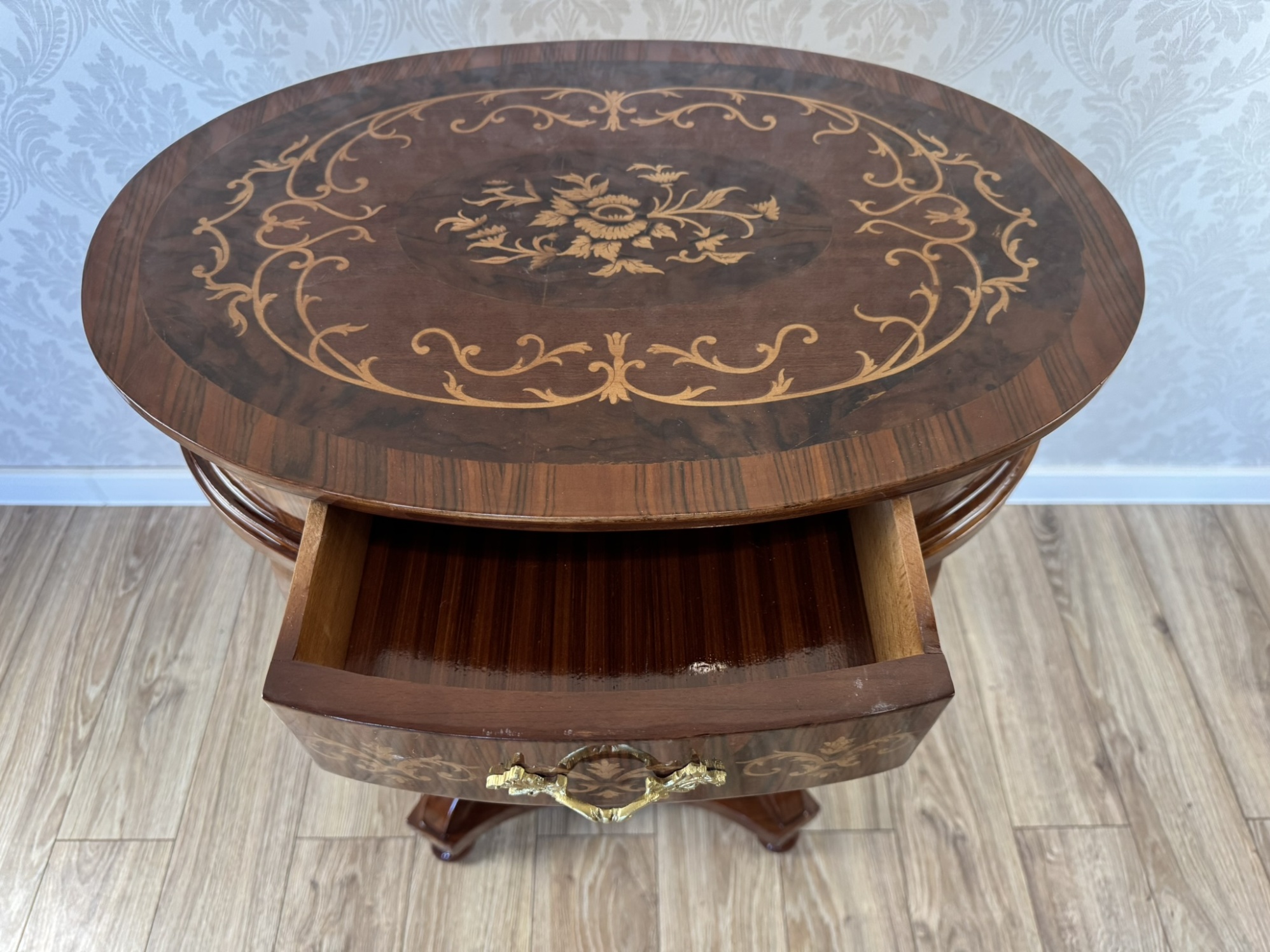 Stolek s oválnou deskou s bohatou květinovou intarzií na horní ploše, čele zásuvky i na spodní podnožní desce. Konstrukce spočívá na čtyřech prohnutých nohách, které se sbíhají do středového podstavce. Stolek je osazen decentním mosazným kováním.5 680 Kč