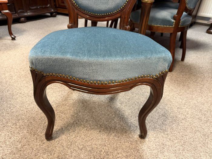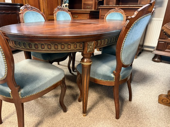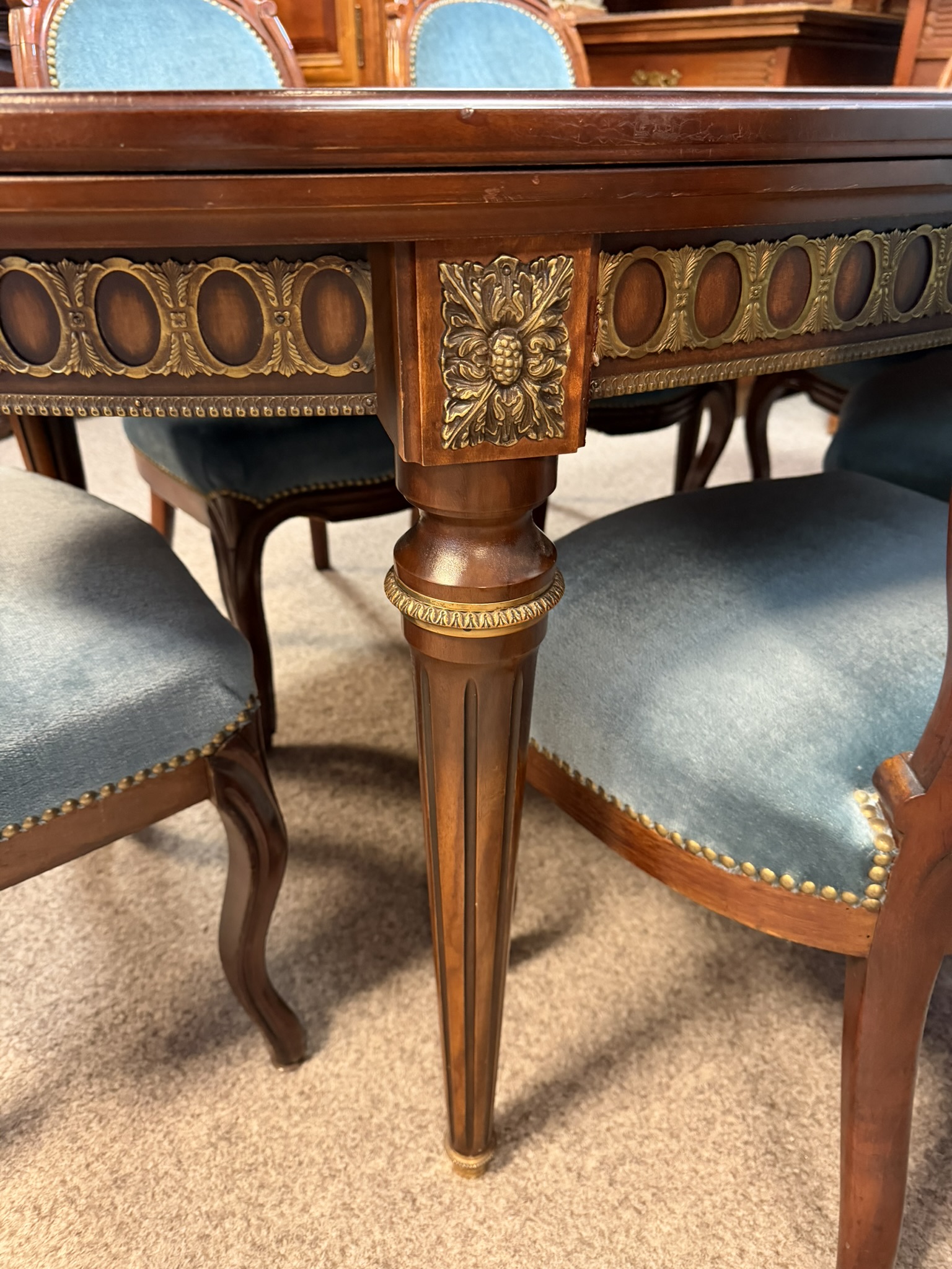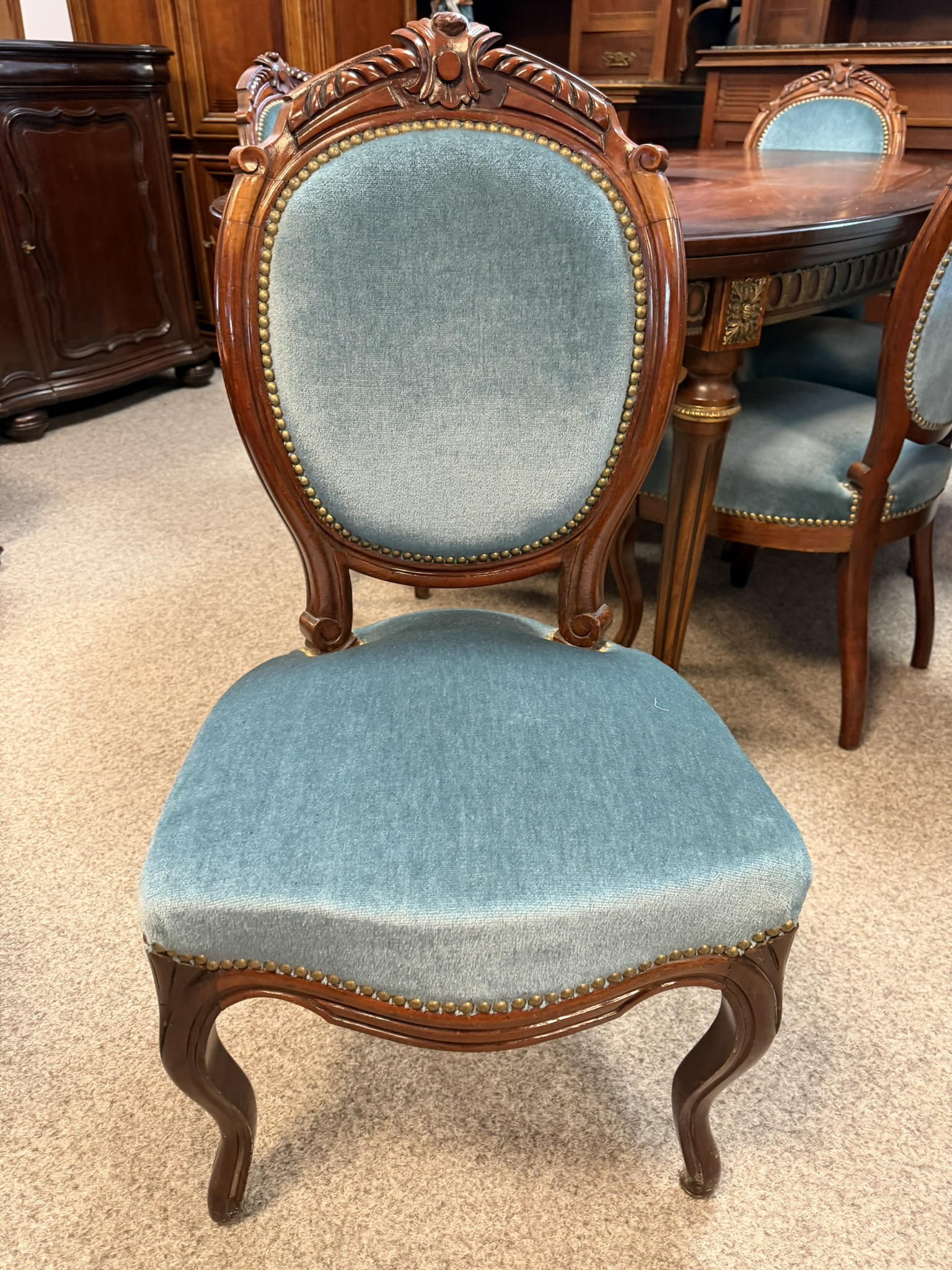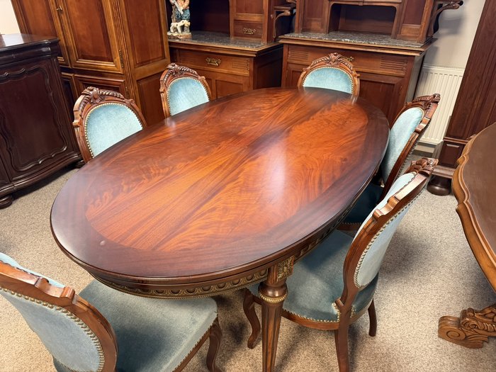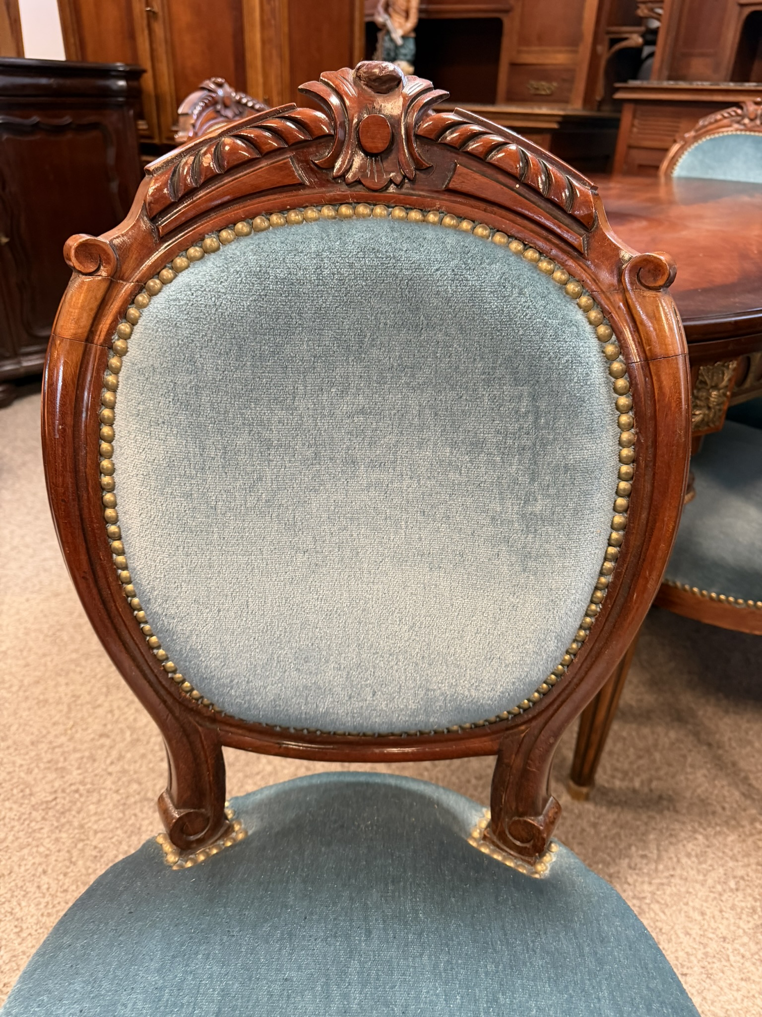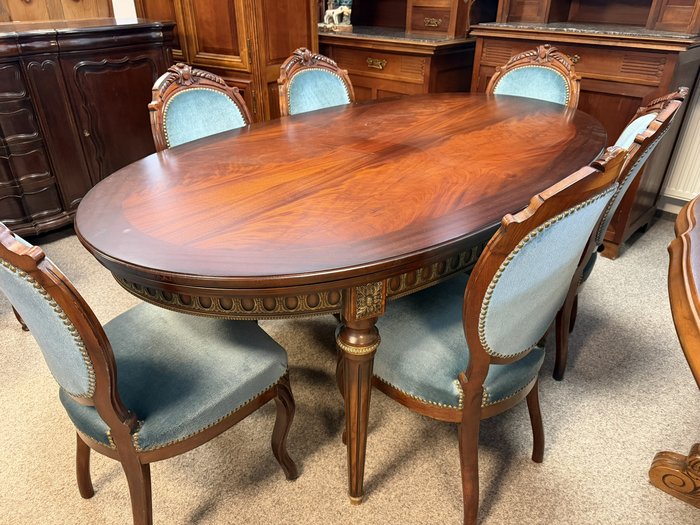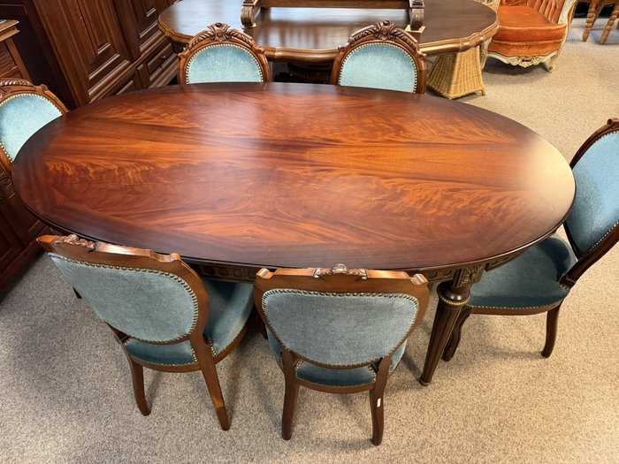 Oválný jídelní stůl s bohatou kresbou dřeva doplněný sadou židlí s vyřezávanými opěráky a čalouněním v jemném modrozeleném odstínu. Celek doplňují prohnuté nohy, detaily a ozdobné prvky. Hrany stolu zdobí jemná profilace, zatímco židle vynikají tvarovanými liniemi a dekorativním čalouněním s hřebíkovou lištou.