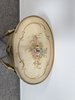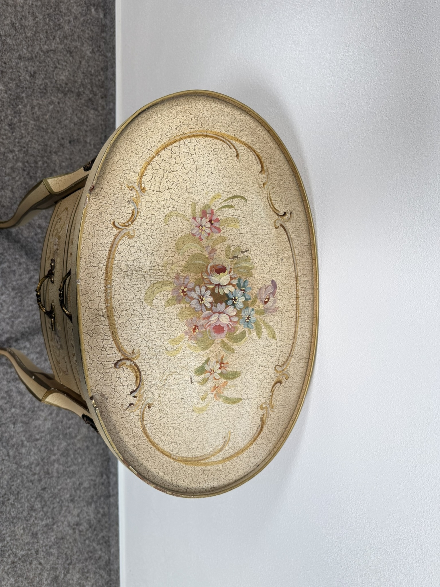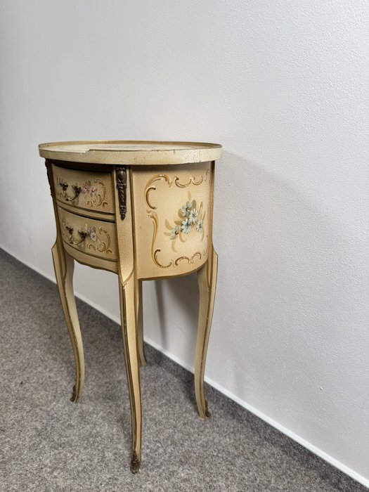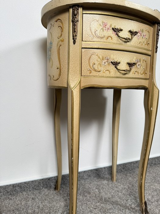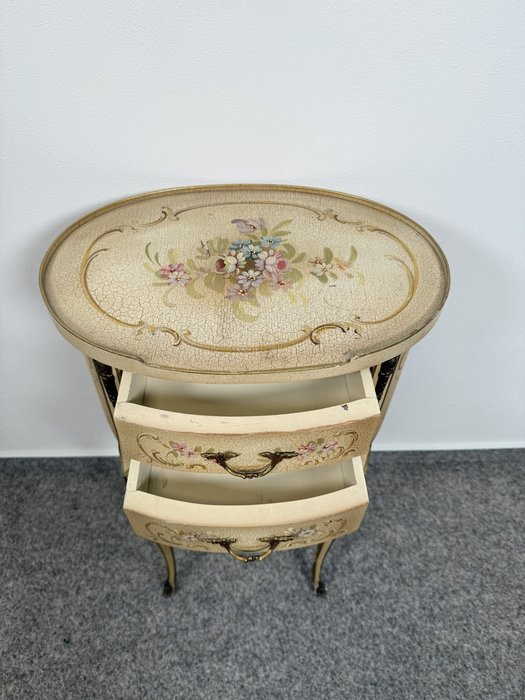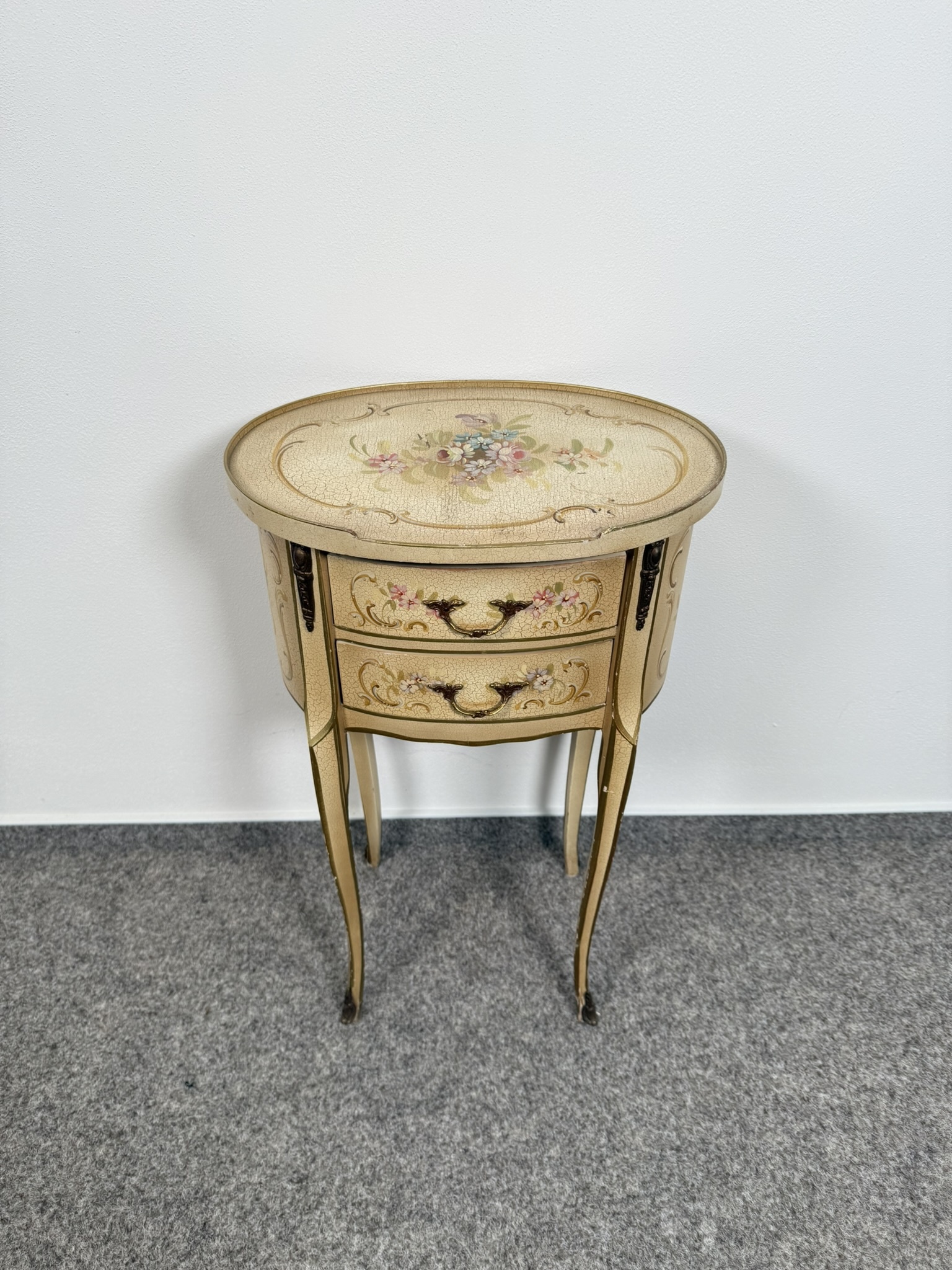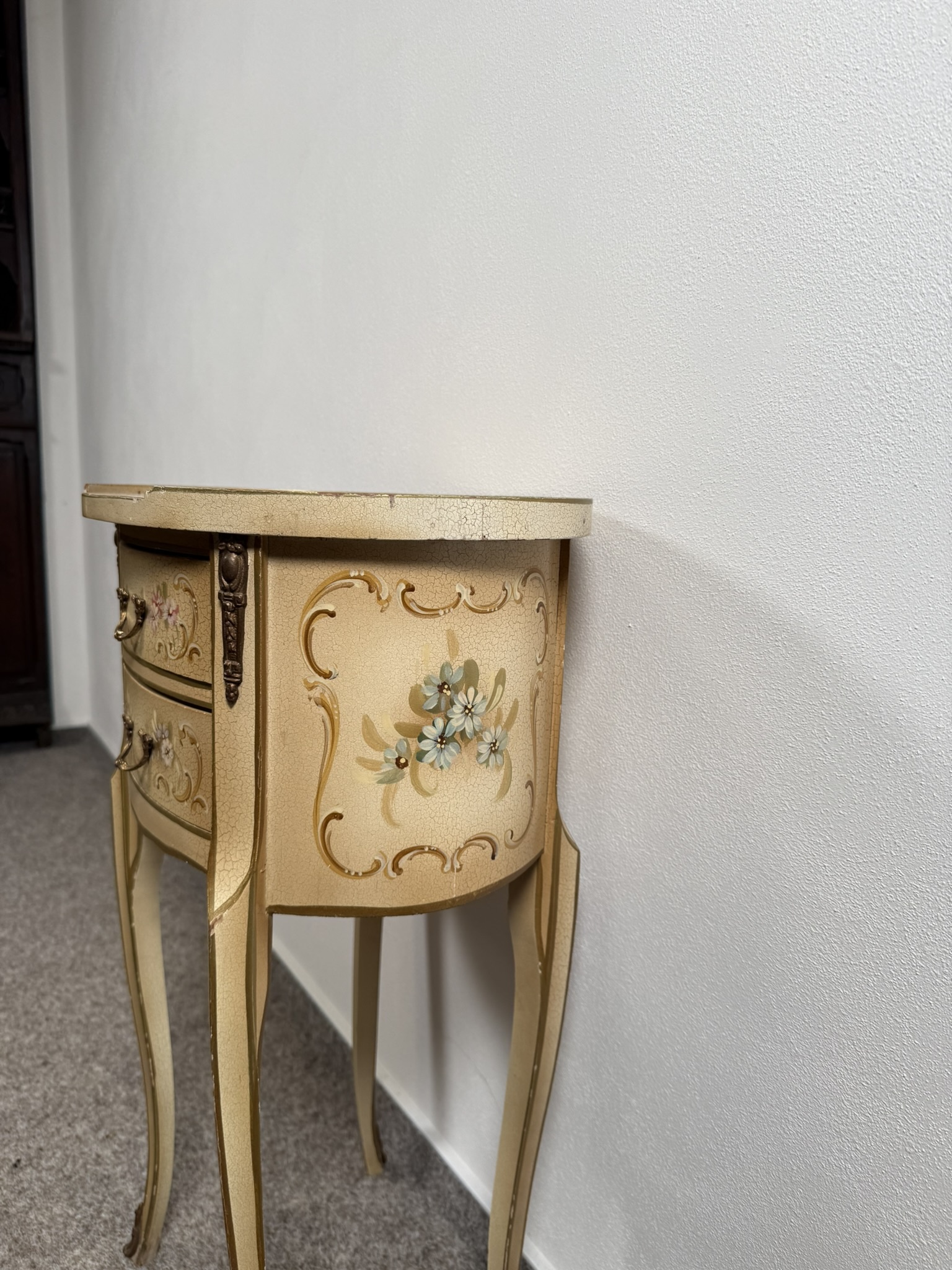 Noční stolek s oválnou deskou, zásuvkami a ručně malovanými květinovými motivy na čelech i bocích. Tvarované nohy a patinovaný povrch s drobným krakelováním podtrhují jeho romantický charakter.3 970 Kč