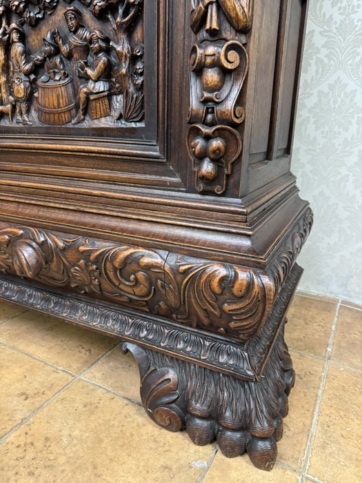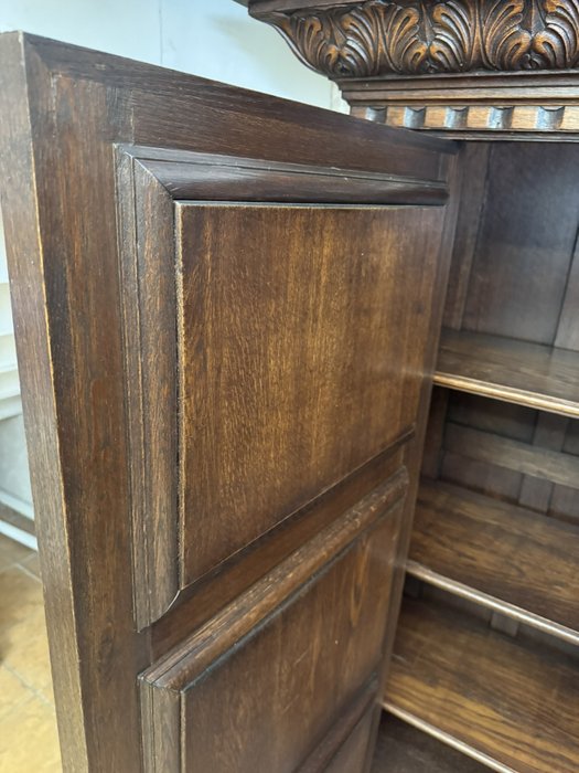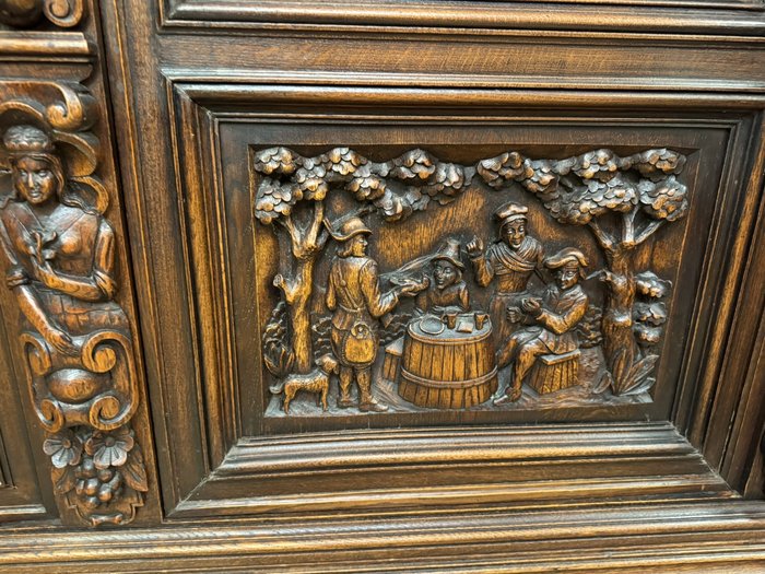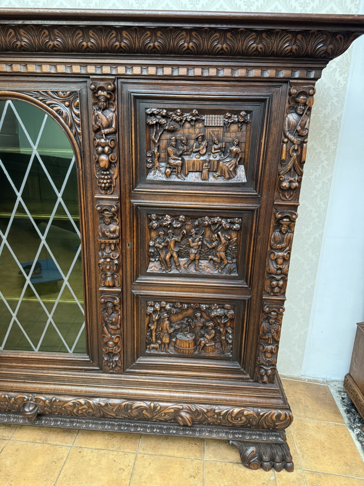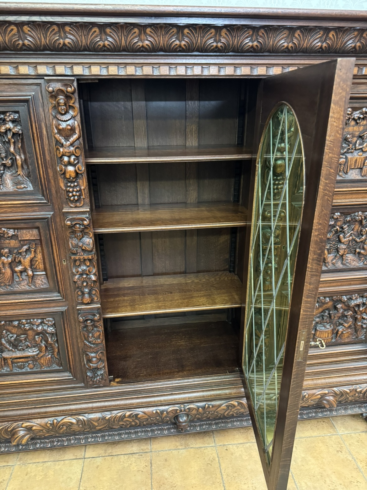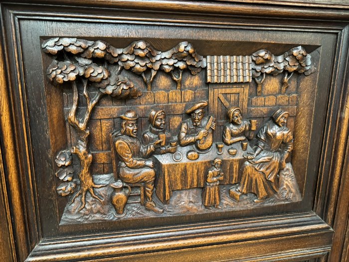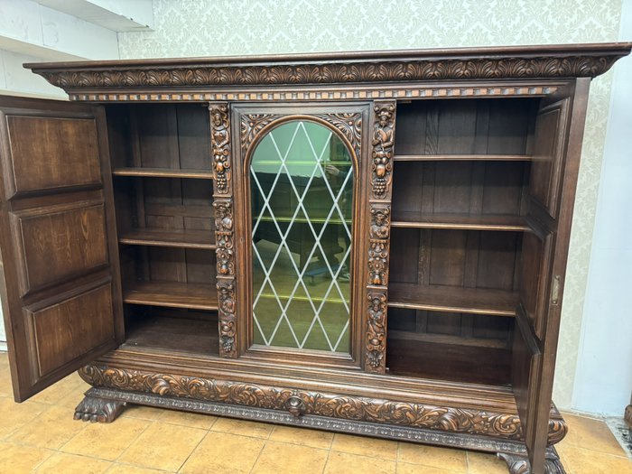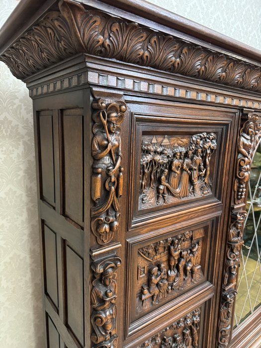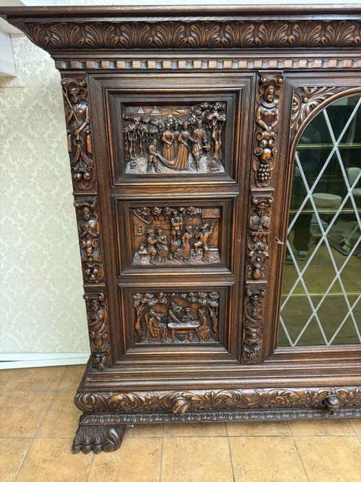 Knihovna s výraznými ručně vyřezávanými panely, zobrazujícími žánrové scény – hostiny, hudebníky a trhovce. Centrální část tvoří prosklená vitrína s olovnatým vitrážovým dekorem. Boční dvířka skrývají úložný prostor s policemi, spodní část obsahuje výsuvné zásuvky. Celý kus je rámován ornamentálním řezbářstvím, včetně motivů vinných hroznů, postav hudebníků a architektonických prvků.90 790 Kč