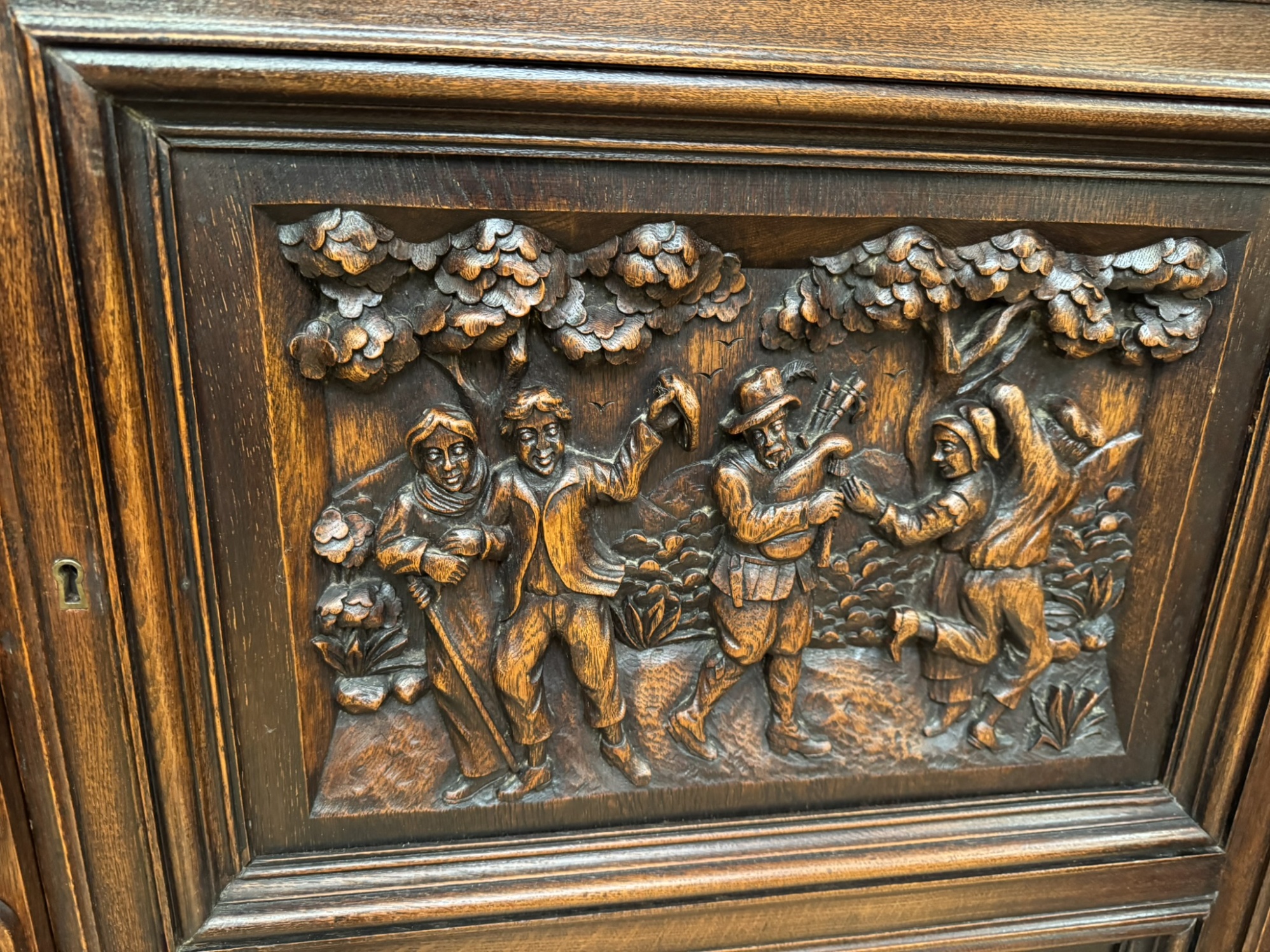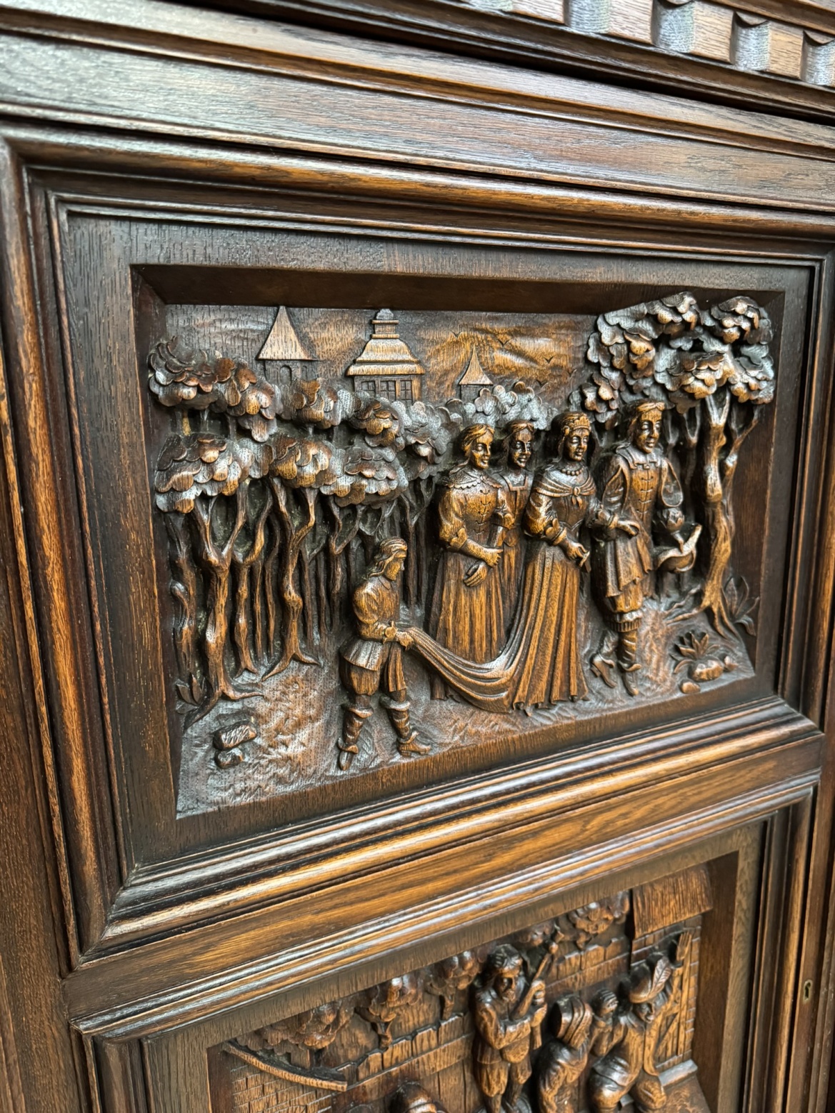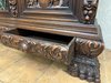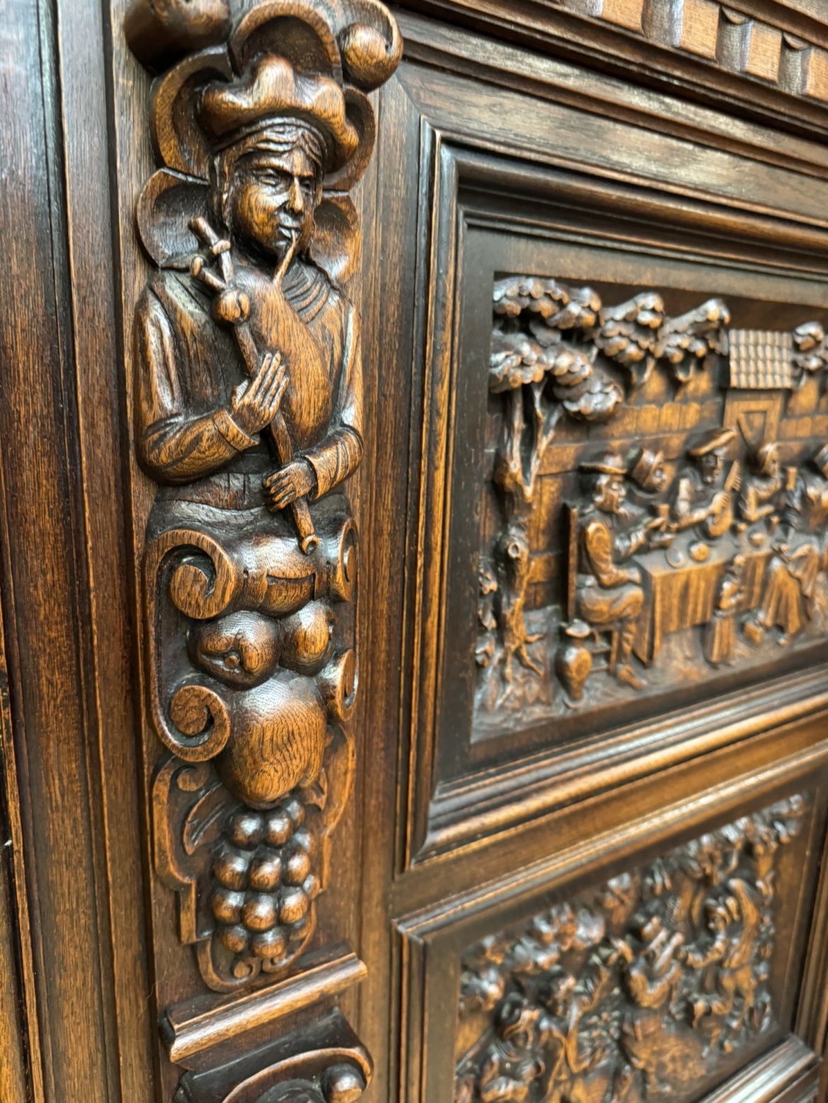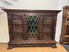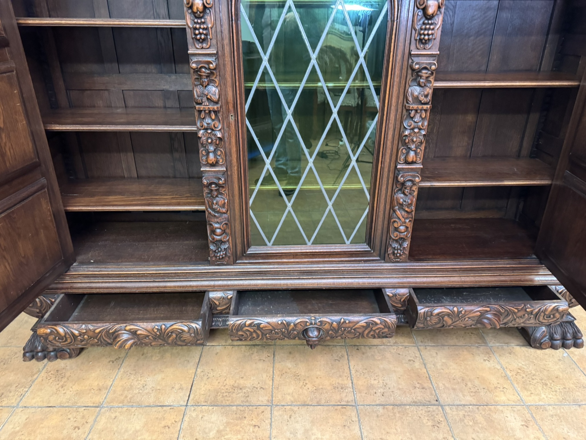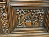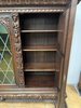 Knihovna s výraznými ručně vyřezávanými panely, zobrazujícími žánrové scény – hostiny, hudebníky a trhovce. Centrální část tvoří prosklená vitrína s olovnatým vitrážovým dekorem. Boční dvířka skrývají úložný prostor s policemi, spodní část obsahuje výsuvné zásuvky. Celý kus je rámován ornamentálním řezbářstvím, včetně motivů vinných hroznů, postav hudebníků a architektonických prvků.90 790 Kč