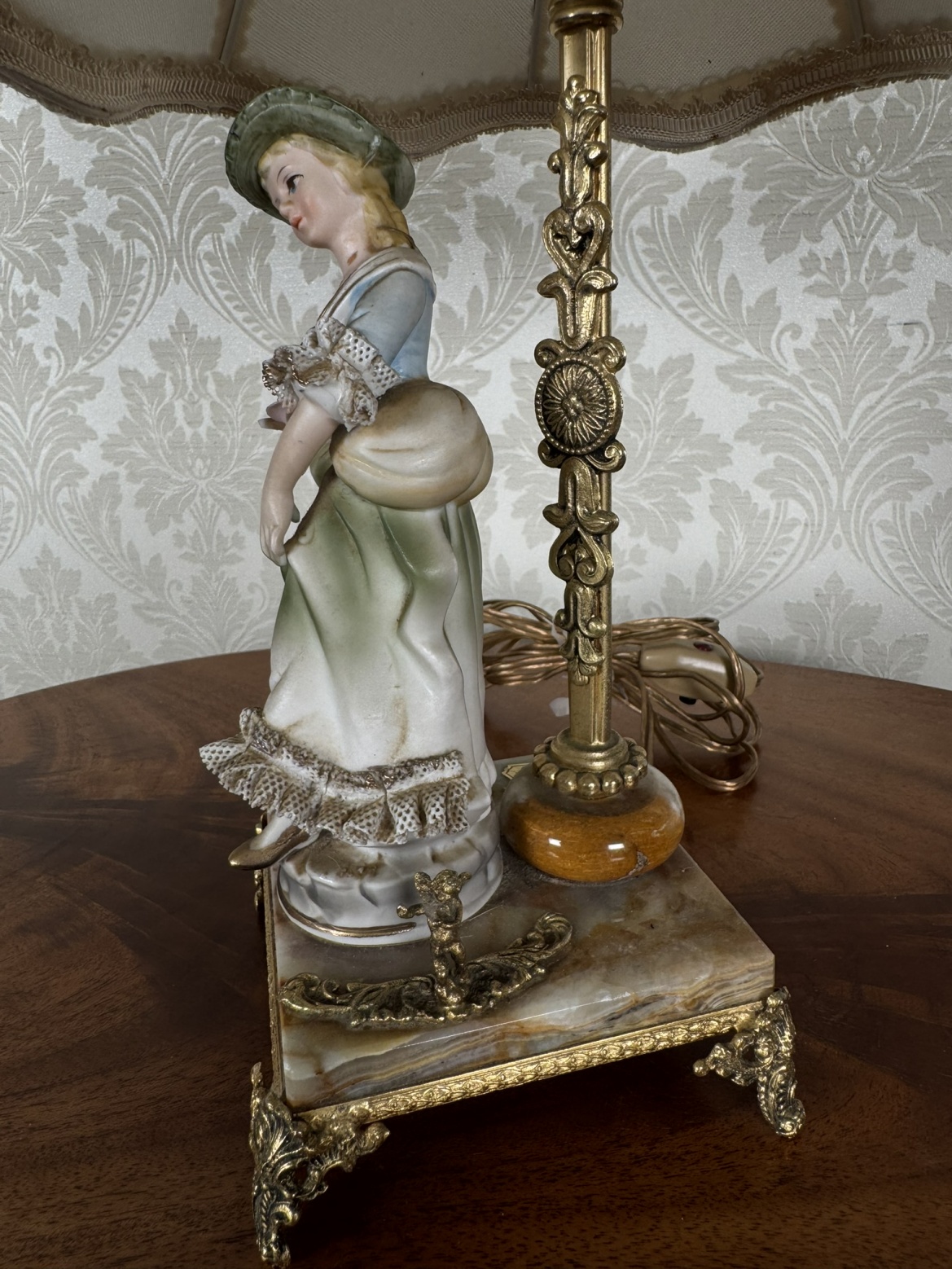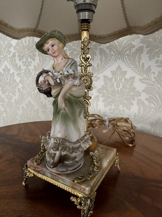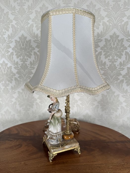stolní lampa s porcelánovou figurkou dívky v klobouku, držící košík s květinami. Podstavec z leštěného onyxu doplňují bohatě zdobené mosazné prvky a plasticky tvarované nožky. Kombinace jemné malby a textilních detailů vytváří elegantní celek.3 480 Kč