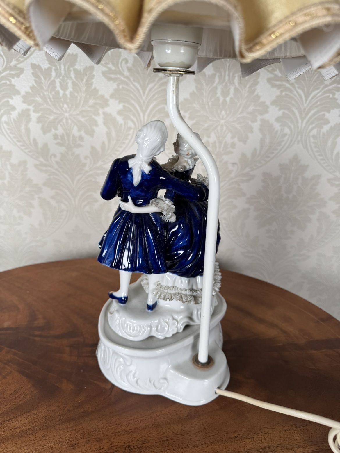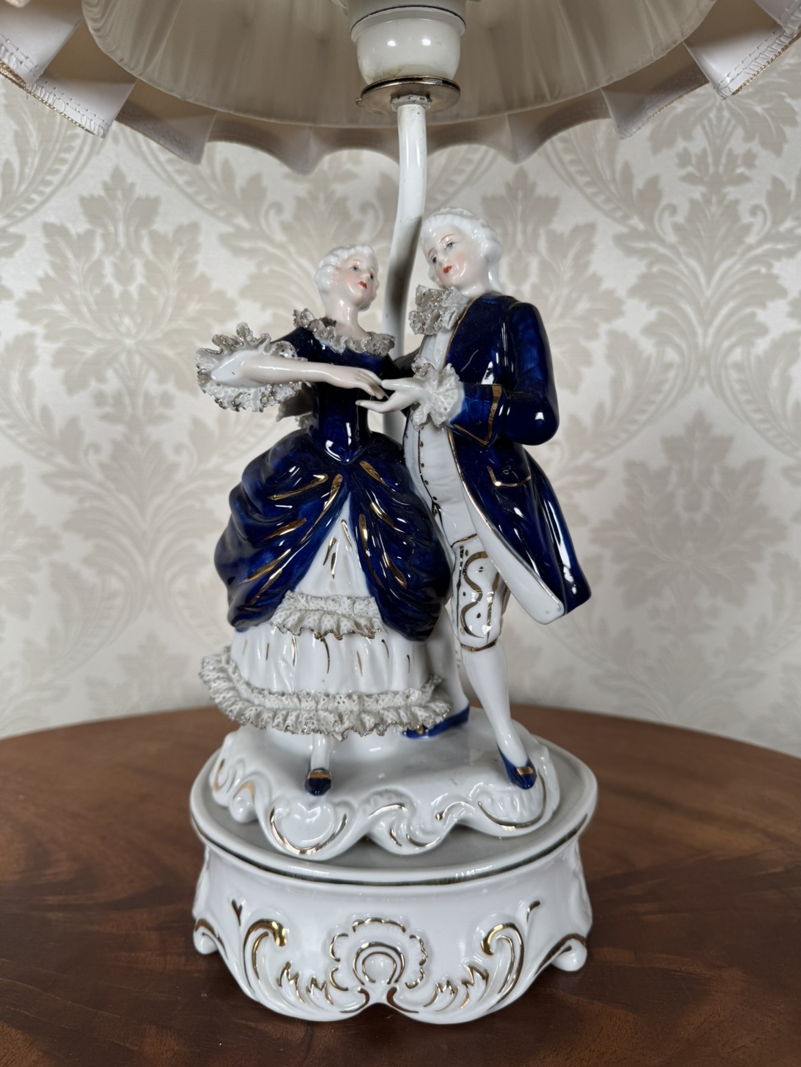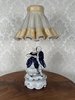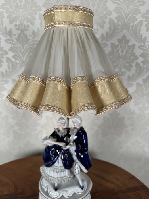 Stolní lampa s figurální porcelánovou základnou, znázorňující galantní pár v bohatě zdobených oděvech. Postavy s lesklou kobaltovou glazurou stojí na plastickém podstavci, doplněném textilním stínidlem ve zvonovém tvaru s lemováním.3 250 Kč