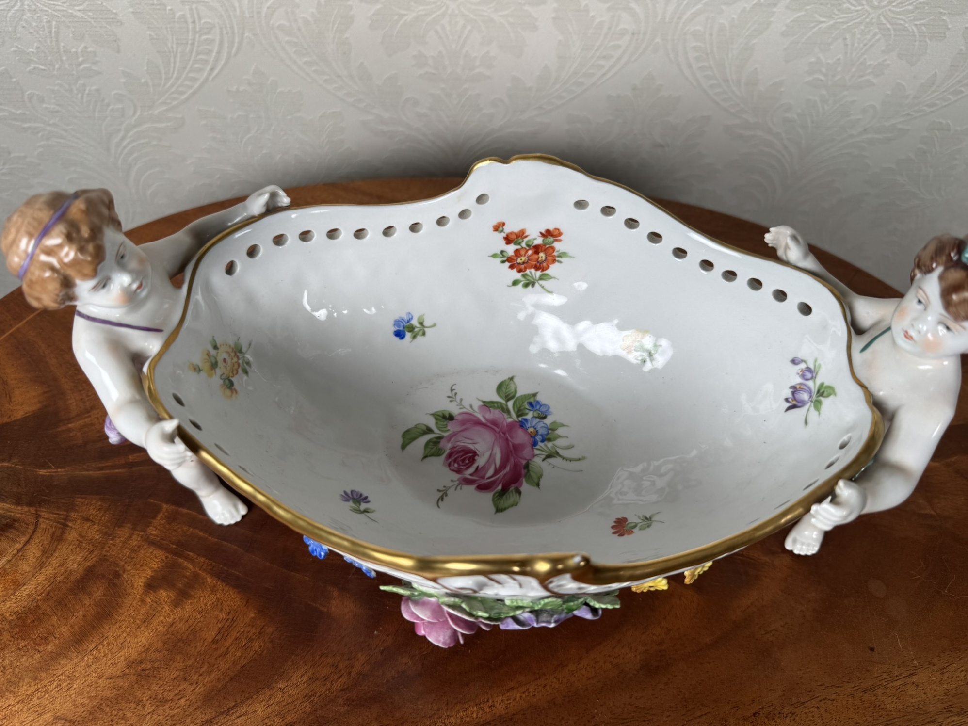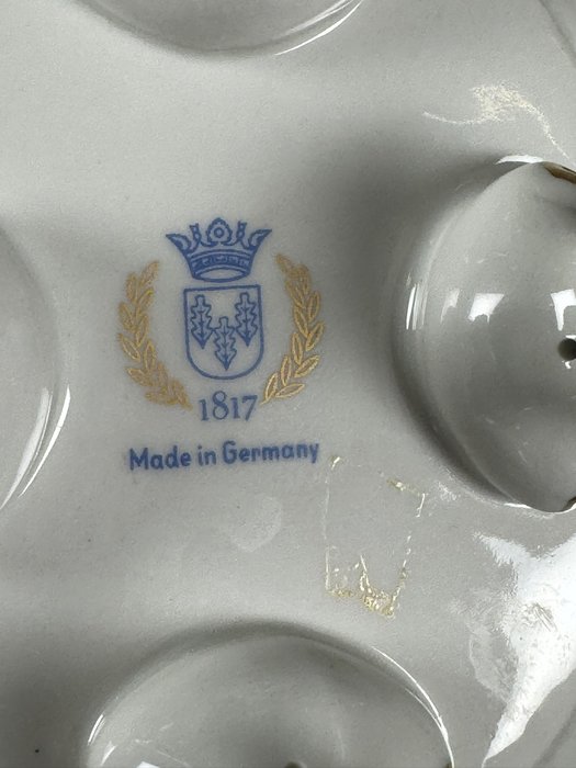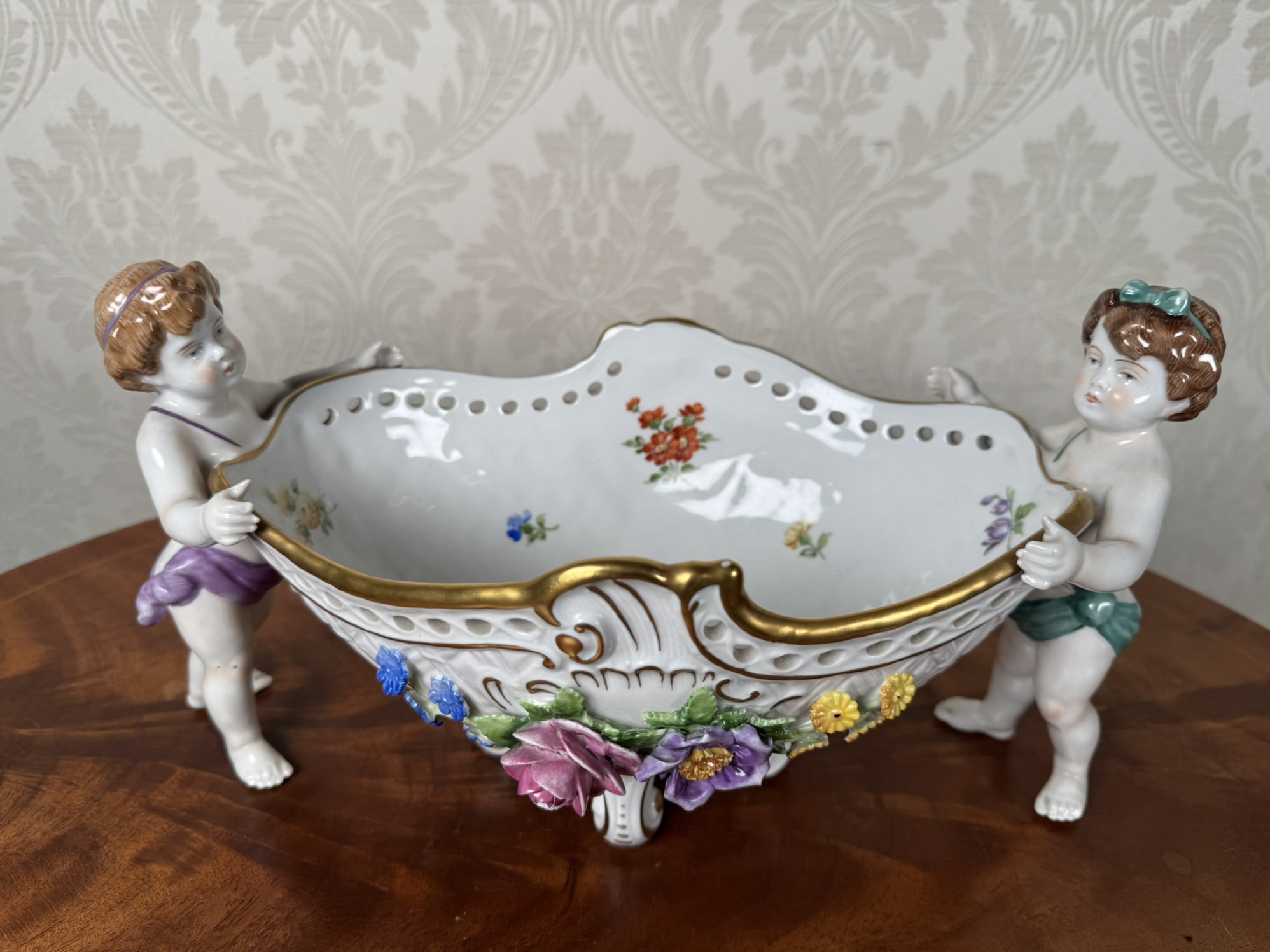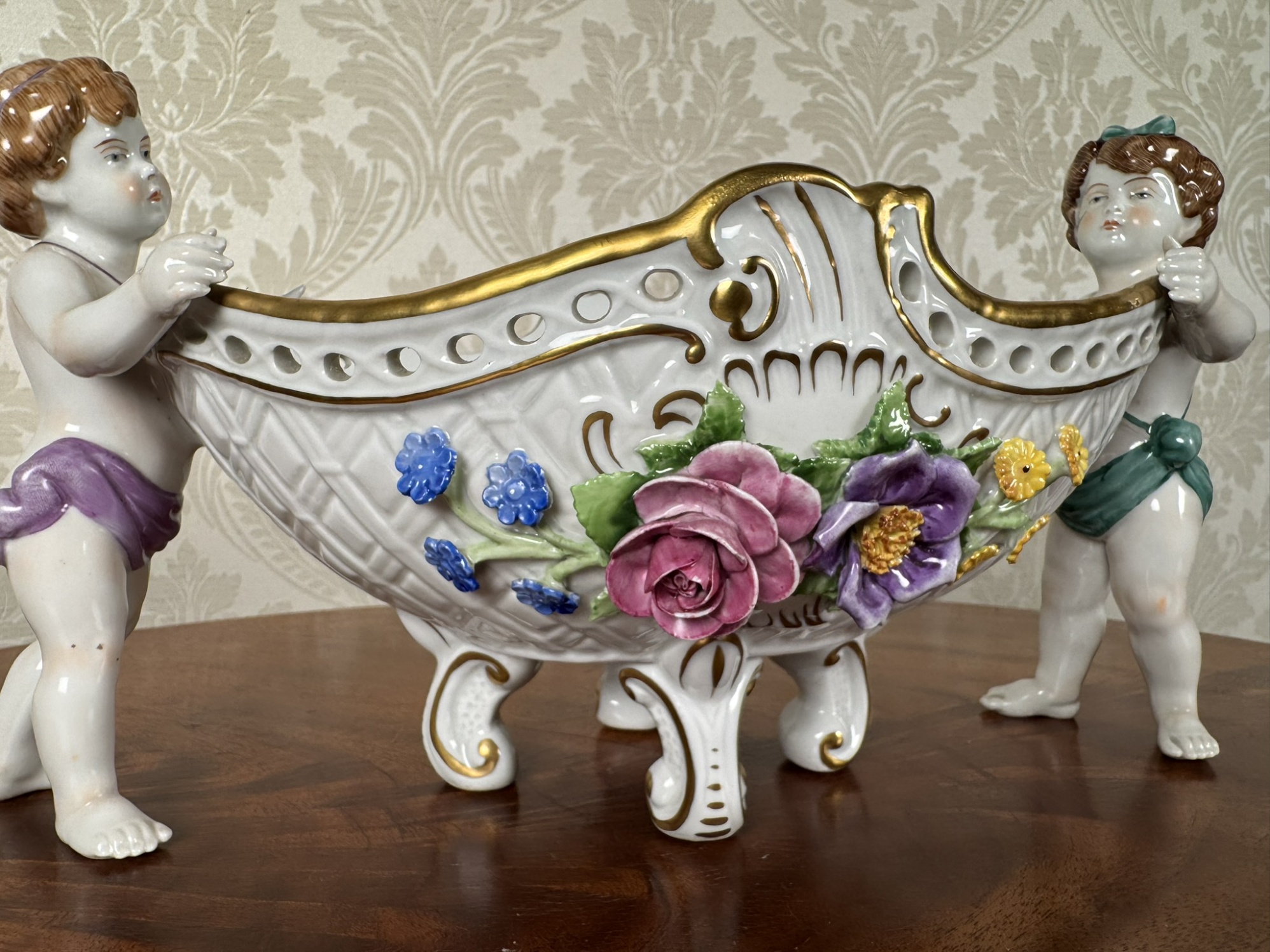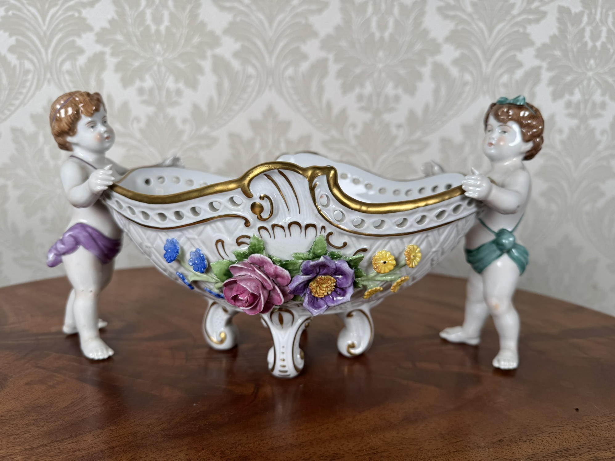 Tato dekorativní porcelánová mísa z manufaktury Rudolstadt je mistrovským příkladem německé porcelánové tvorby. Ozdobena je dvěma postavami andílků, nesoucích propracovanou nádobu s květinovými dekoracemi v reliéfu. Vnitřní strana mísy je rovněž zdobena květinovými motivy. Spodní značení „Made in Germany“ s datem 1817 poukazuje na tradici výrobce.3 850 Kč