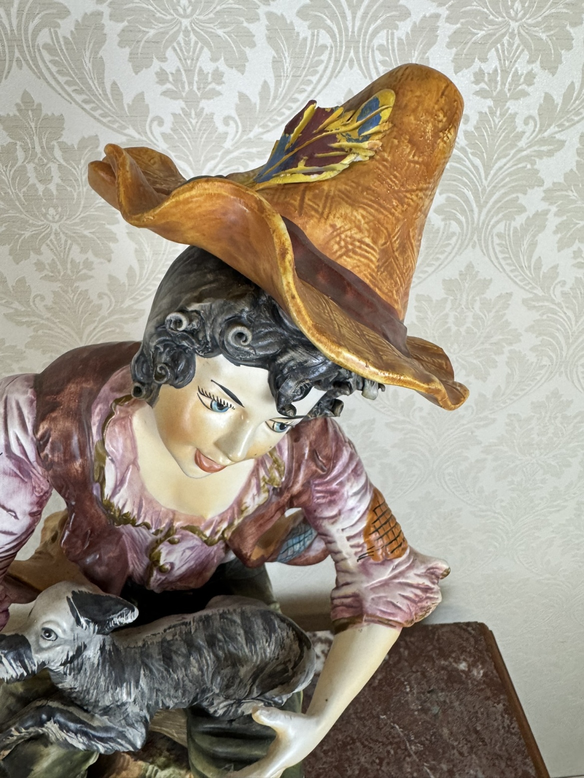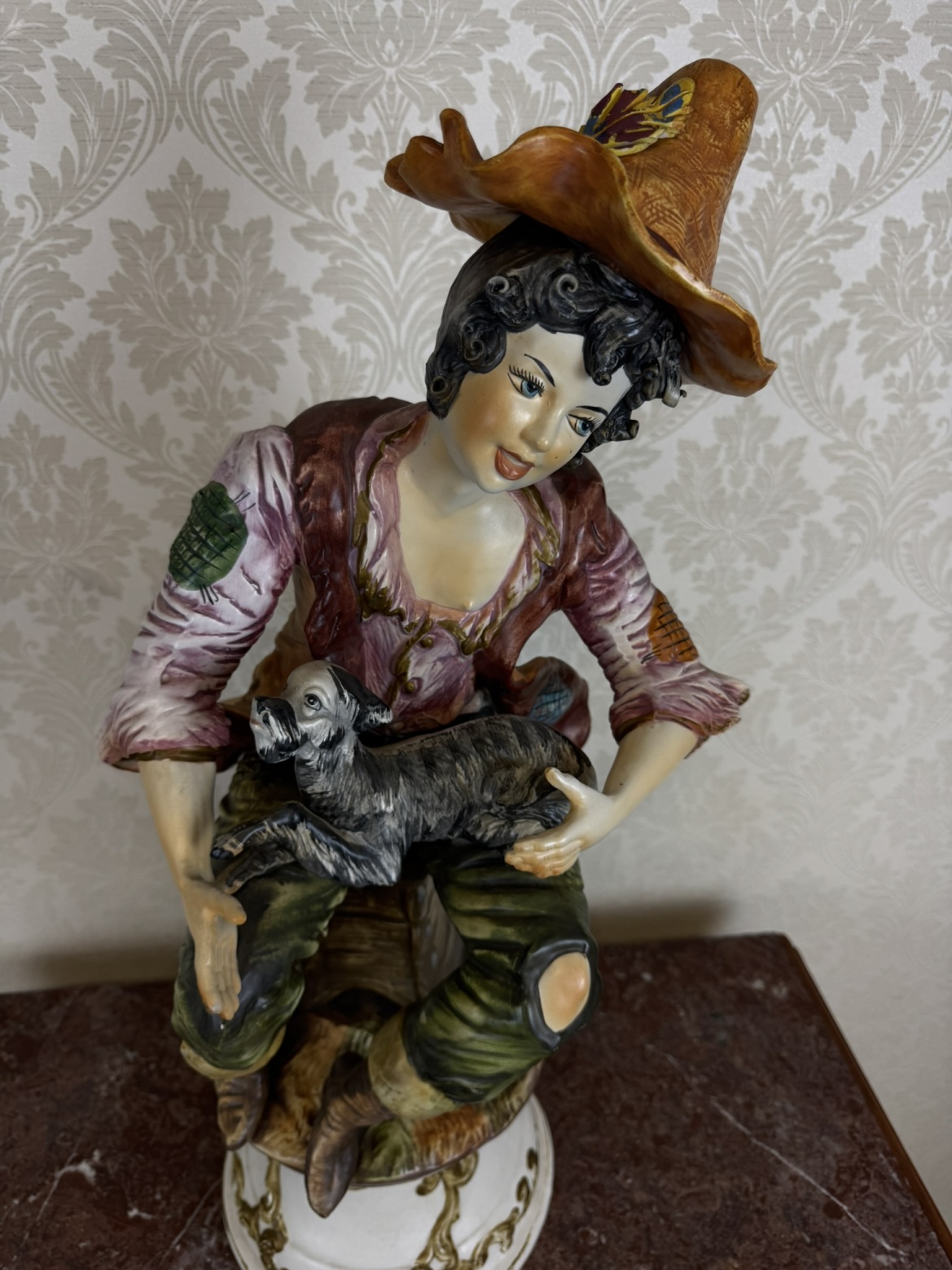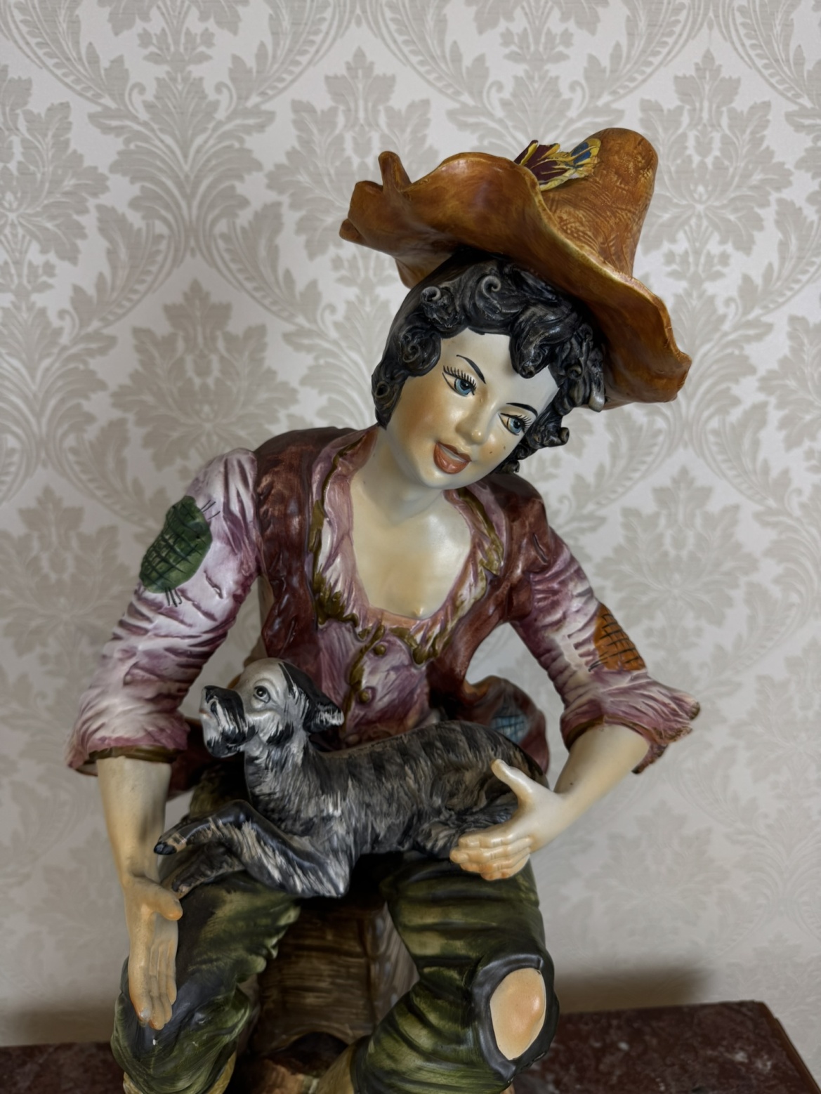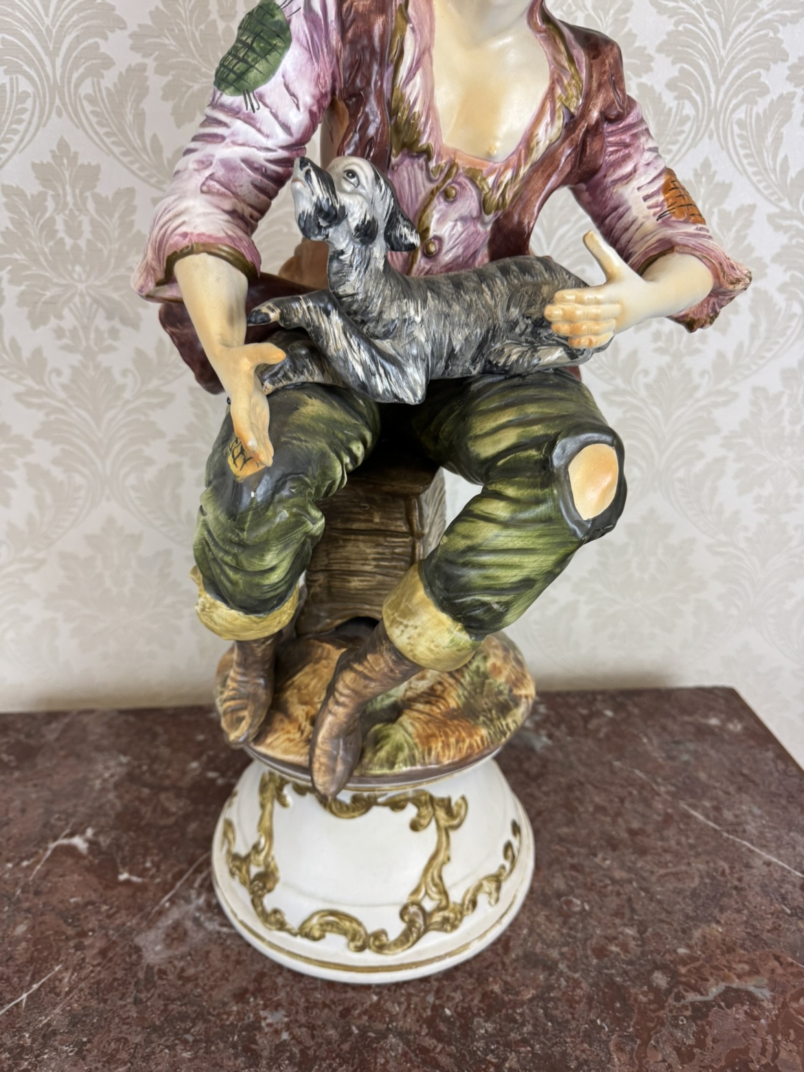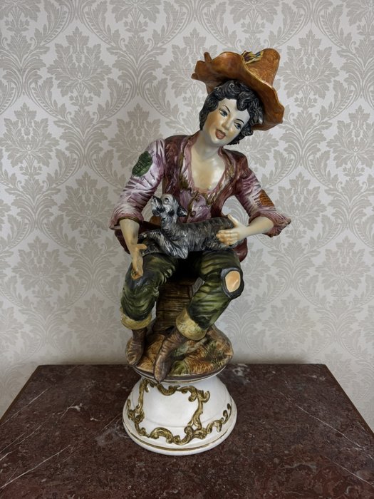 Barevně glazovaná soška zachycuje sedícího chlapce v rozhalené košili, vestě a klobouku se širokou krempou, jak na klíně drží malého psa. Postava sedí na dřevěné stoličce umístěném na zdobeném kruhovém podstavci s plastickým ornamentem ve zlatém tónu.3 280 Kč
