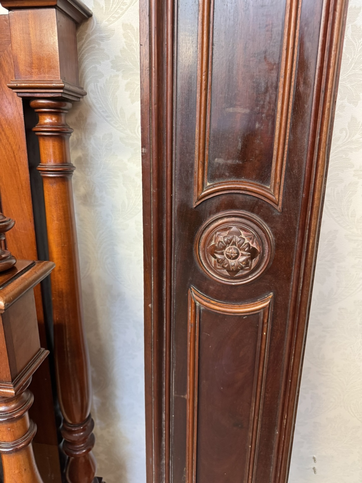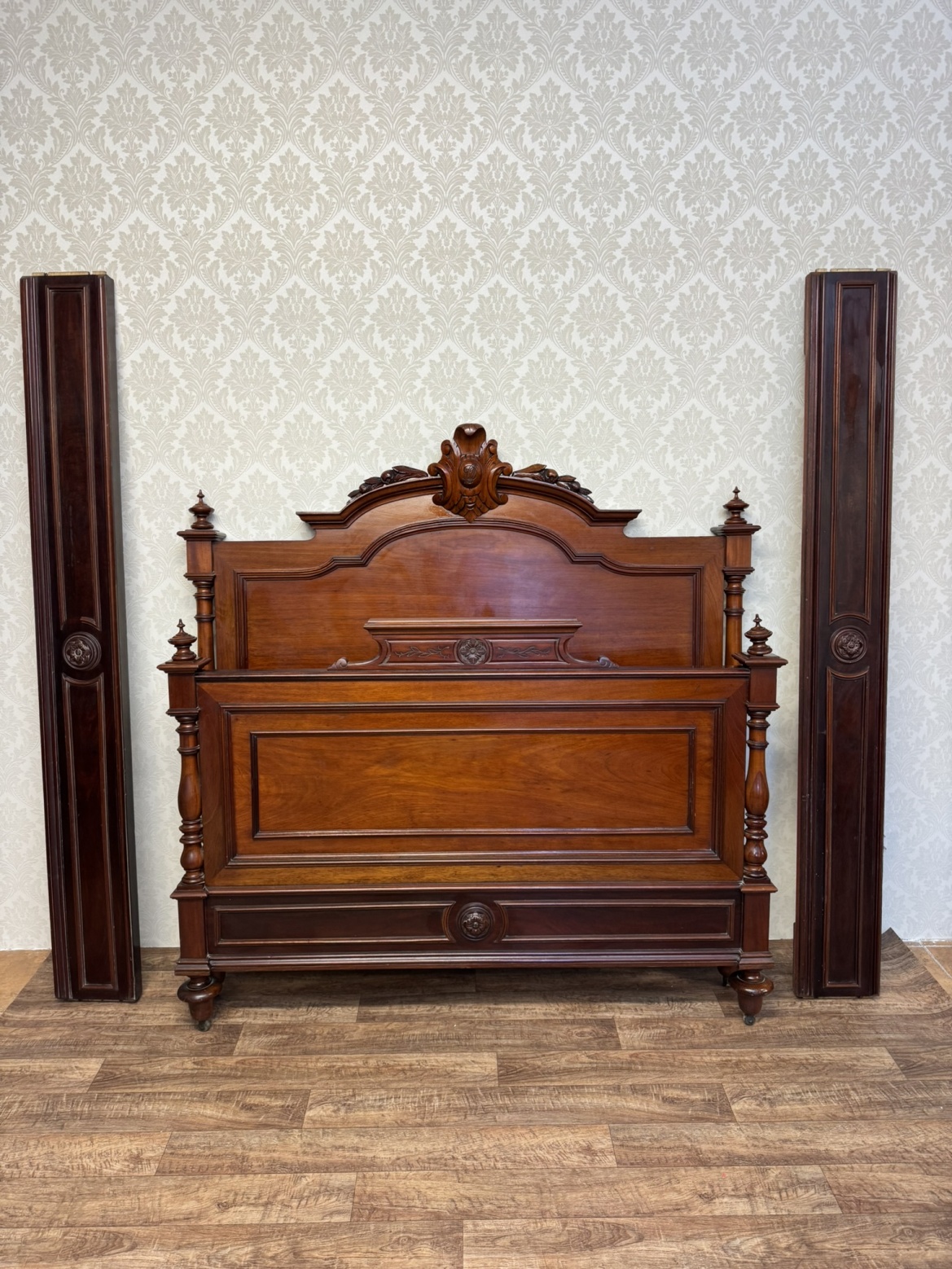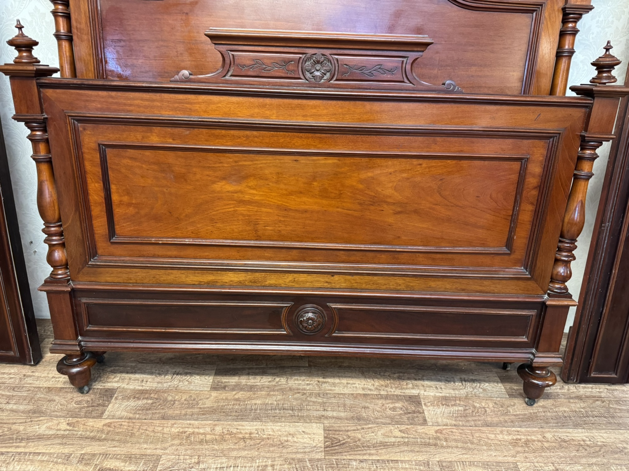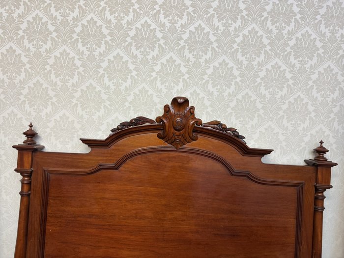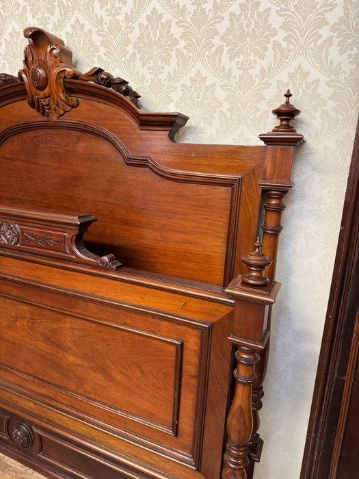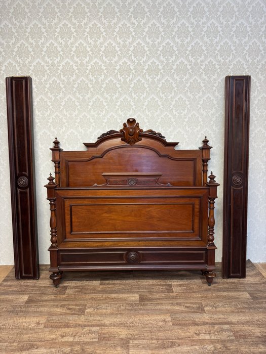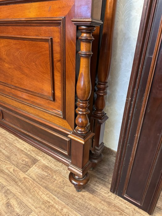 Postel z ořechového dřeva s klasickými sloupky a řezbou