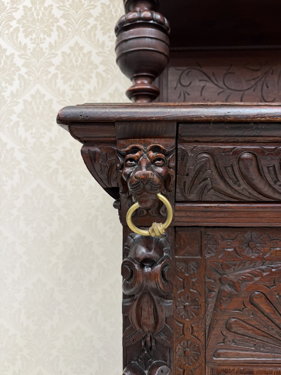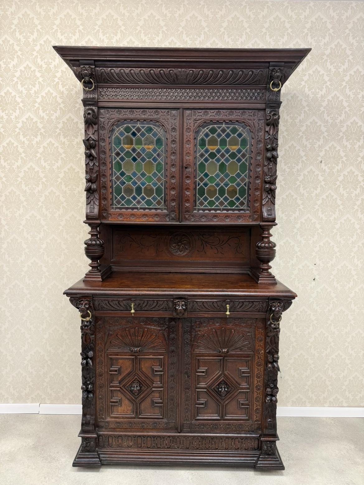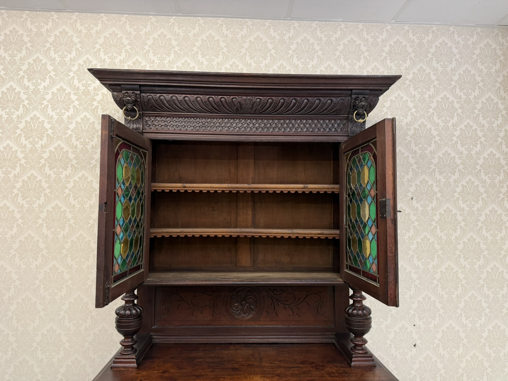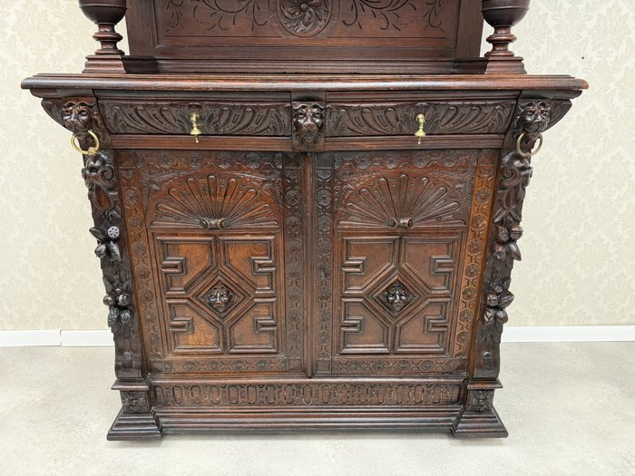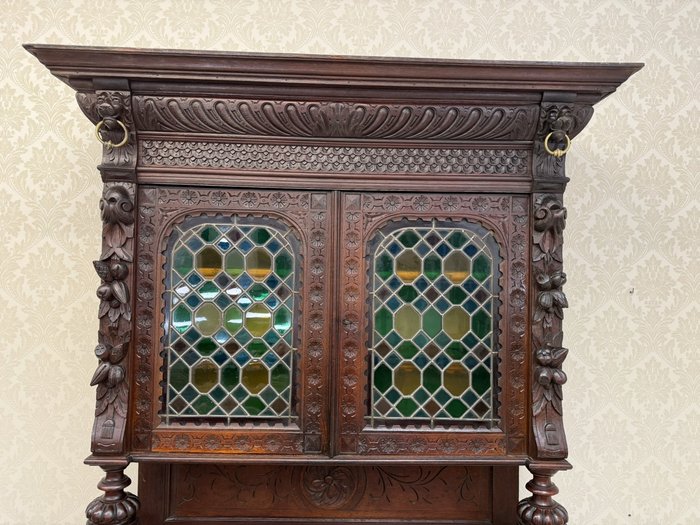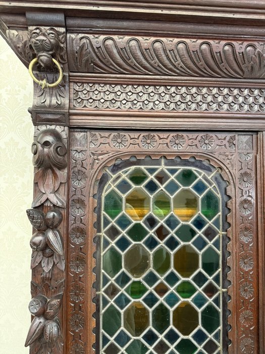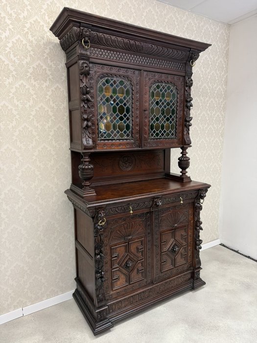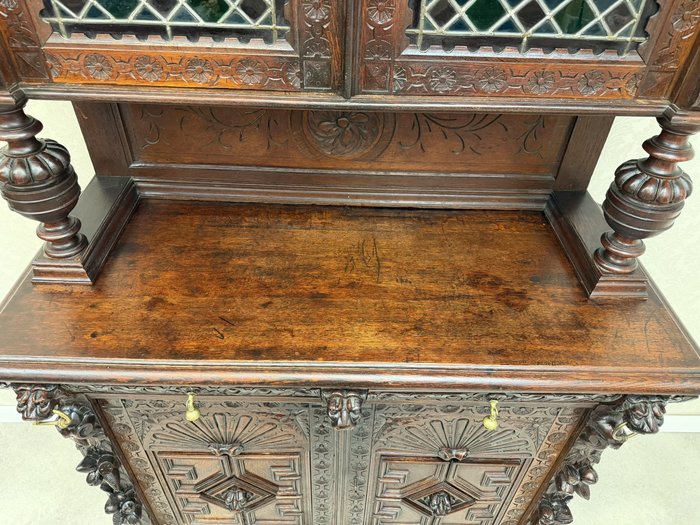 Příborník s horními dvířky osazenými vitrážovým sklem v olověné mřížce. Čelní strany zdobí lví hlavy, akantové motivy a florální řezby. Spodní skříňka s profilovanými dvířky a vnitřními policemi. Celek evokuje dekorativní bohatství pozdní renesance.
