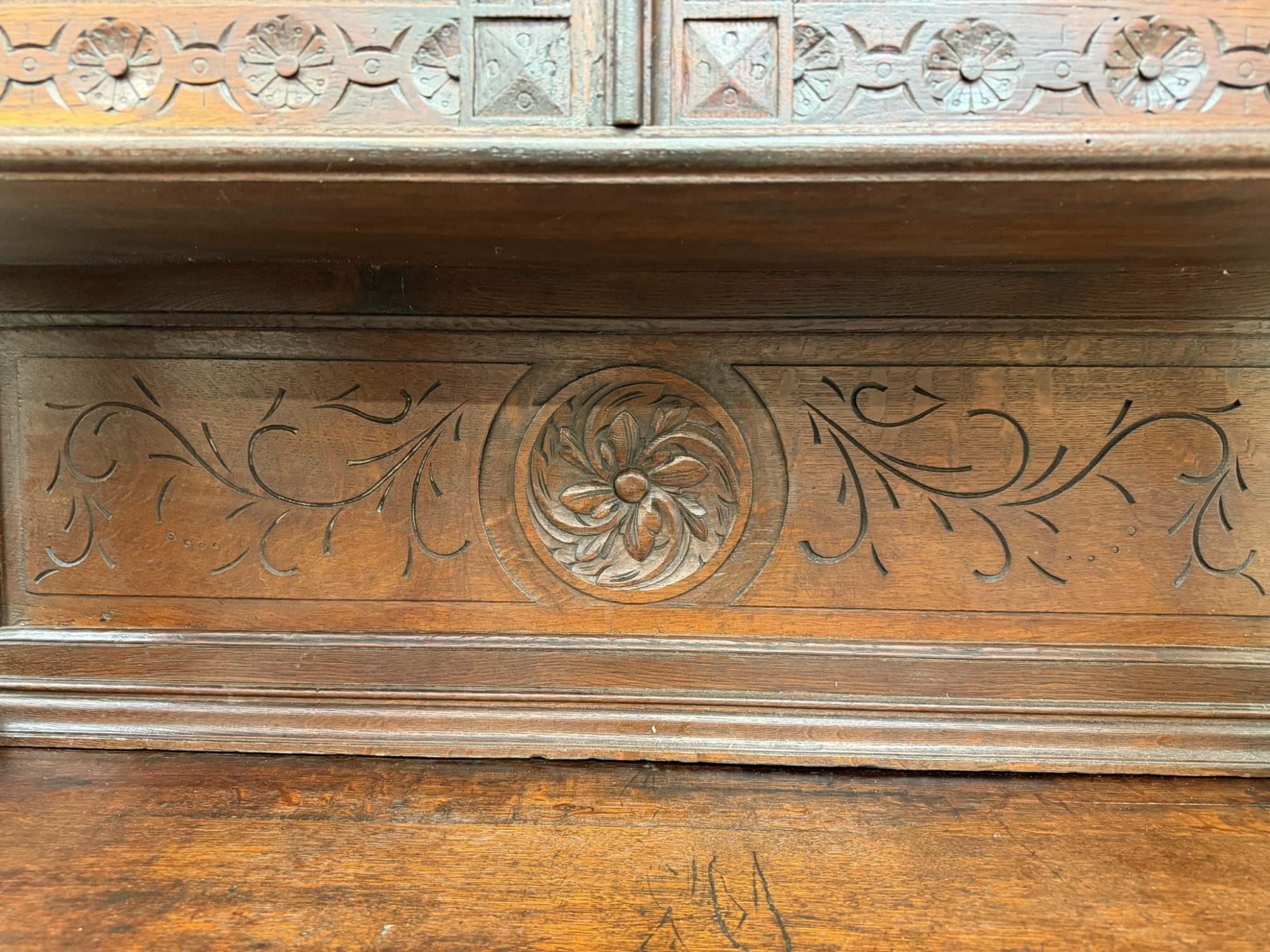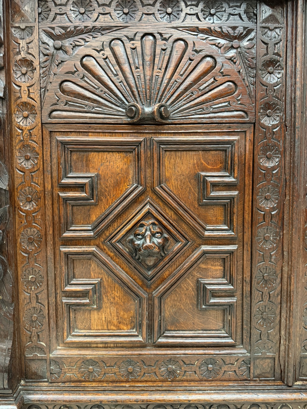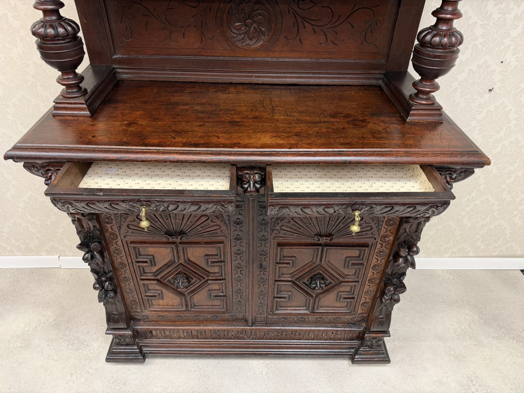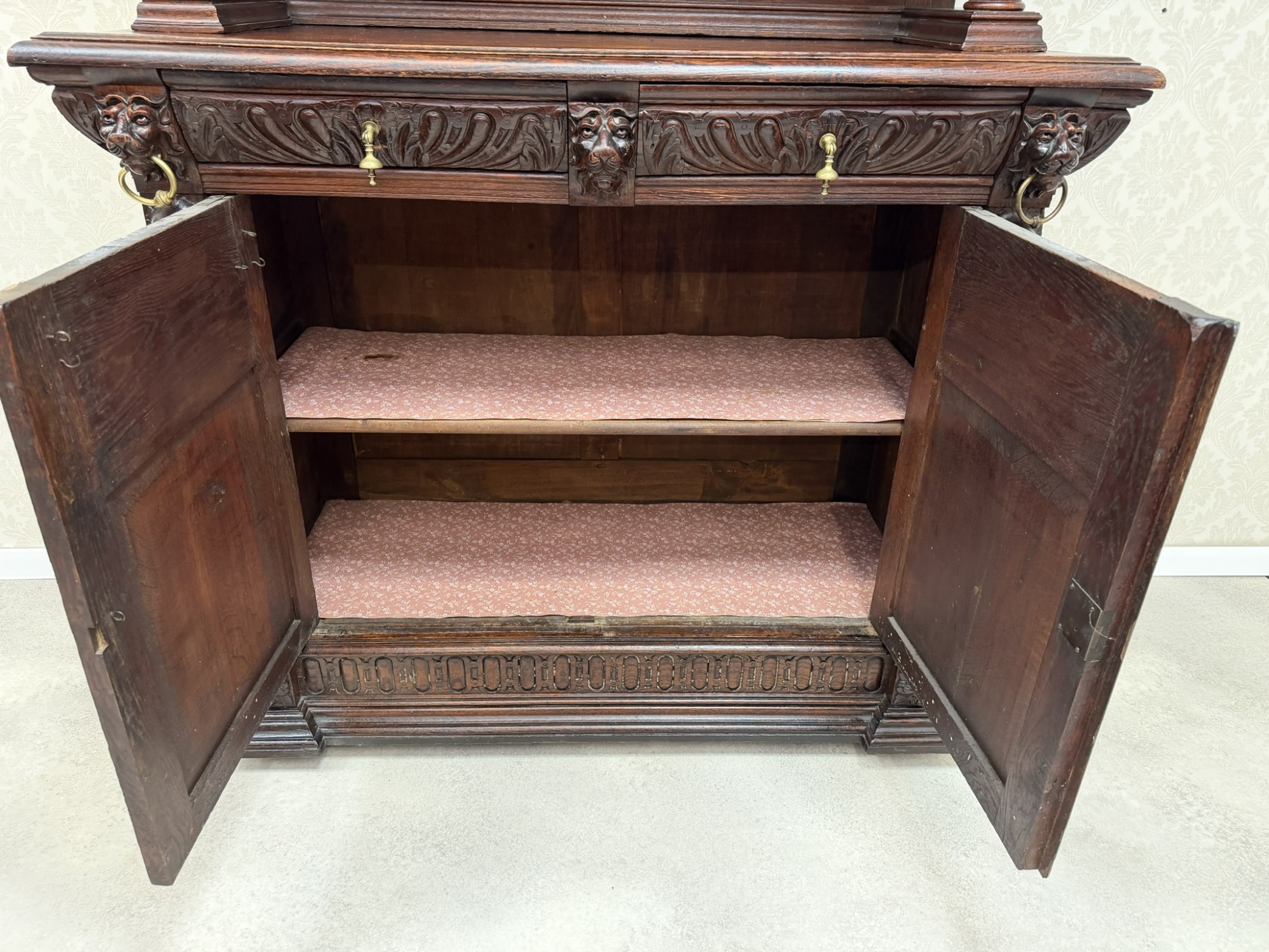 Příborník s horními dvířky osazenými vitrážovým sklem v olověné mřížce. Čelní strany zdobí lví hlavy, akantové motivy a florální řezby. Spodní skříňka s profilovanými dvířky a vnitřními policemi. Celek evokuje dekorativní bohatství pozdní renesance.