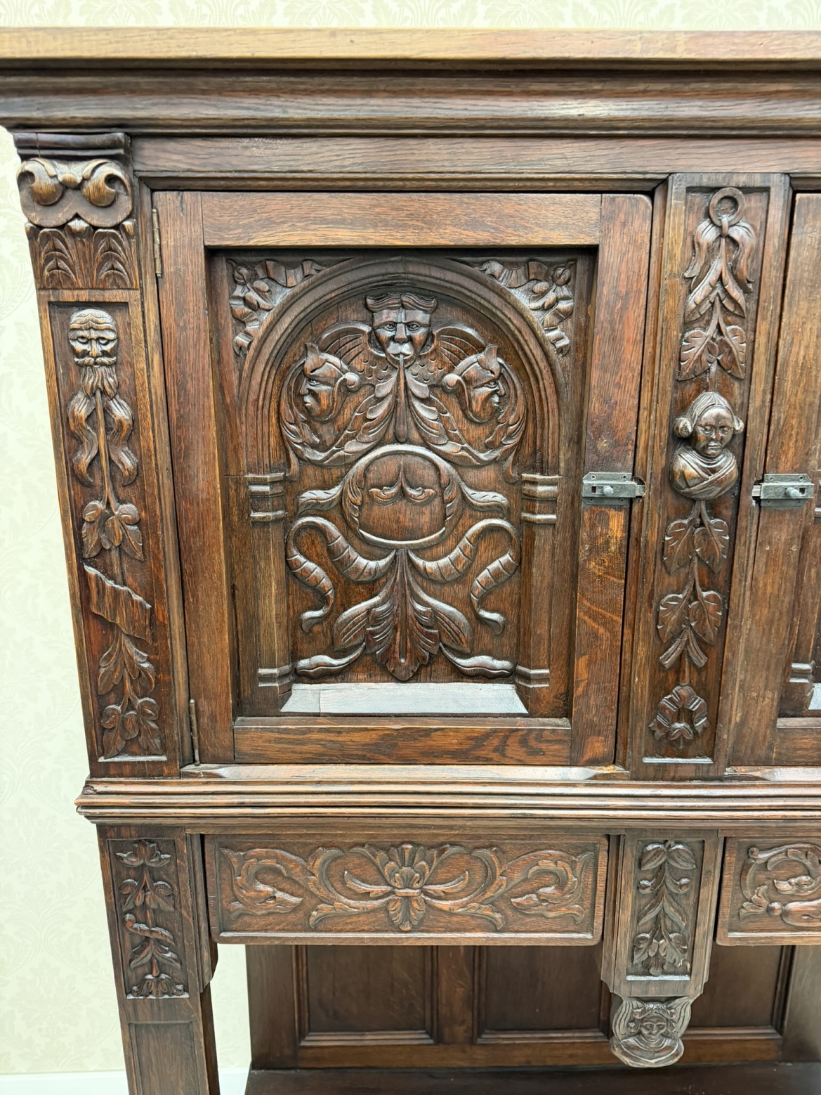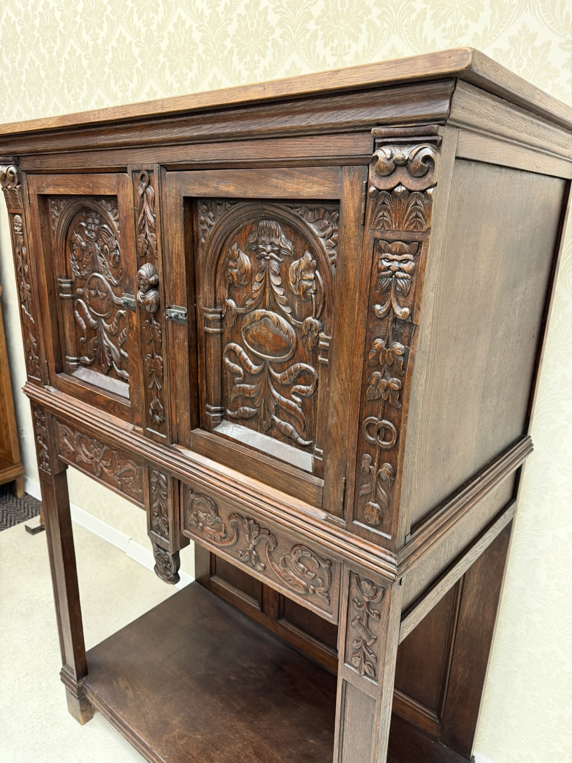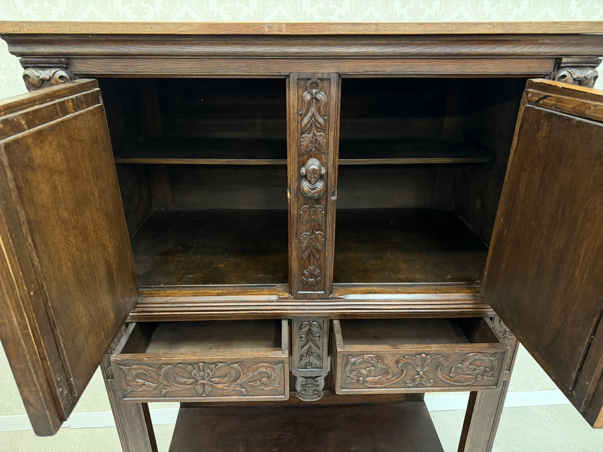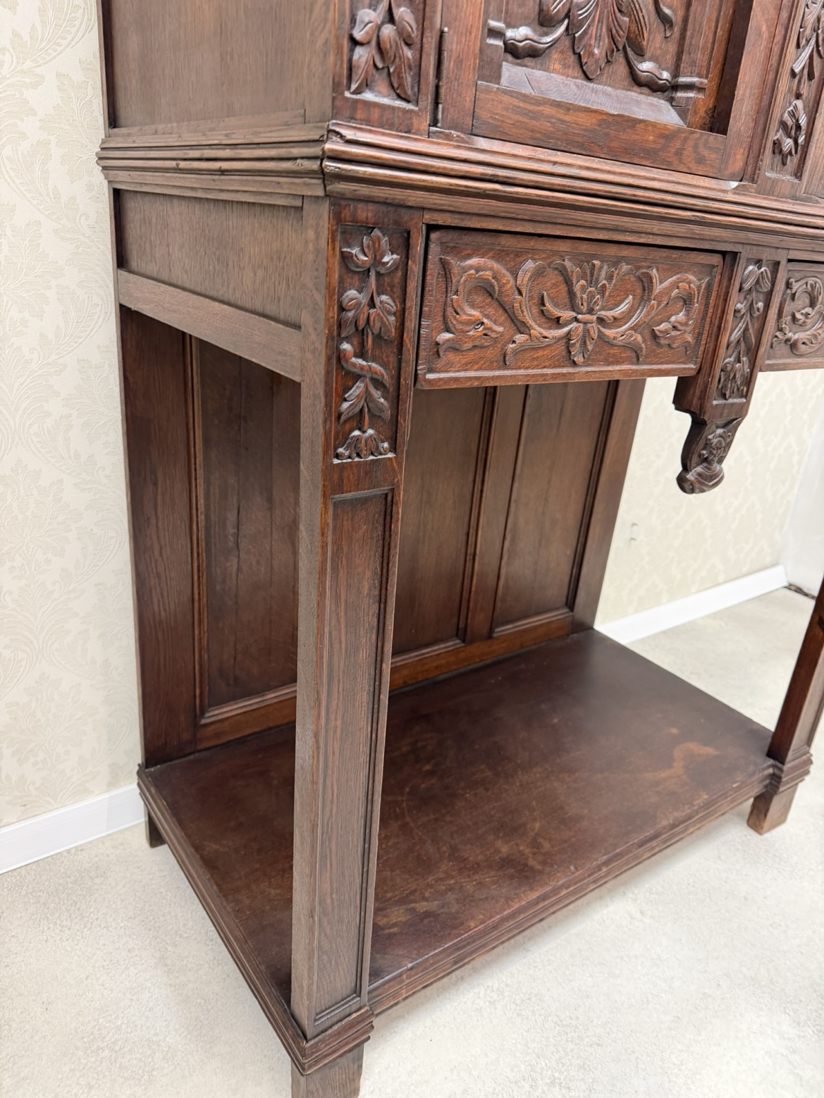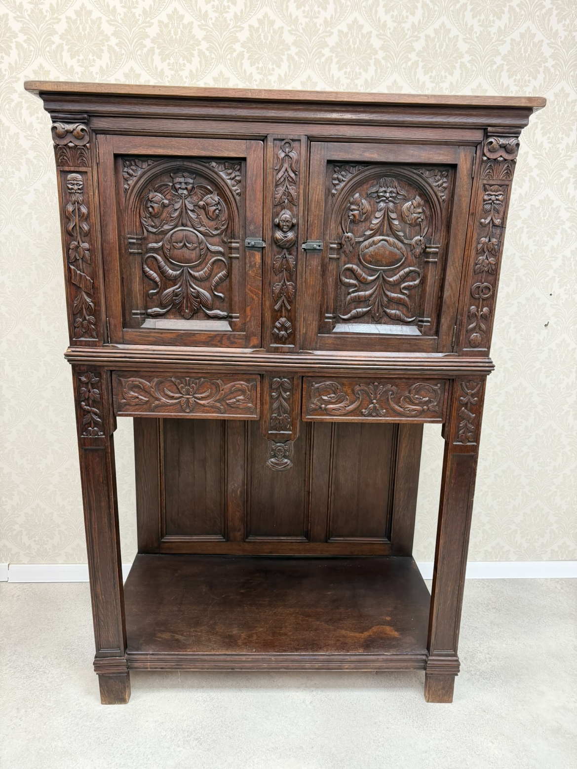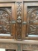 Příbornice z tmavého dřeva s dekorativními dveřními výplněmi ve tvaru stylizovaných oblouků, obličejovými detaily a bohatou florální řezbou na sloupcích i zásuvkách. Horní část slouží jako skříňka, spodní je otevřená s hlubokou policí.10 890 Kč