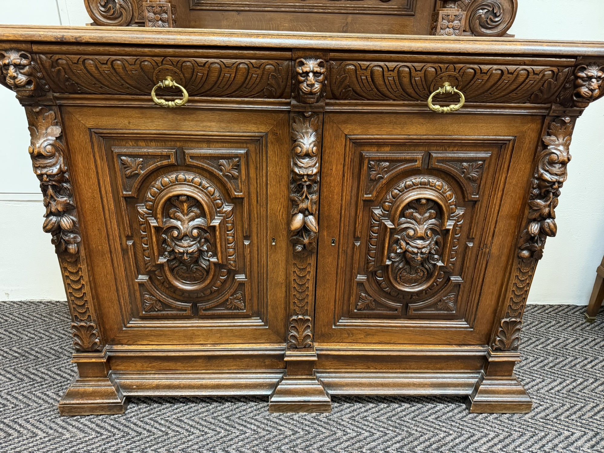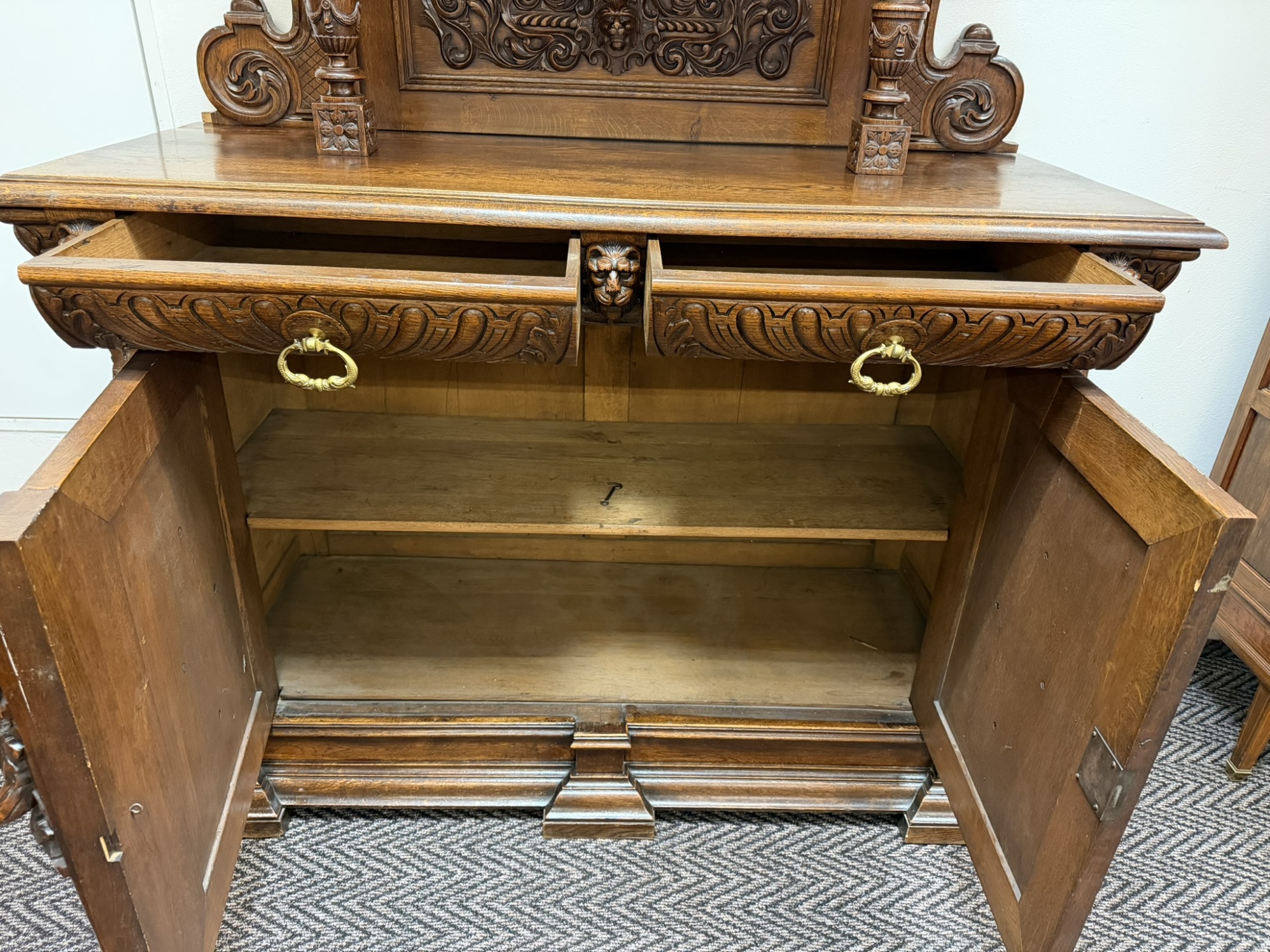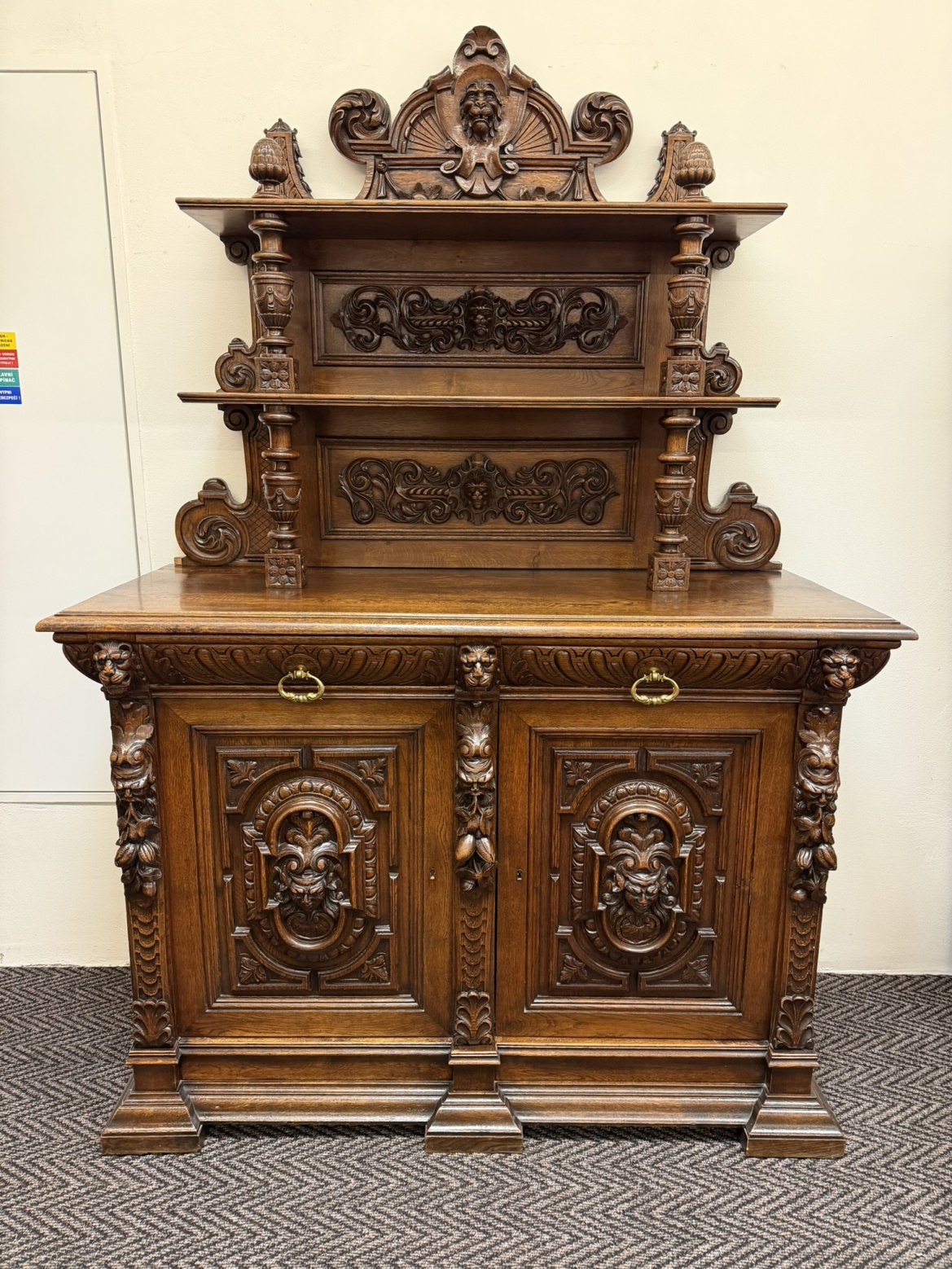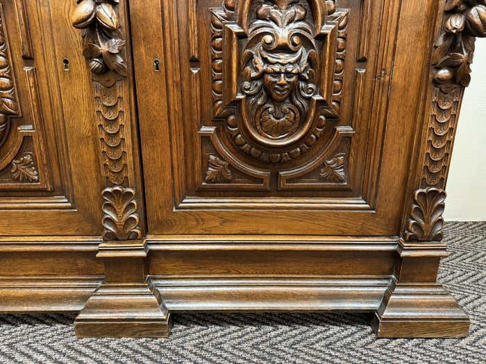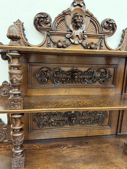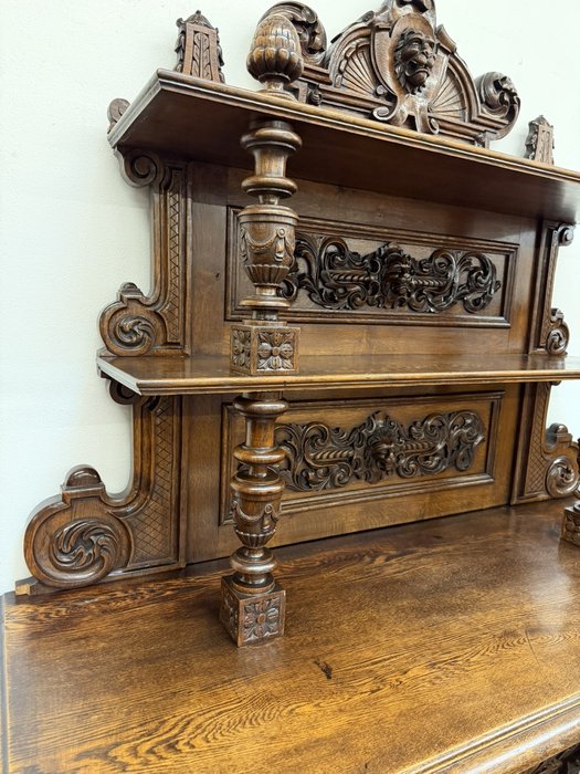 Příborník s bohatě členěnou nástavbou, dvěma zásuvkami a dvířky zdobenými reliéfními hlavami, florálními motivy a dekorativní lví maskou v nástavci. Sloupky, volutové prvky a řezba čerpají z renesančních vzorů, celek působí dekorativně a slavnostně.29 850 Kč