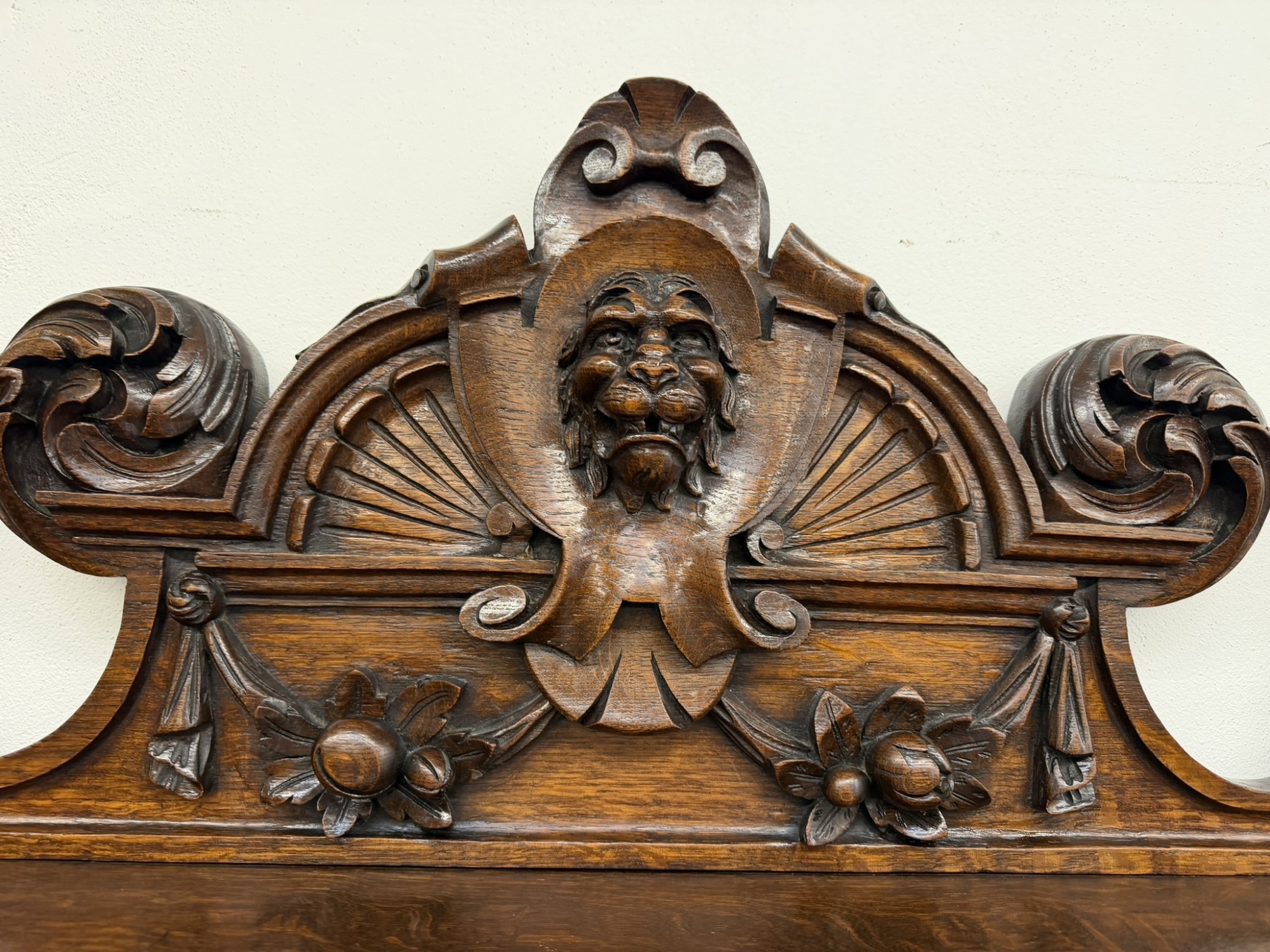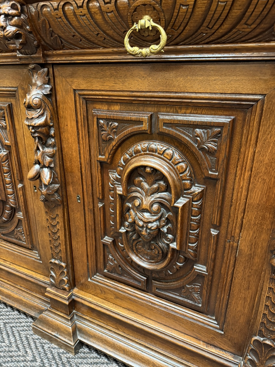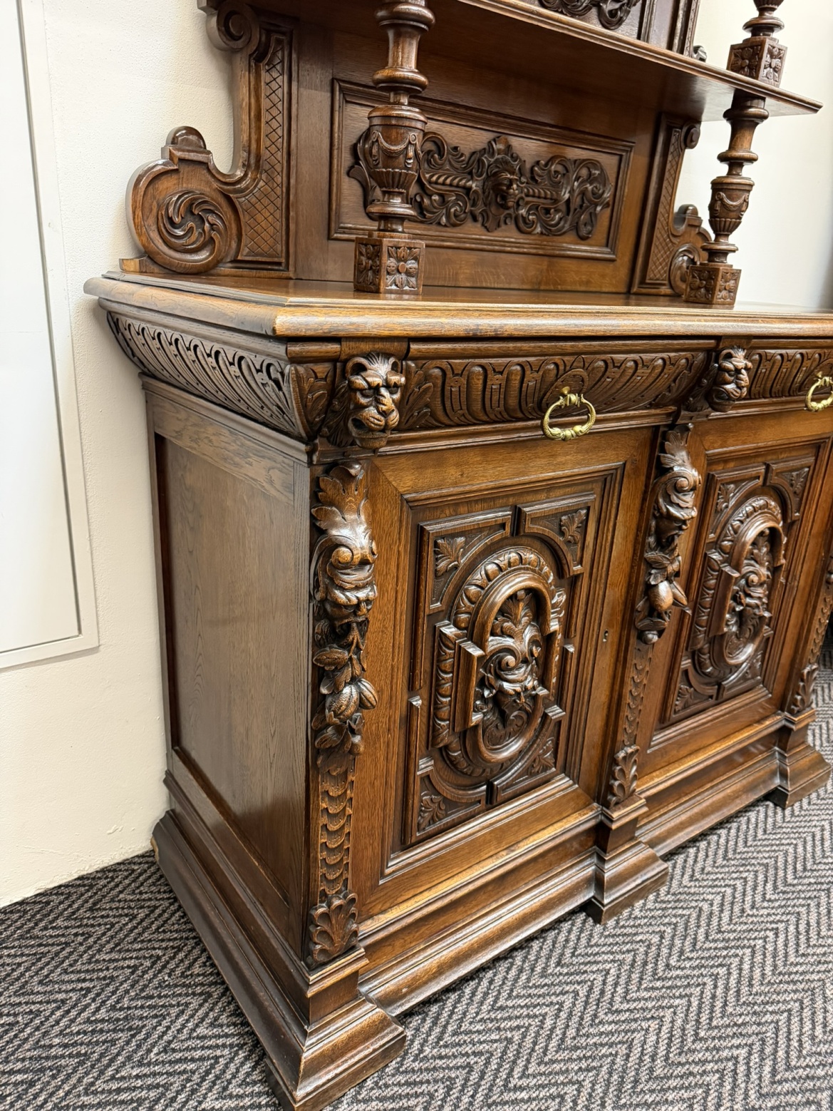 Příborník s bohatě členěnou nástavbou, dvěma zásuvkami a dvířky zdobenými reliéfními hlavami, florálními motivy a dekorativní lví maskou v nástavci. Sloupky, volutové prvky a řezba čerpají z renesančních vzorů, celek působí dekorativně a slavnostně.29 850 Kč