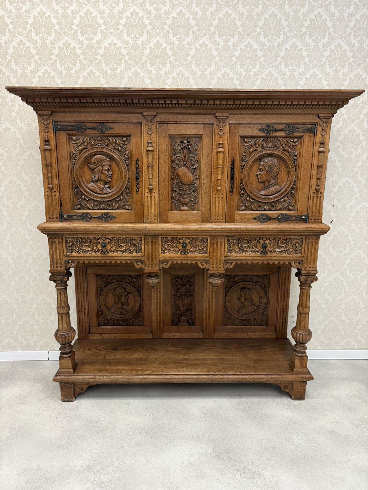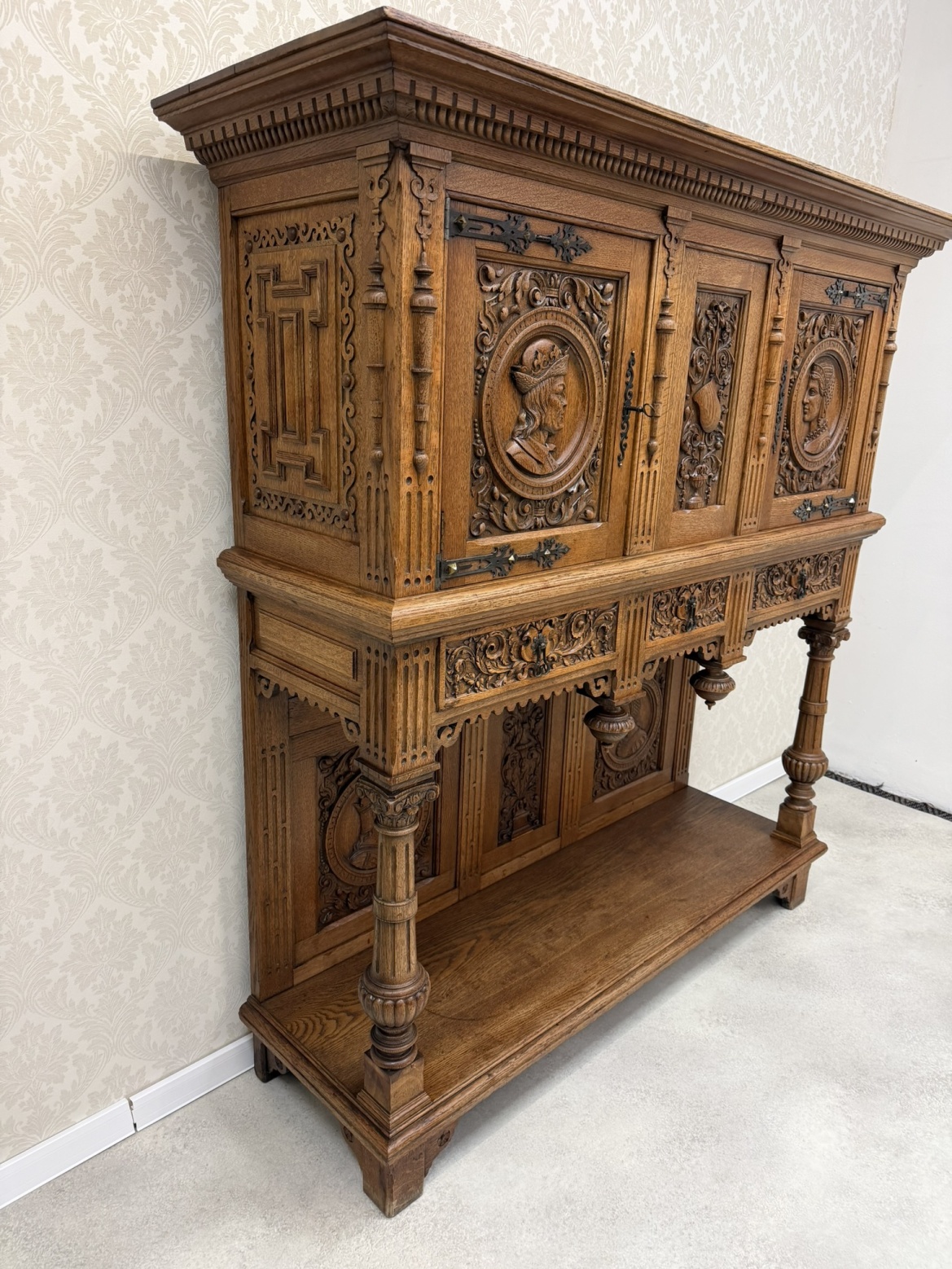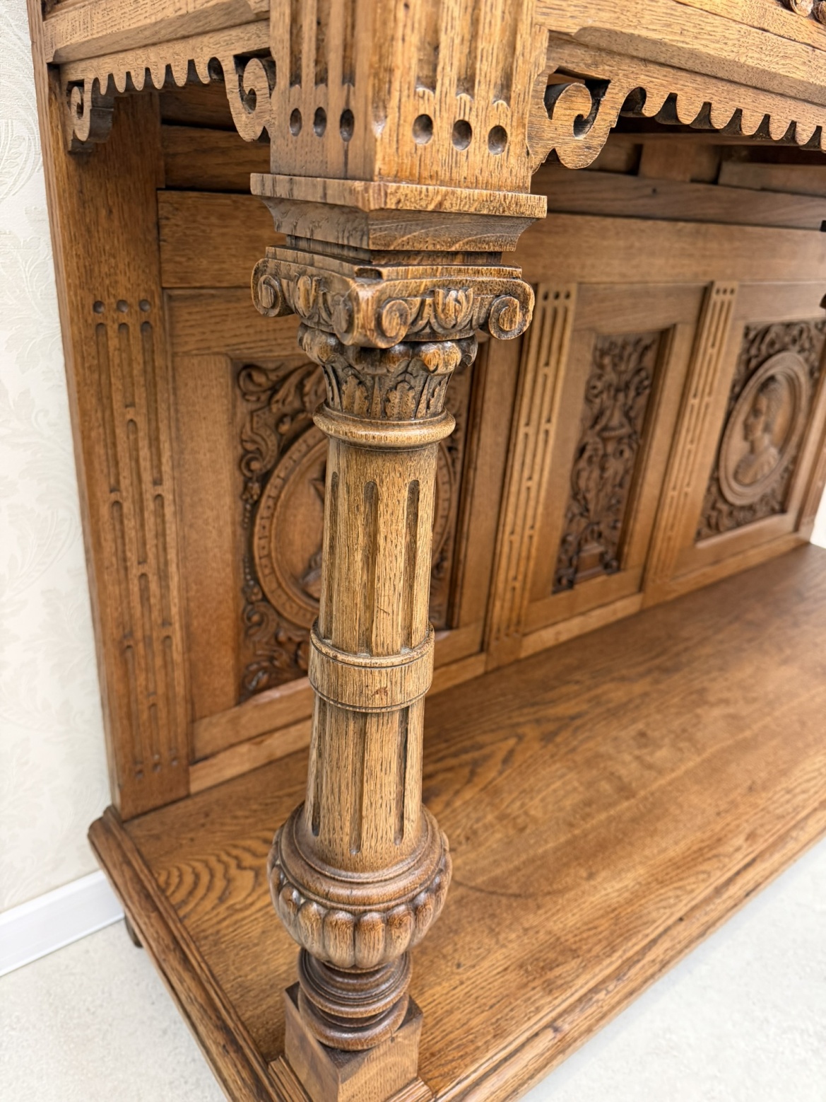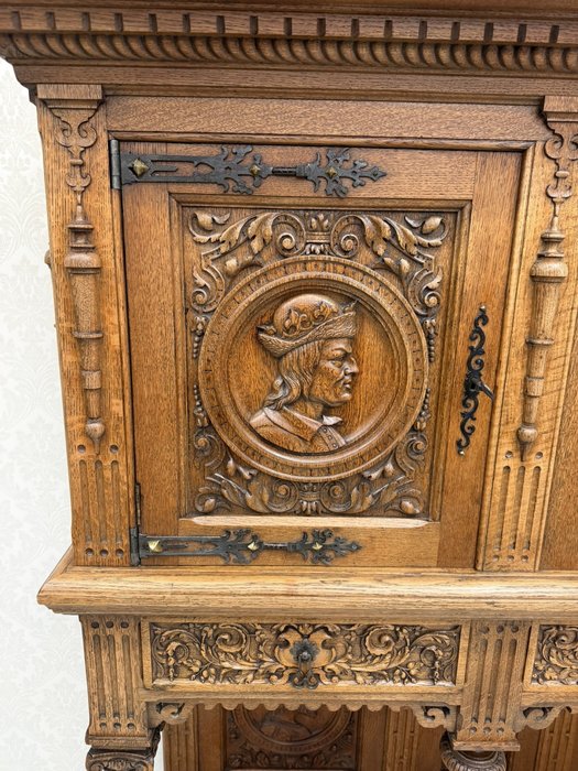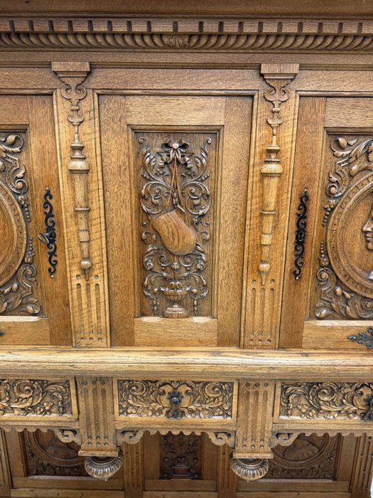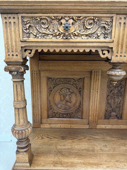 Reprezentativní příborník, členěný na horní úložnou část a otevřenou podnož. Zdoben bohatým řezem, figurálními medailony a ornamenty. Spodní část nesena soustruženými sloupky s korintskými hlavicemi a bohatě profilovaným soklem.26 780 Kč