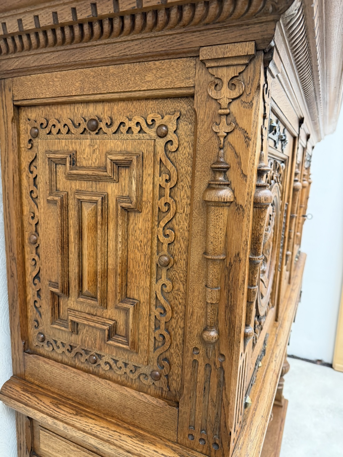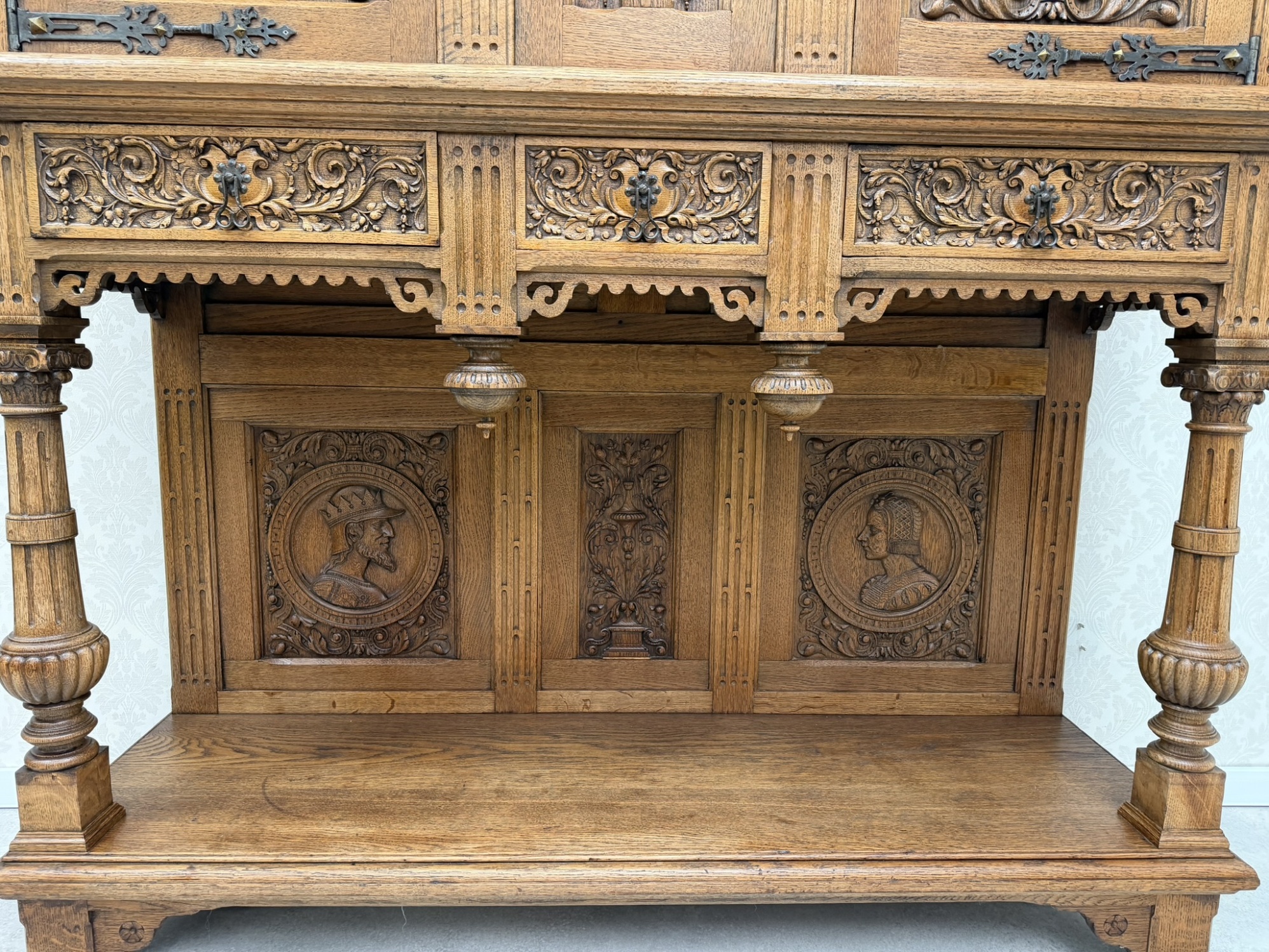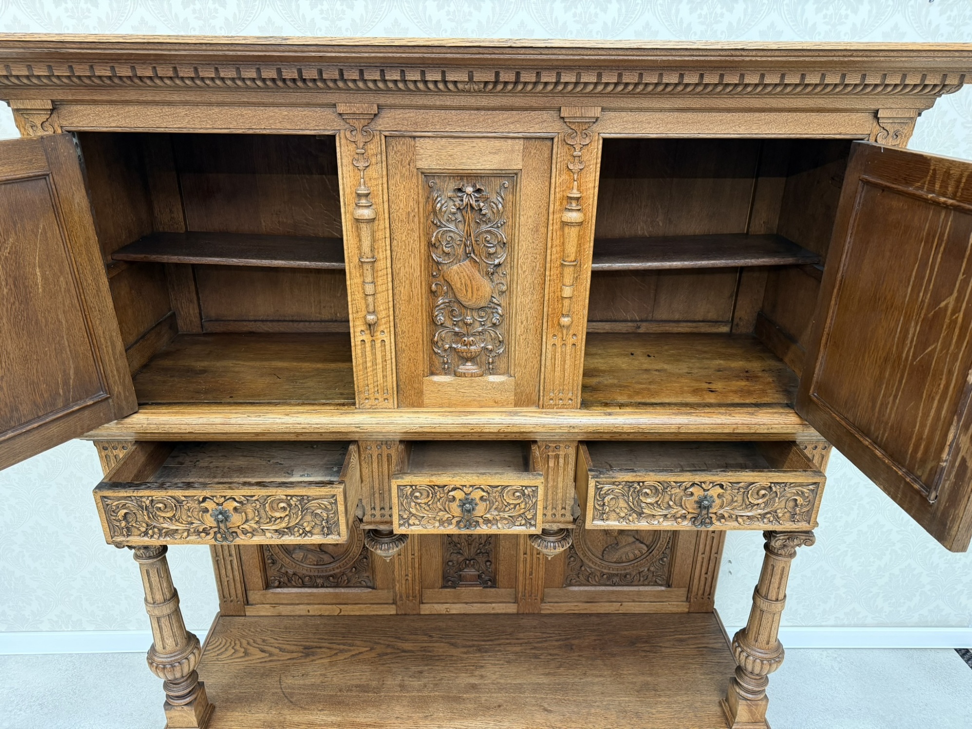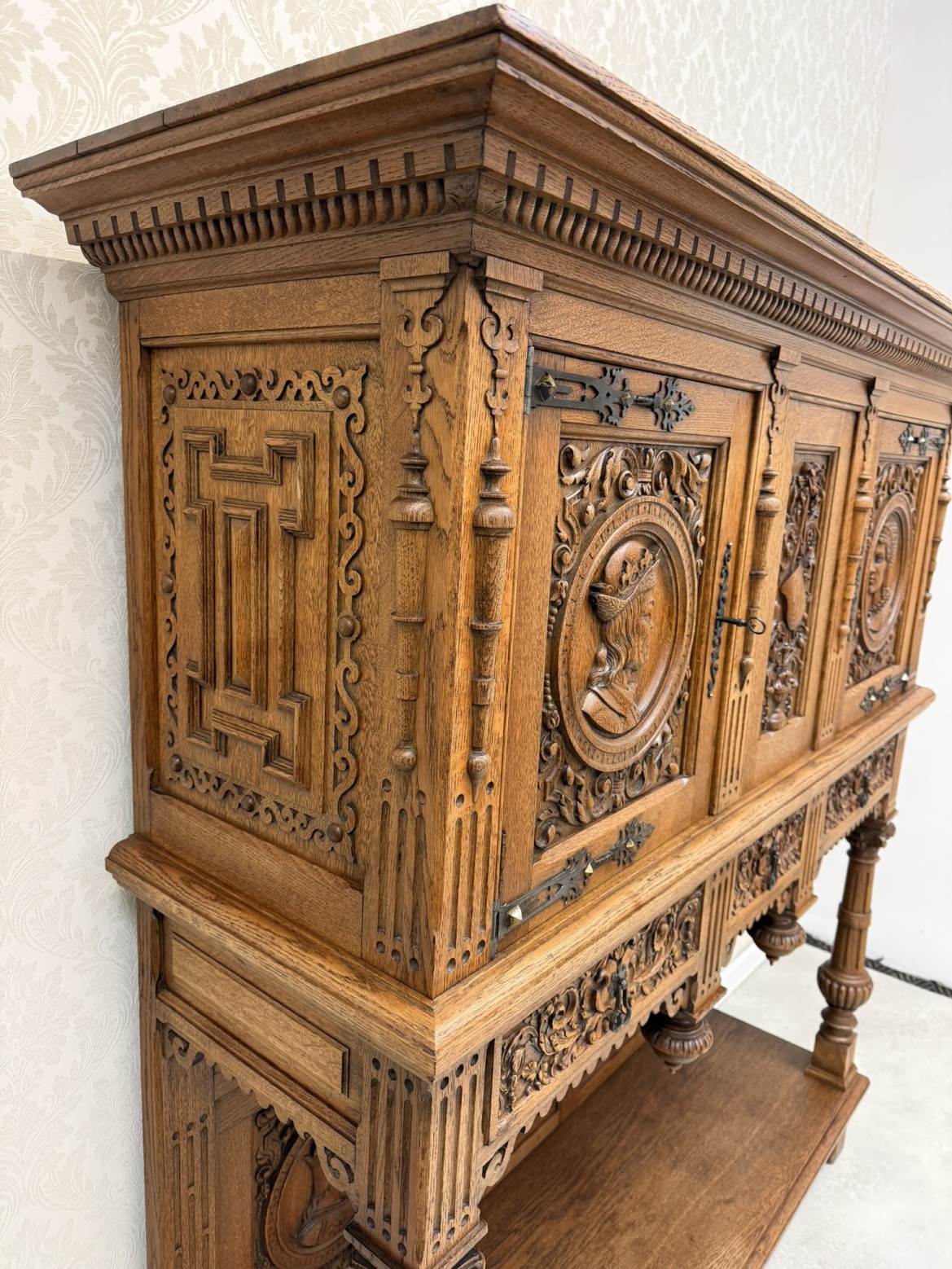 Reprezentativní příborník, členěný na horní úložnou část a otevřenou podnož. Zdoben bohatým řezem, figurálními medailony a ornamenty. Spodní část nesena soustruženými sloupky s korintskými hlavicemi a bohatě profilovaným soklem.26 780 Kč