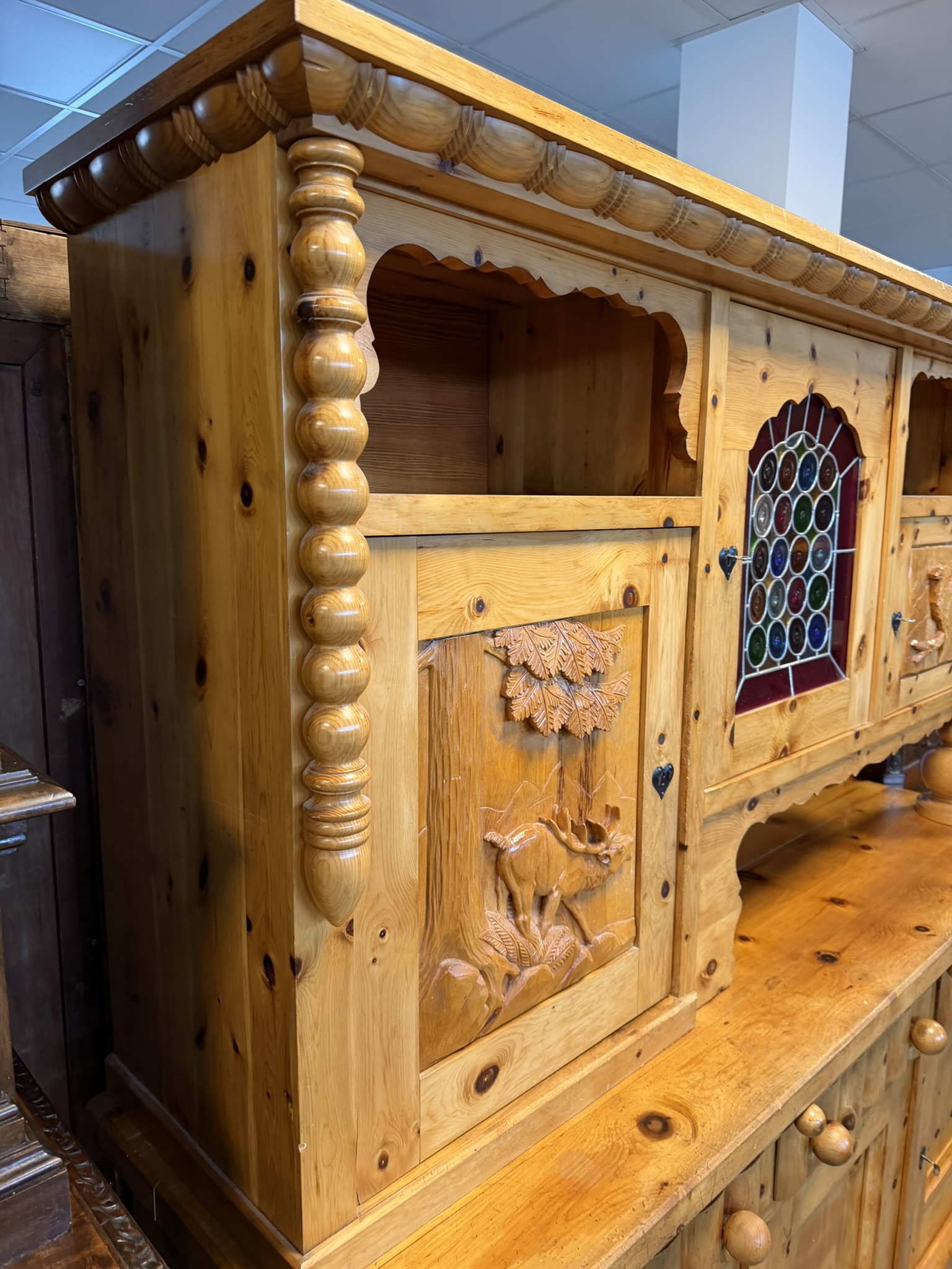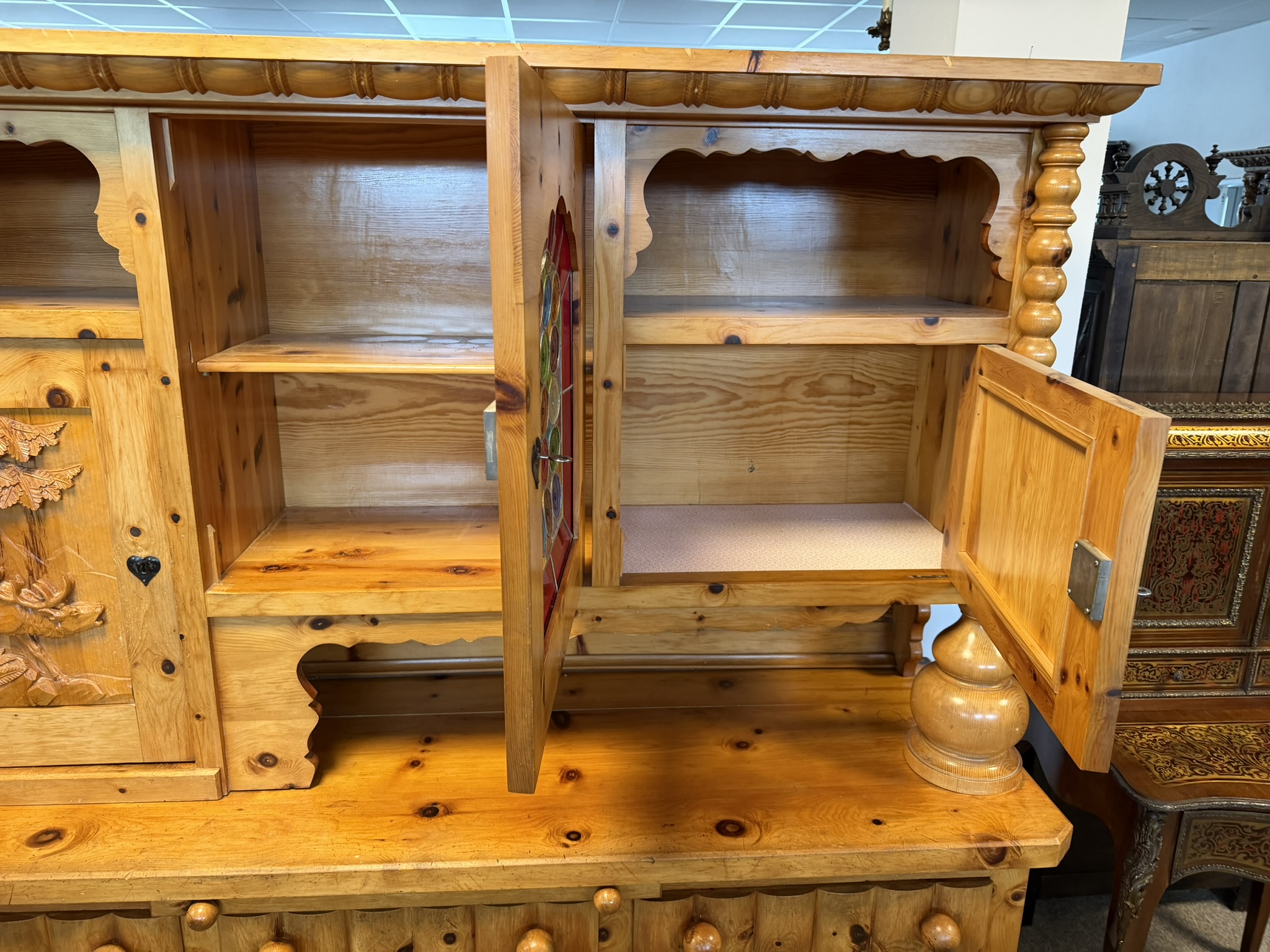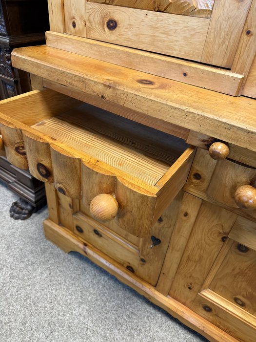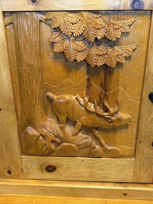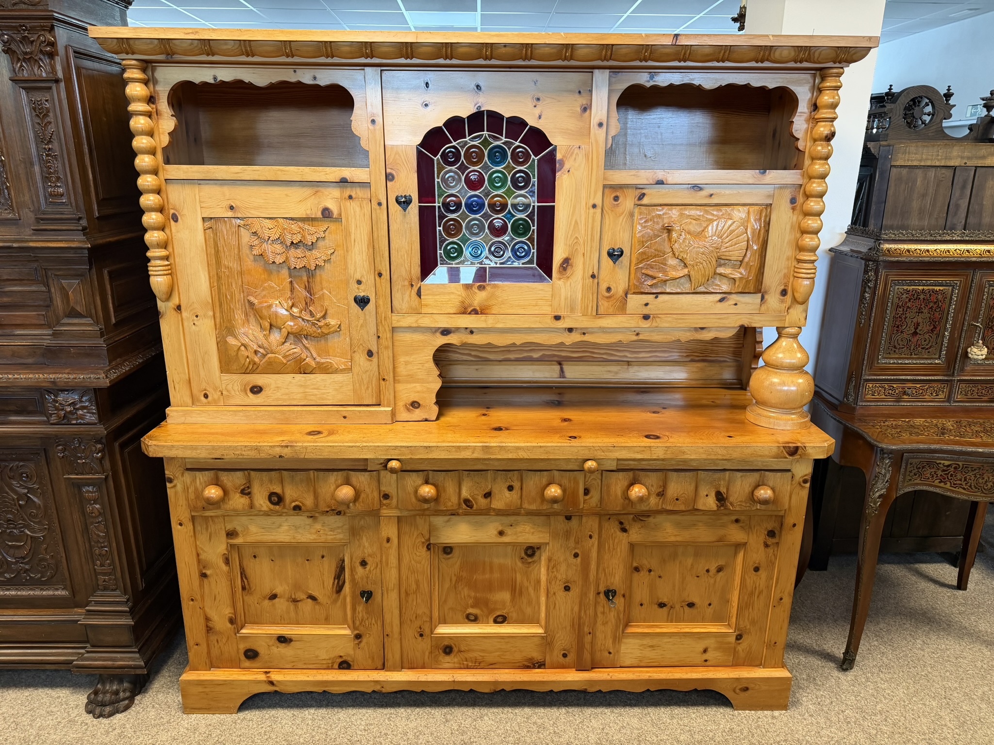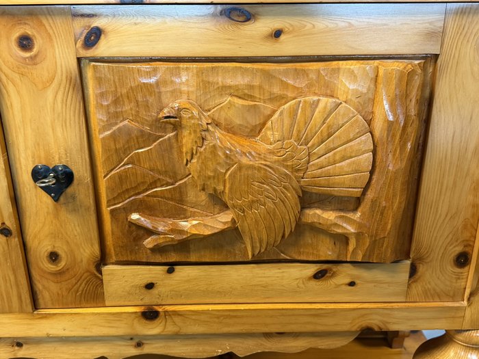 Dvoudílný příborník s horní nástavbou a spodní skříňovou částí nabízí dostatek úložného prostoru. Dominantou jsou řezbované výplně dvířek s motivy zvěře a ptactva a středová část s barevnou skleněnou výplní. Konstrukci doplňují soustružené sloupky, profilované hrany a výrazná kresba dřeva. Spodní část tvoří zásuvky a plná dvířka.