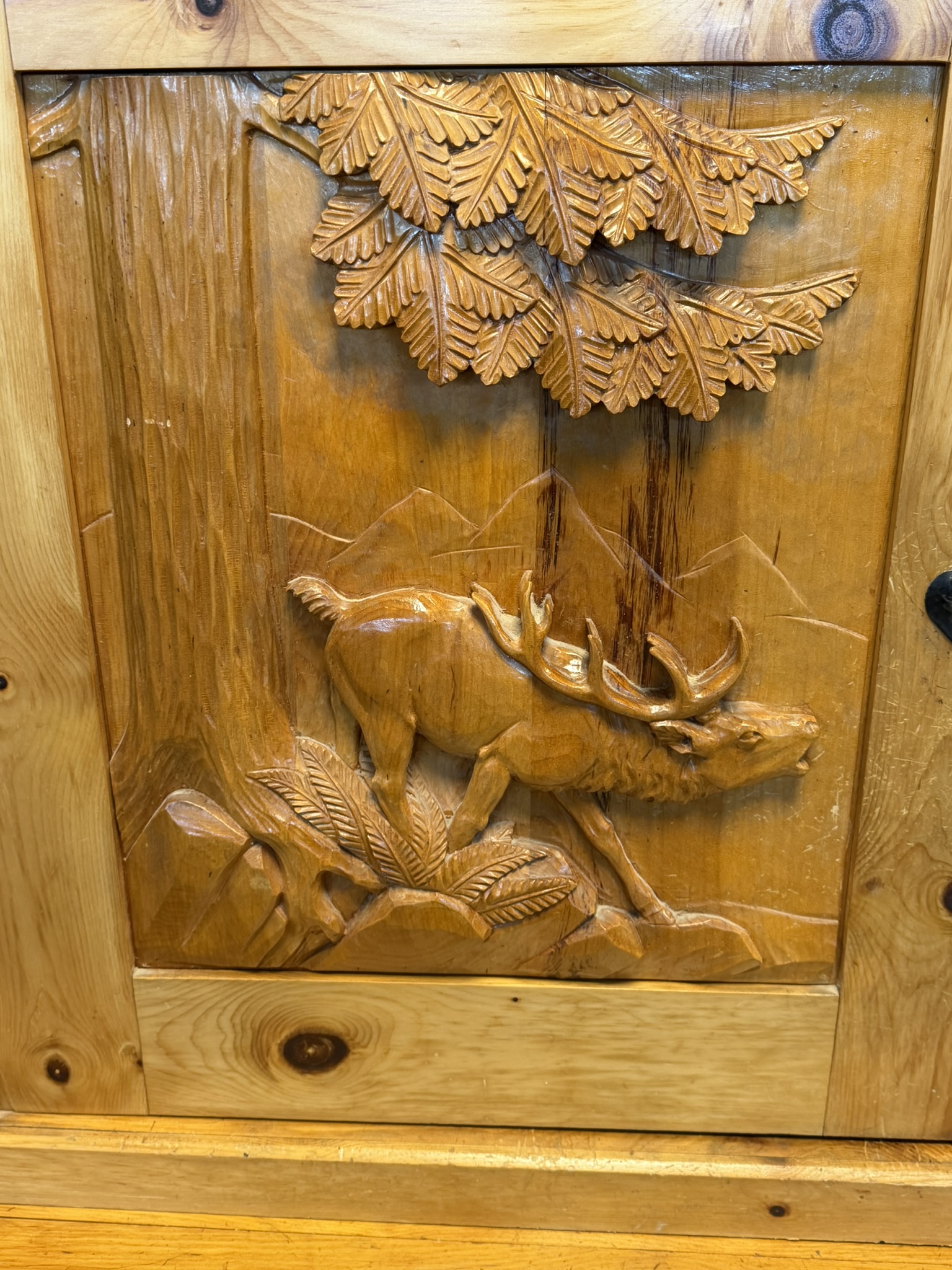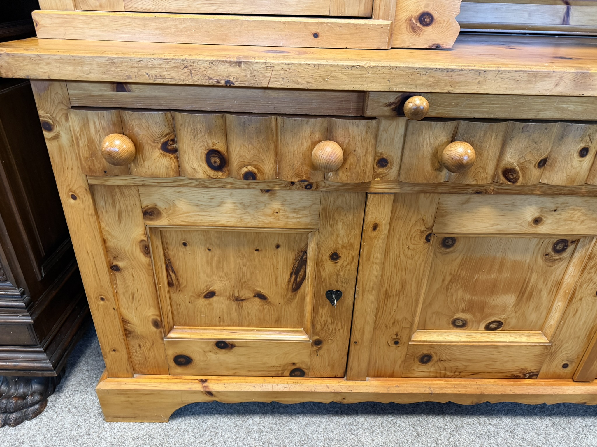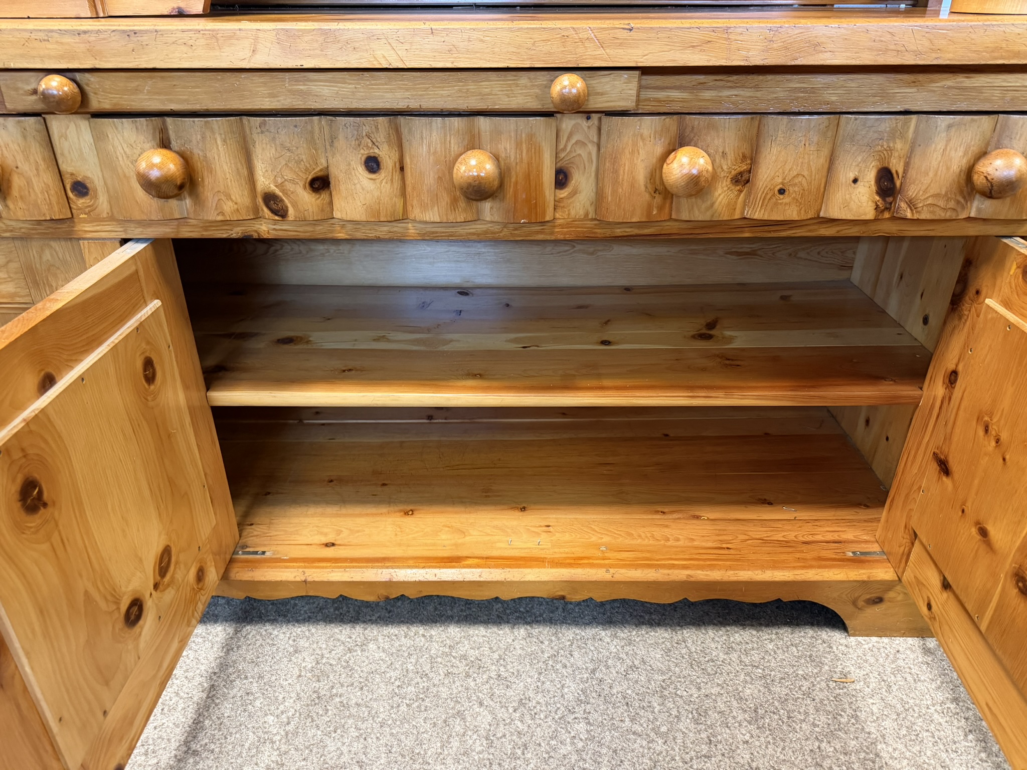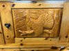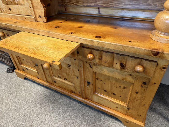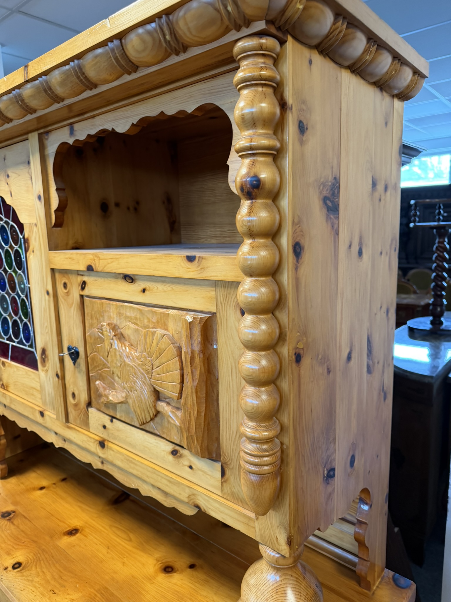 Dvoudílný příborník s horní nástavbou a spodní skříňovou částí nabízí dostatek úložného prostoru. Dominantou jsou řezbované výplně dvířek s motivy zvěře a ptactva a středová část s barevnou skleněnou výplní. Konstrukci doplňují soustružené sloupky, profilované hrany a výrazná kresba dřeva. Spodní část tvoří zásuvky a plná dvířka.