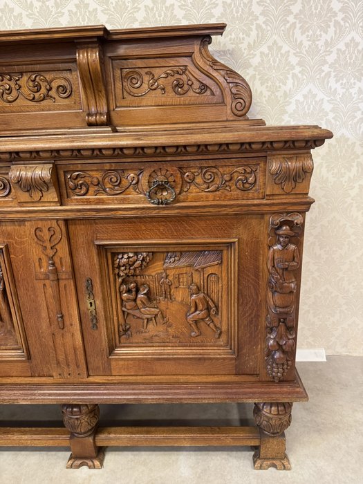 Výjevy na dvířkách vyprávějí scény z každodenního života – tanec, vinohrad či hostinu – a připomínají lidové umění. Sloupky jsou zdobeny stylizovanými listy akantu, úchyty na zásuvkách ve tvaru lvích hlav zdůrazňují reprezentativní charakter. Dolní část příborníku spojují profilované nosníky na hranatých nohách s květinovým dekorem. Vnitřní prostory jsou prakticky členěny policemi.20 480 Kč