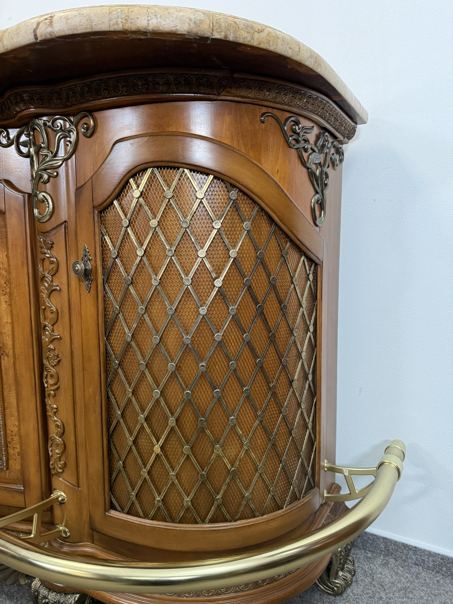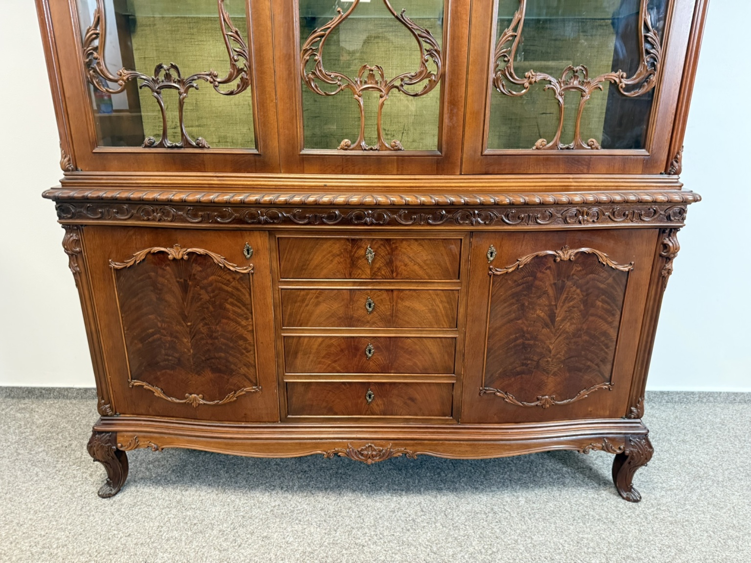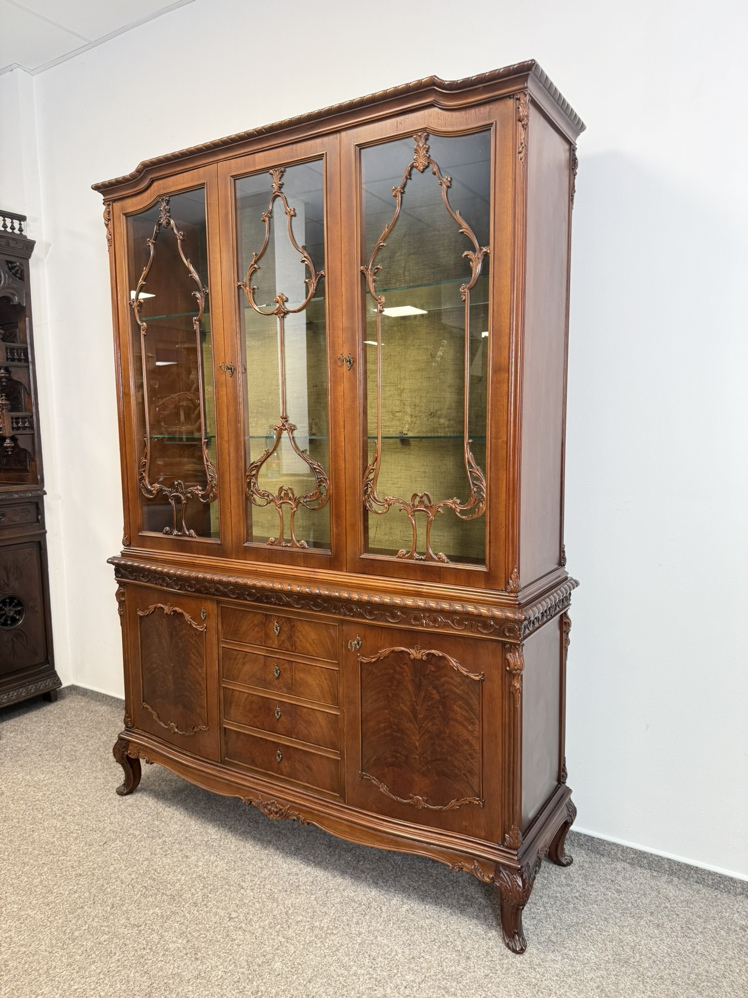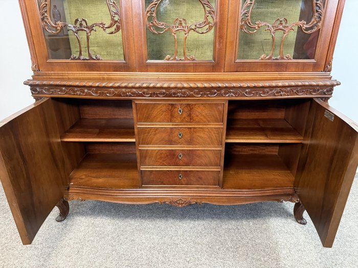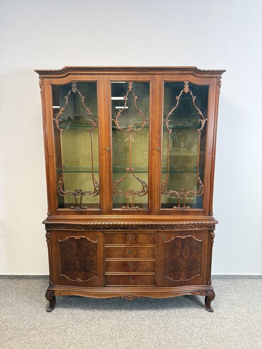 Vitrína se třemi prosklenými křídly, zdobenými ornamenty. Spodní část tvoří čtyři centrální zásuvky a dvě postranní skříňky s intarzovanými dvířky. Horní římsa s vyřezávaným dekorem, dolní část na jemně klenutých nohách s rostlinnými motivy. Vitrína vyniká precizním zpracováním.27 340 Kč
