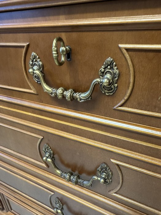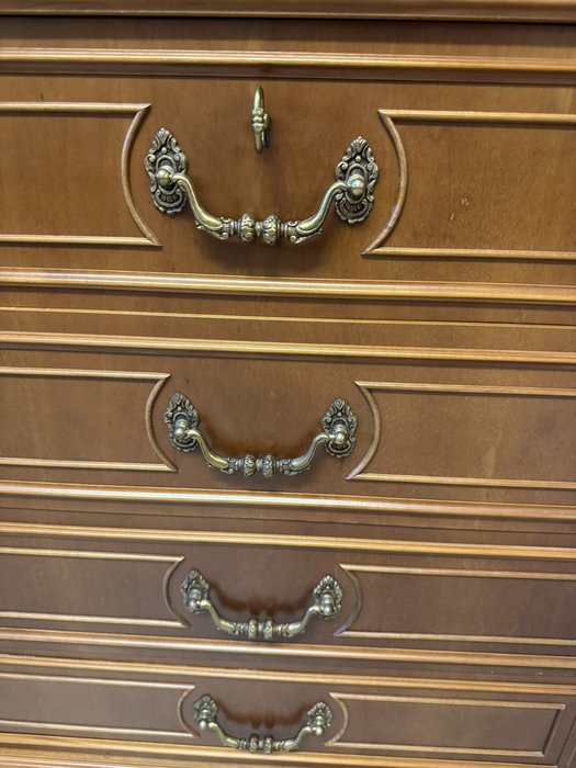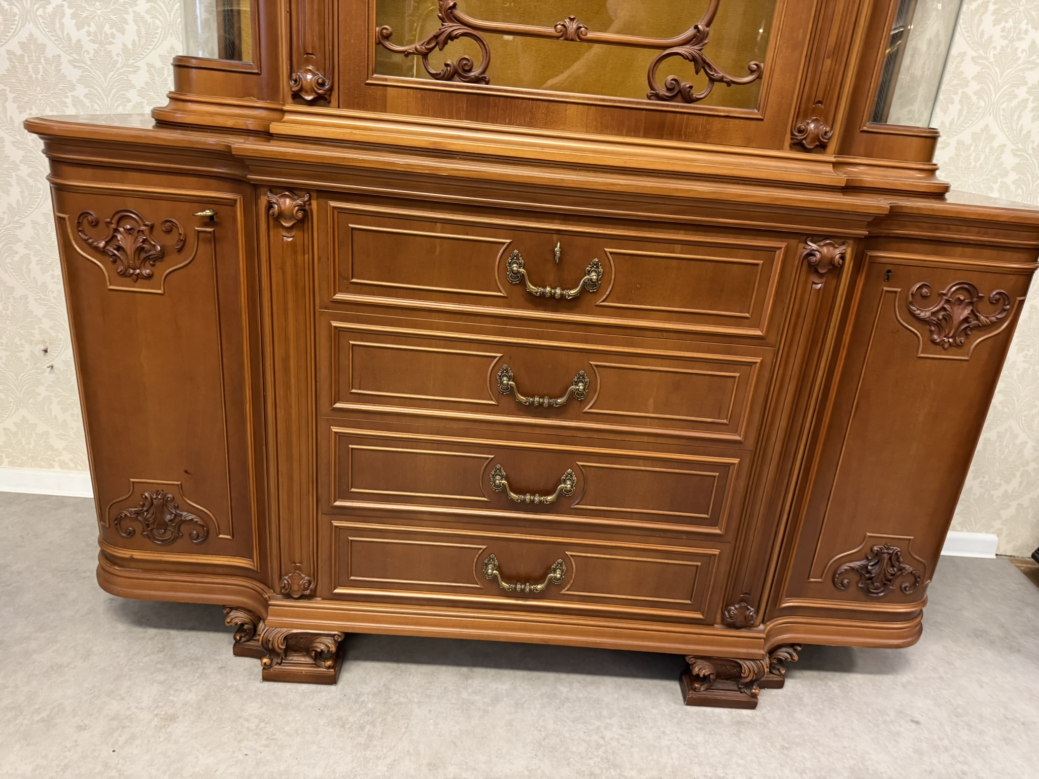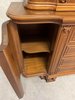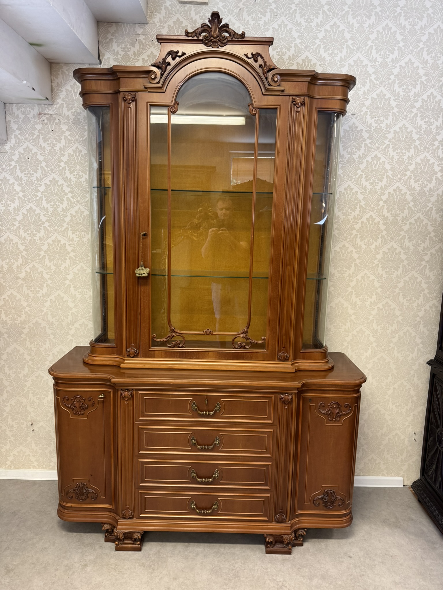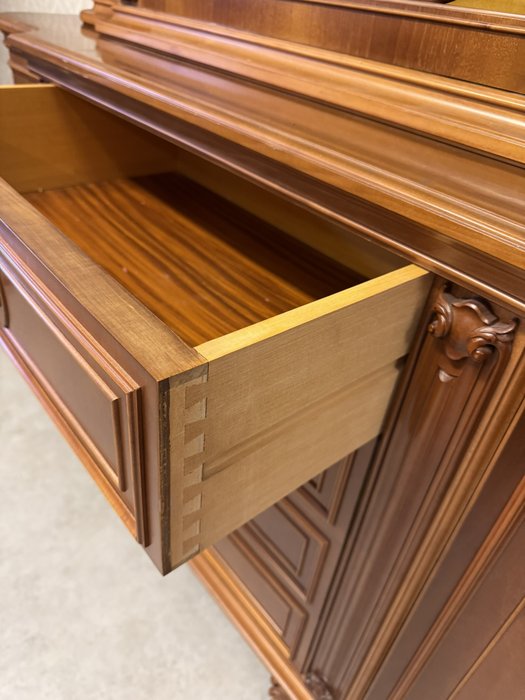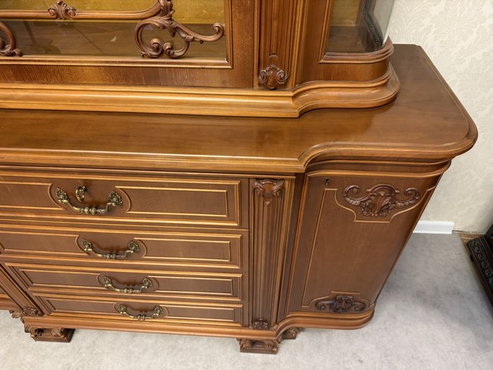Vitrína s centrálně klenutými dvířky, bočními prosklenými částmi a profilovaným nástavcem. Spodní část tvoří komoda se čtyřmi zásuvkami a postranními skříňkami.22 850 Kč