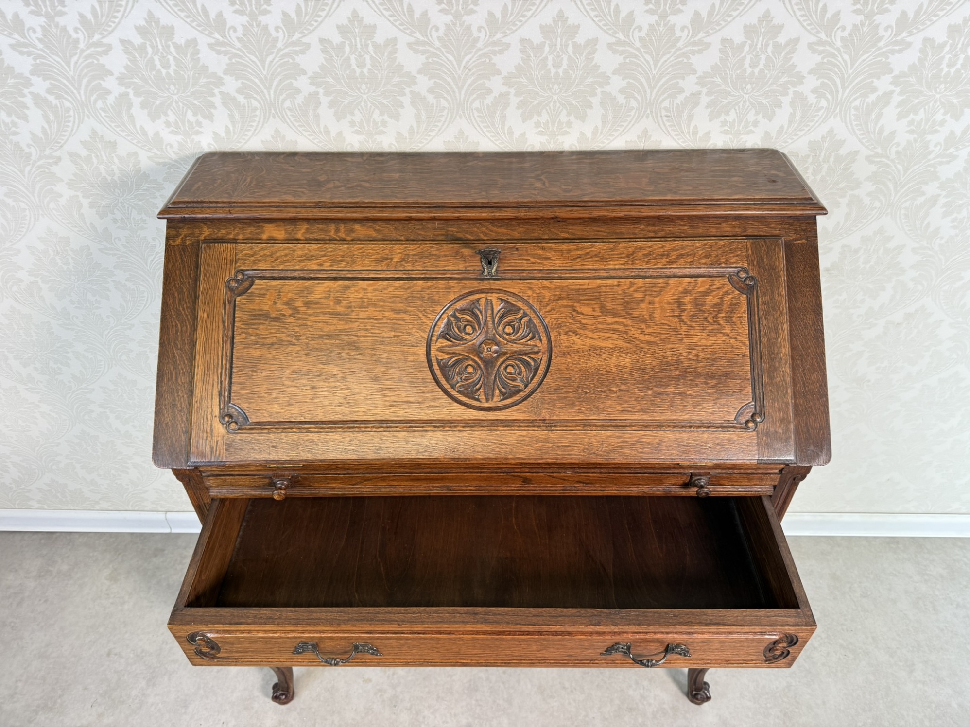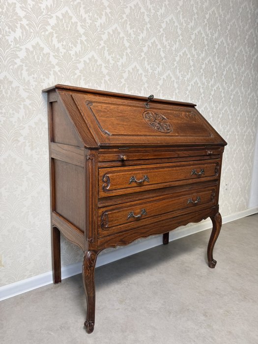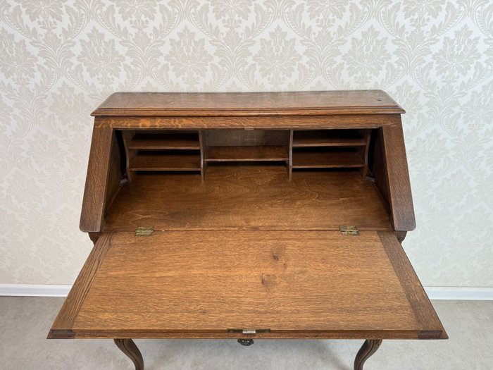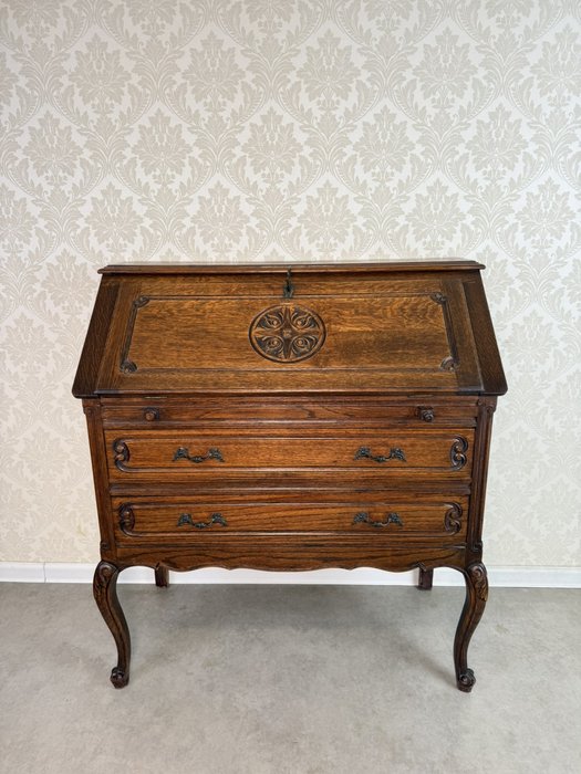 Sekretář s výklopnou psací deskou a členěným vnitřním prostorem na dopisy a dokumenty. Vybaven prostornými zásuvkami a krásně tvarovanými nohami s řezbovanými detaily. Na čelní straně je vyzdoben reliéfem s rozetou a jemným rámováním, které podtrhuje charakter kusu.8 280 Kč