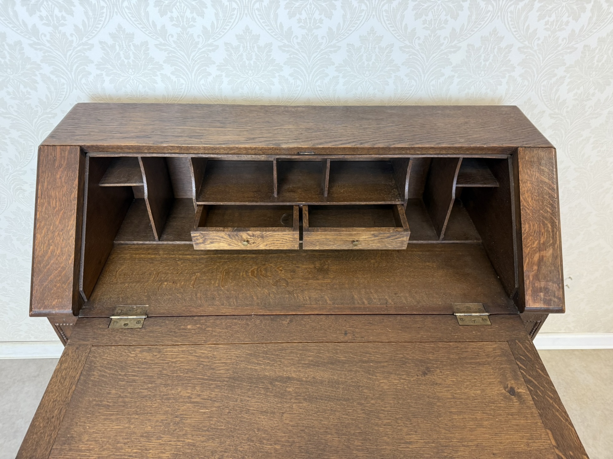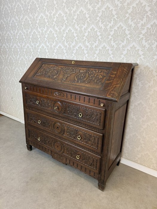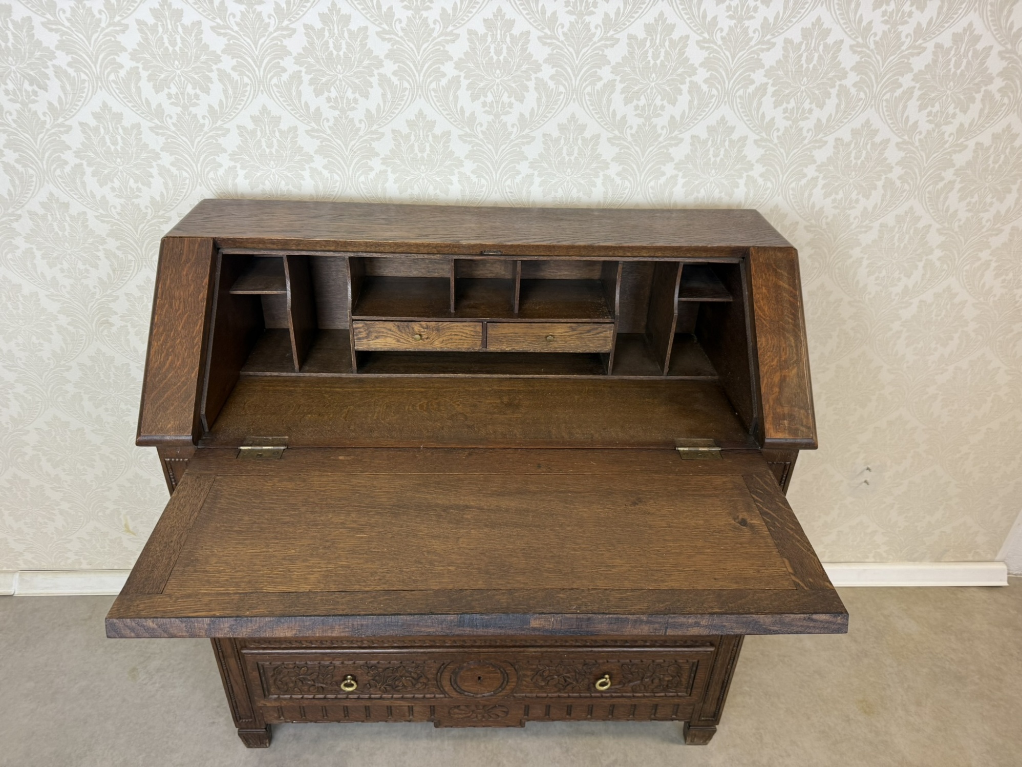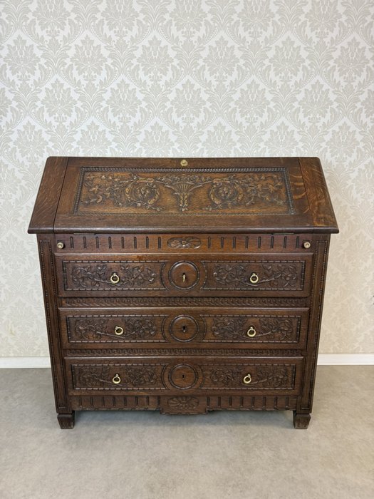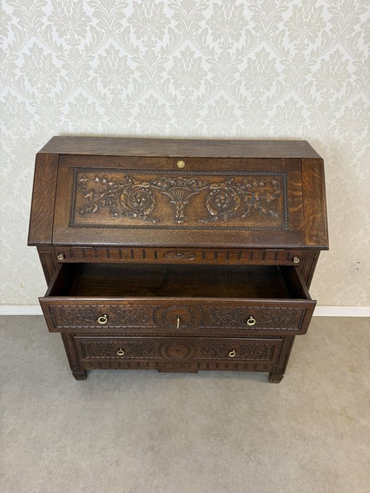 Psací sekretář s vyklápěcí pracovní deskou a členěným vnitřním prostorem. Čelní strana a šuplíky jsou zdobeny ručně řezanými květinovými motivy, na horním víku dominuje dekor s věncem a vázou.13 870 Kč