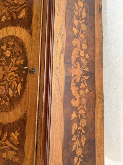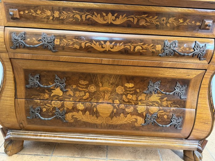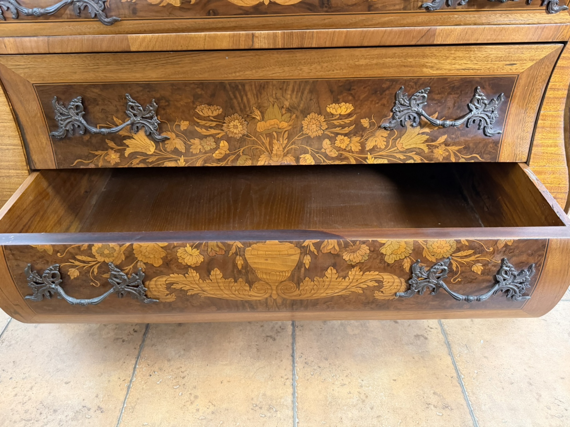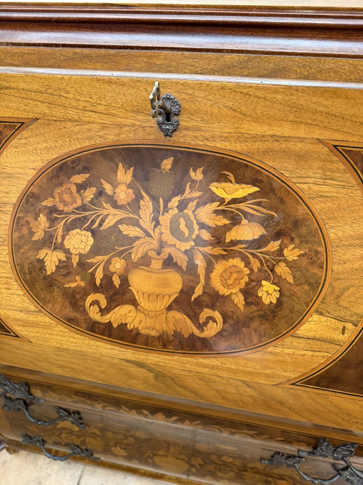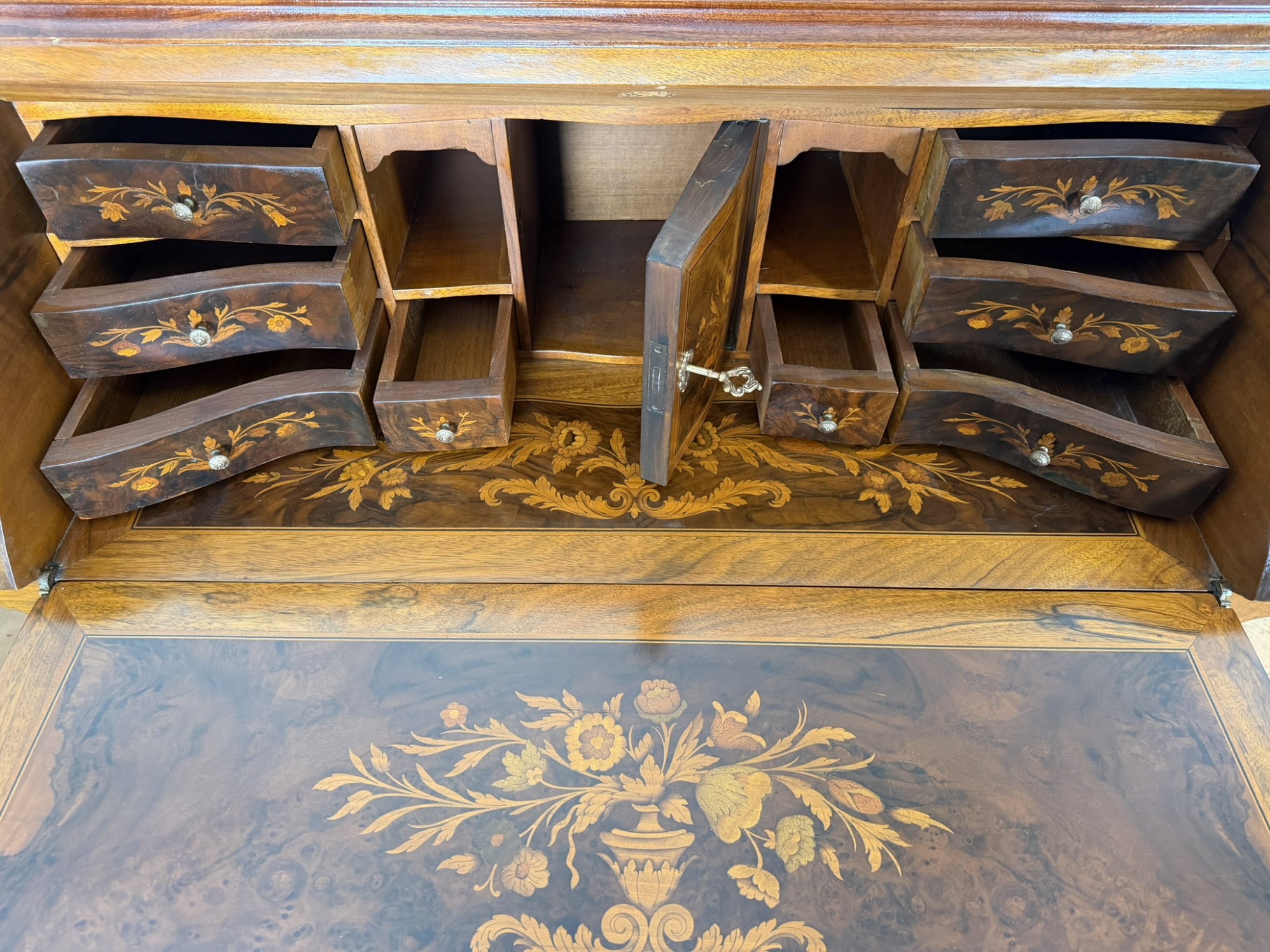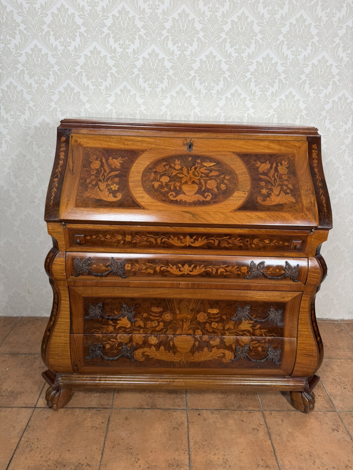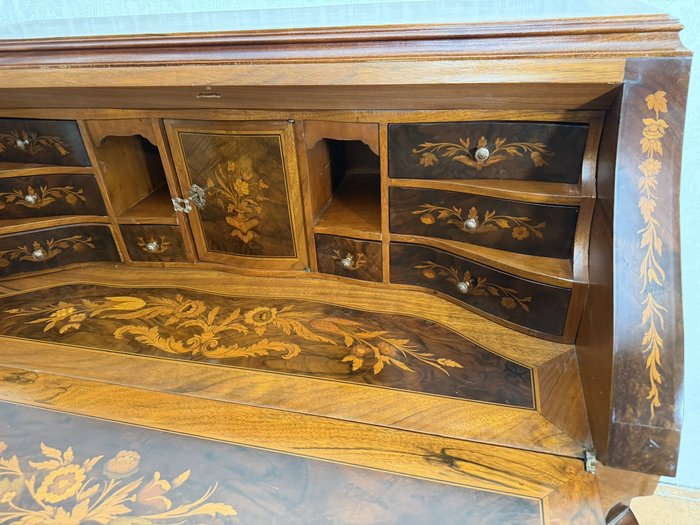 Dřevěný barokní sekretář s výklopnou psací deskou a výraznou intarzovanou výzdobou s květinovými motivy. Čelní i boční strany zdobí detailní intarzie s ústředními motivy váz. Uvnitř se nachází řada zásuvek a přihrádek, rovněž intarzovaných. Spodní část tvoří hluboké šuplíky s původními kovovými úchyty. Korpus s typicky zvlněným profilem stojí na vyřezávaných nožkách.