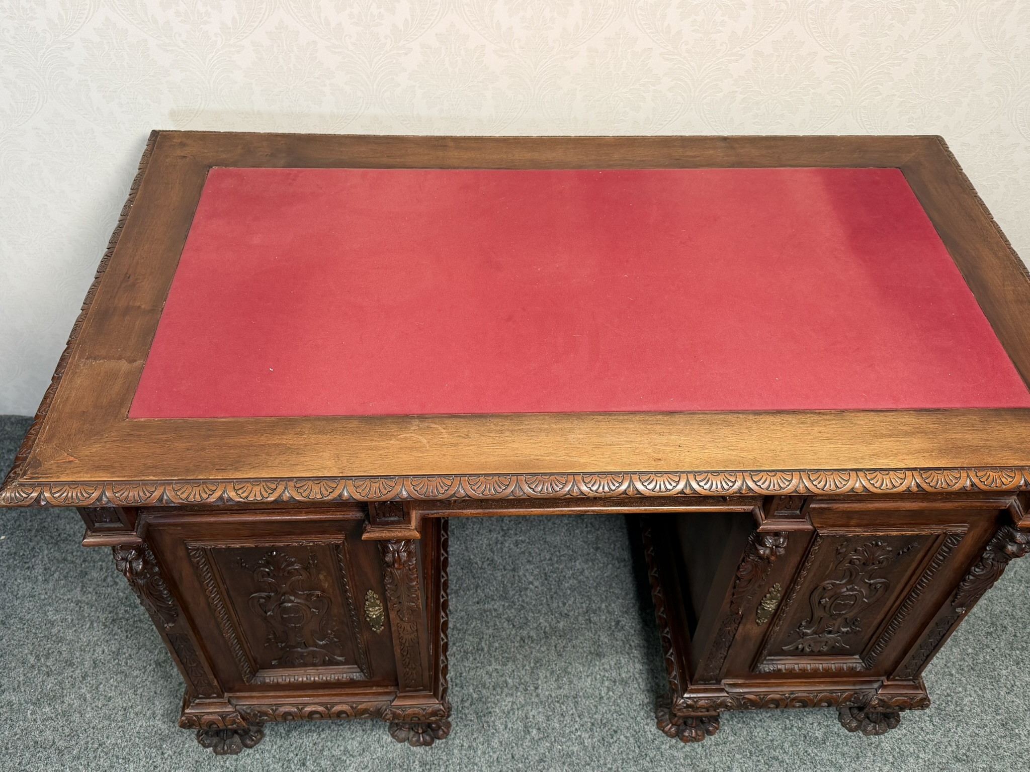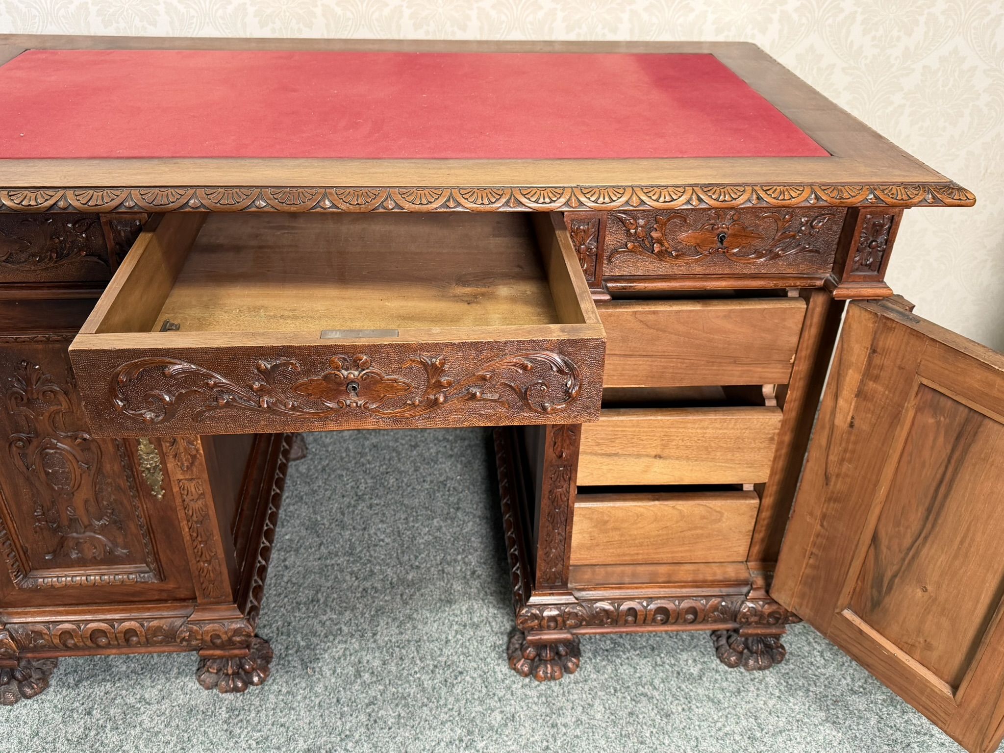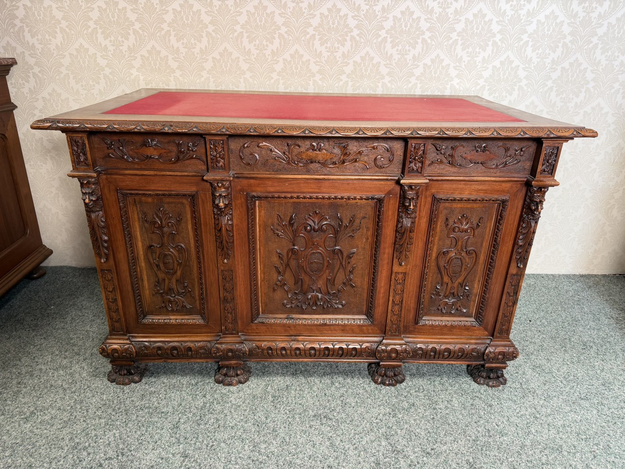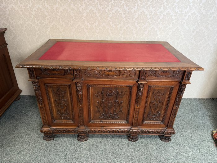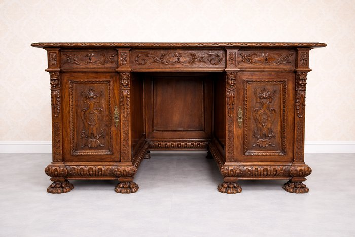 Psací stůl , zdobený bohatou ruční řezbou s rostlinnými motivy a maskarony. Stůl má centrální kolenní prostor, horní zásuvku, postranní skříňky s dvířky a vnitřními zásuvkami, což zajišťuje dostatek úložného prostoru. Deska je doplněna červenou psací vložkou. Robustní konstrukce, profilované římsy a nohy zakončené lvími tlapami podtrhují reprezentativní charakter kusu.