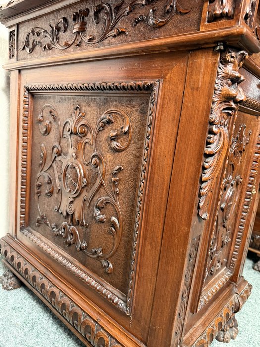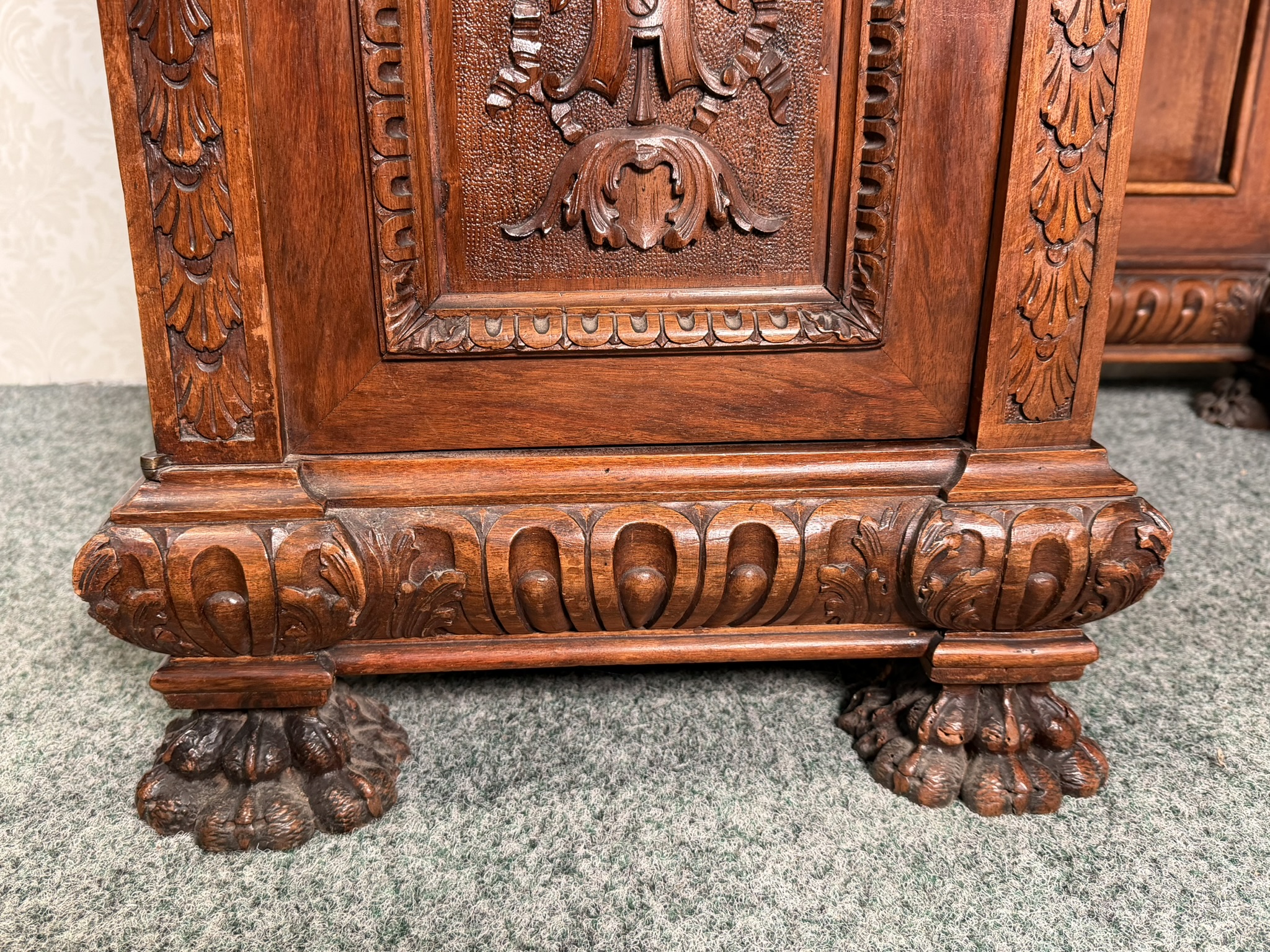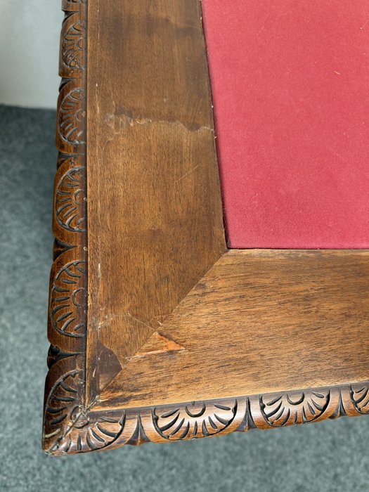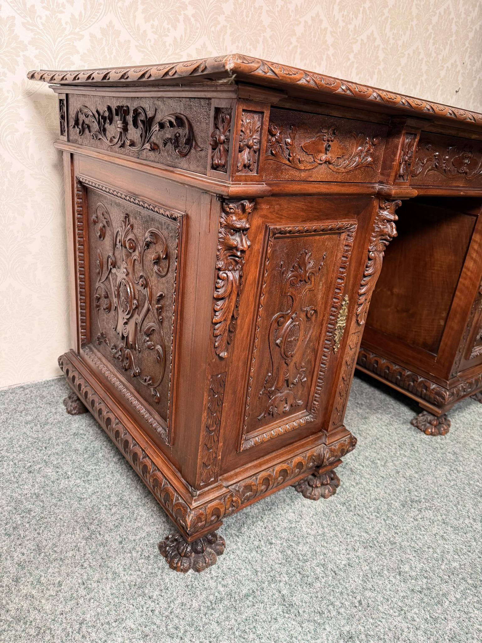 Psací stůl , zdobený bohatou ruční řezbou s rostlinnými motivy a maskarony. Stůl má centrální kolenní prostor, horní zásuvku, postranní skříňky s dvířky a vnitřními zásuvkami, což zajišťuje dostatek úložného prostoru. Deska je doplněna červenou psací vložkou. Robustní konstrukce, profilované římsy a nohy zakončené lvími tlapami podtrhují reprezentativní charakter kusu.