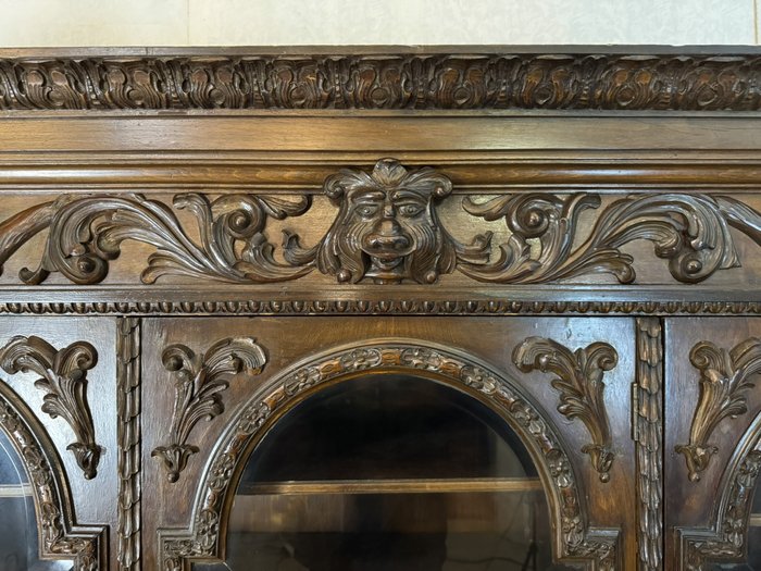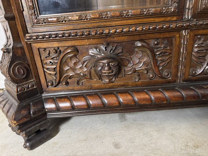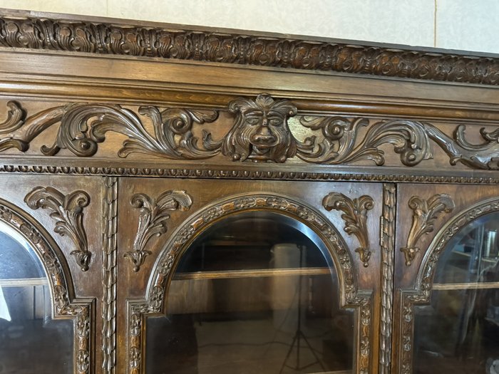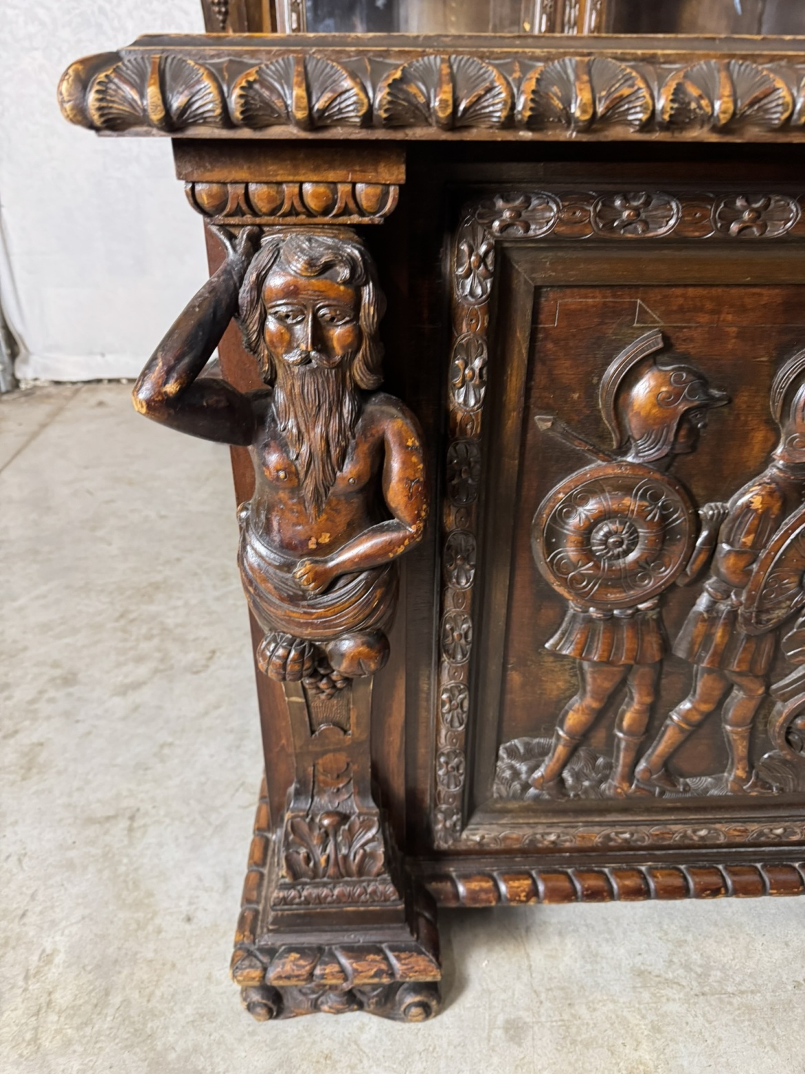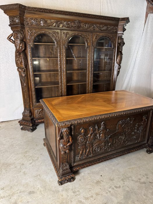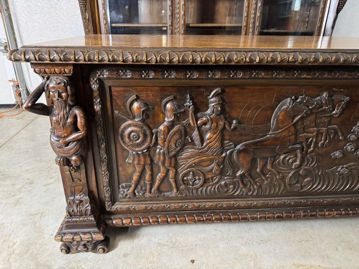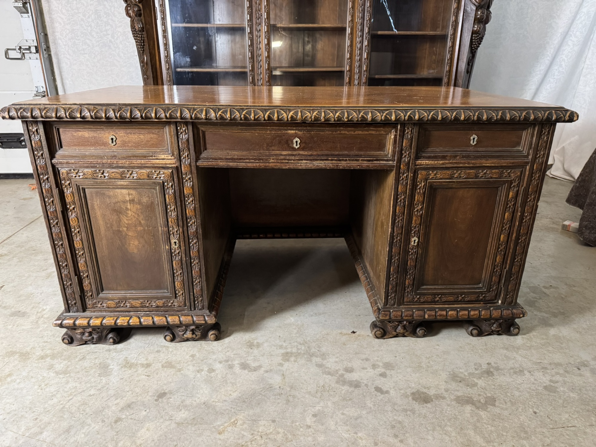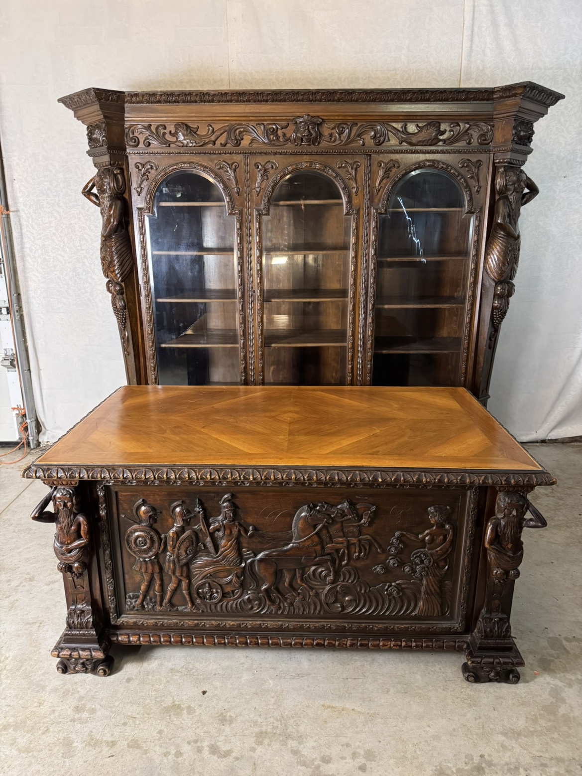 Psací stůl s bohatě zdobenou knihovnou, které dohromady tvoří reprezentativní kancelářský komplet. Stůl je zdoben detailními reliéfy s historickými výjevy, na bocích doplněný postavami atlantů. Knihovna s prosklenými dvířky má tři klenuté části, lemované bohatou řezbou s rostlinnými motivy. Na bocích se opakují figurální prvky. Rozměry: knihovna 250x77x208, psací stůl 160x90x79195 670 Kč