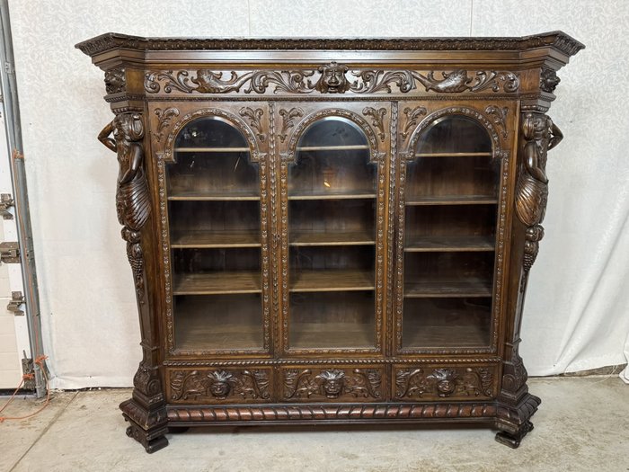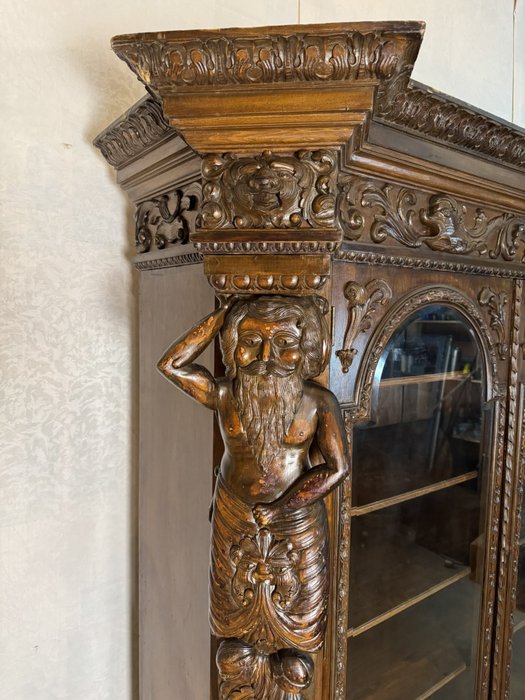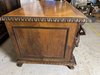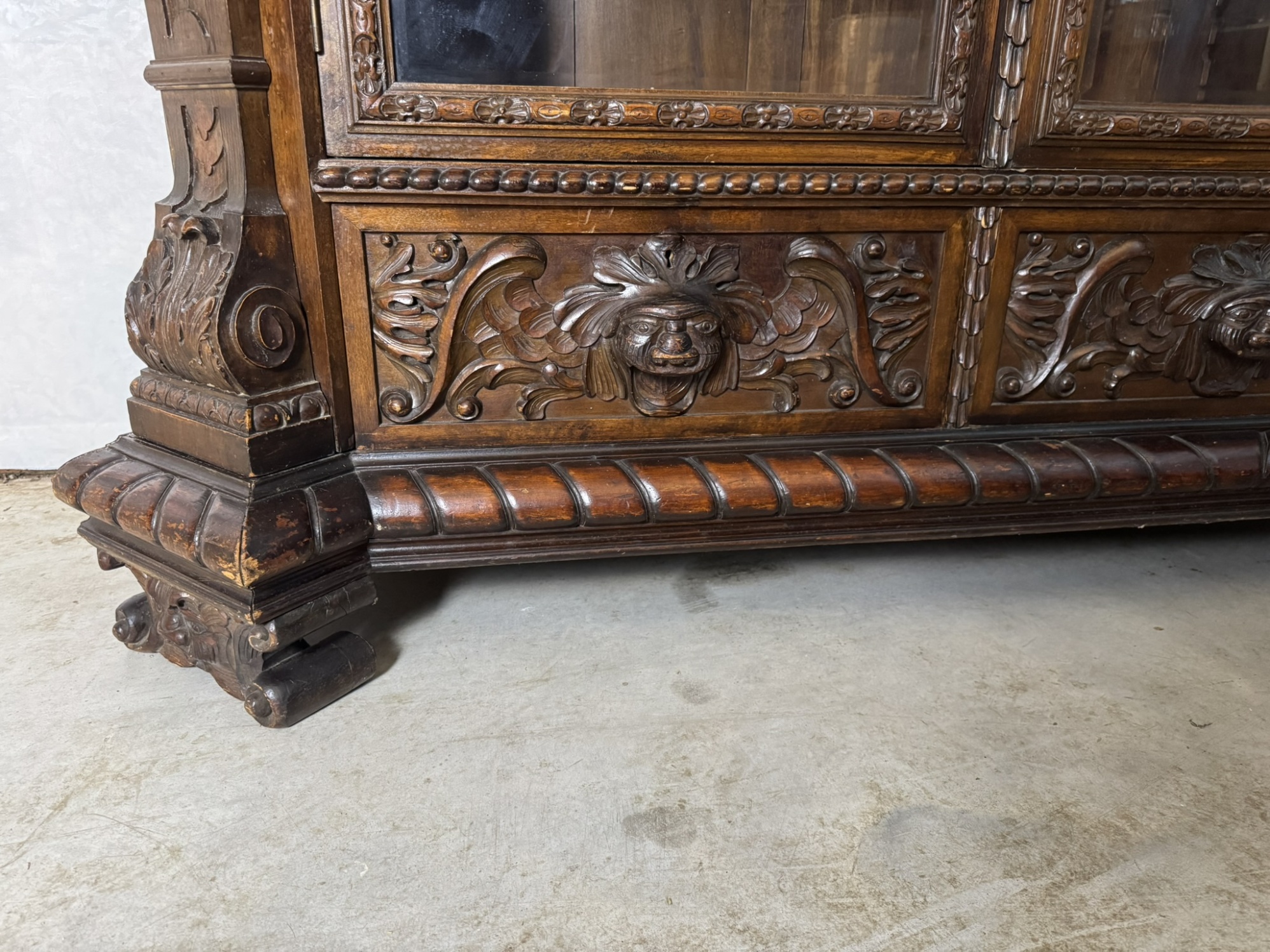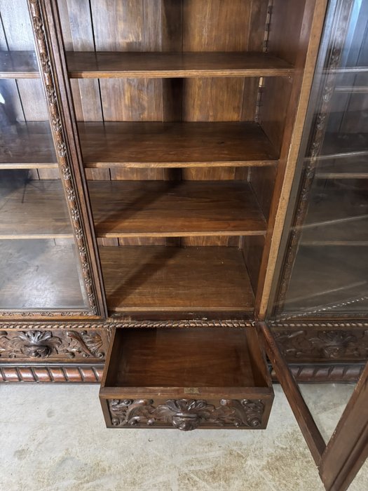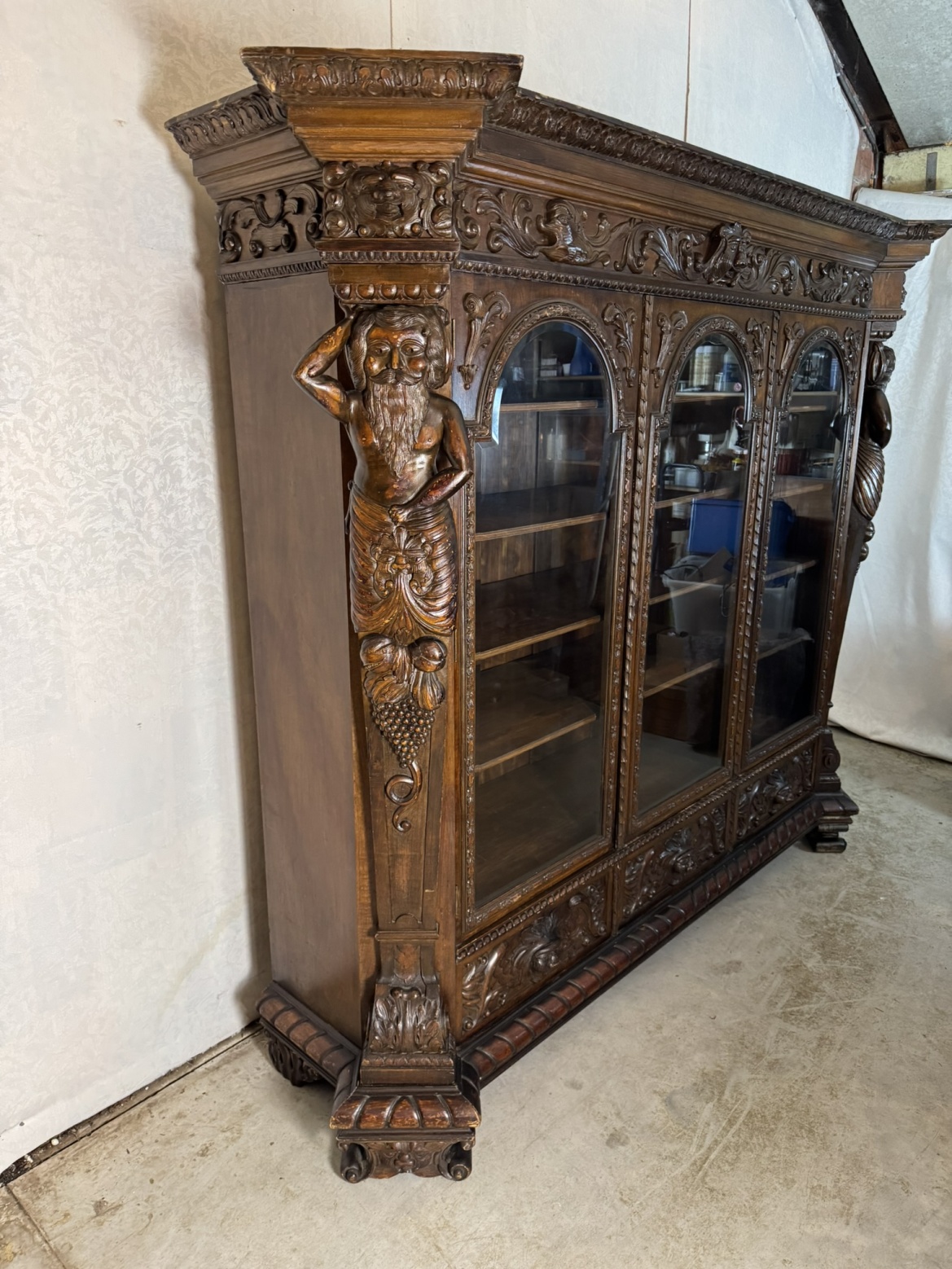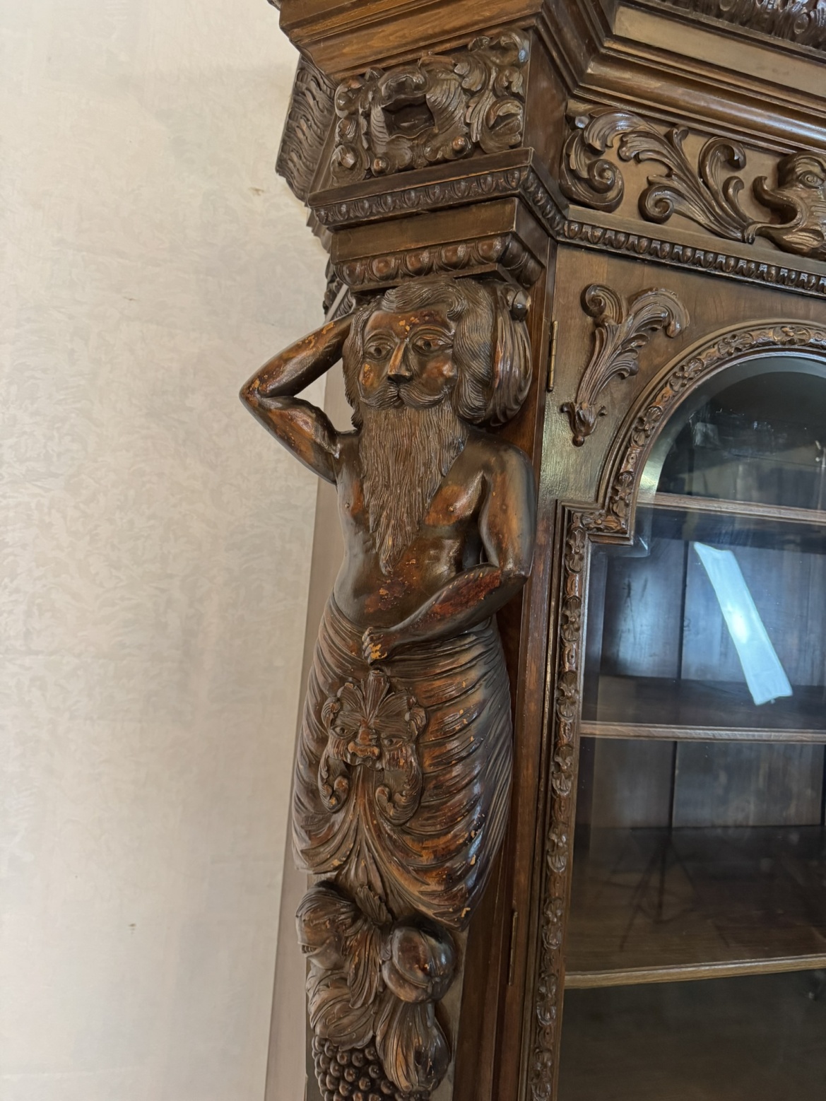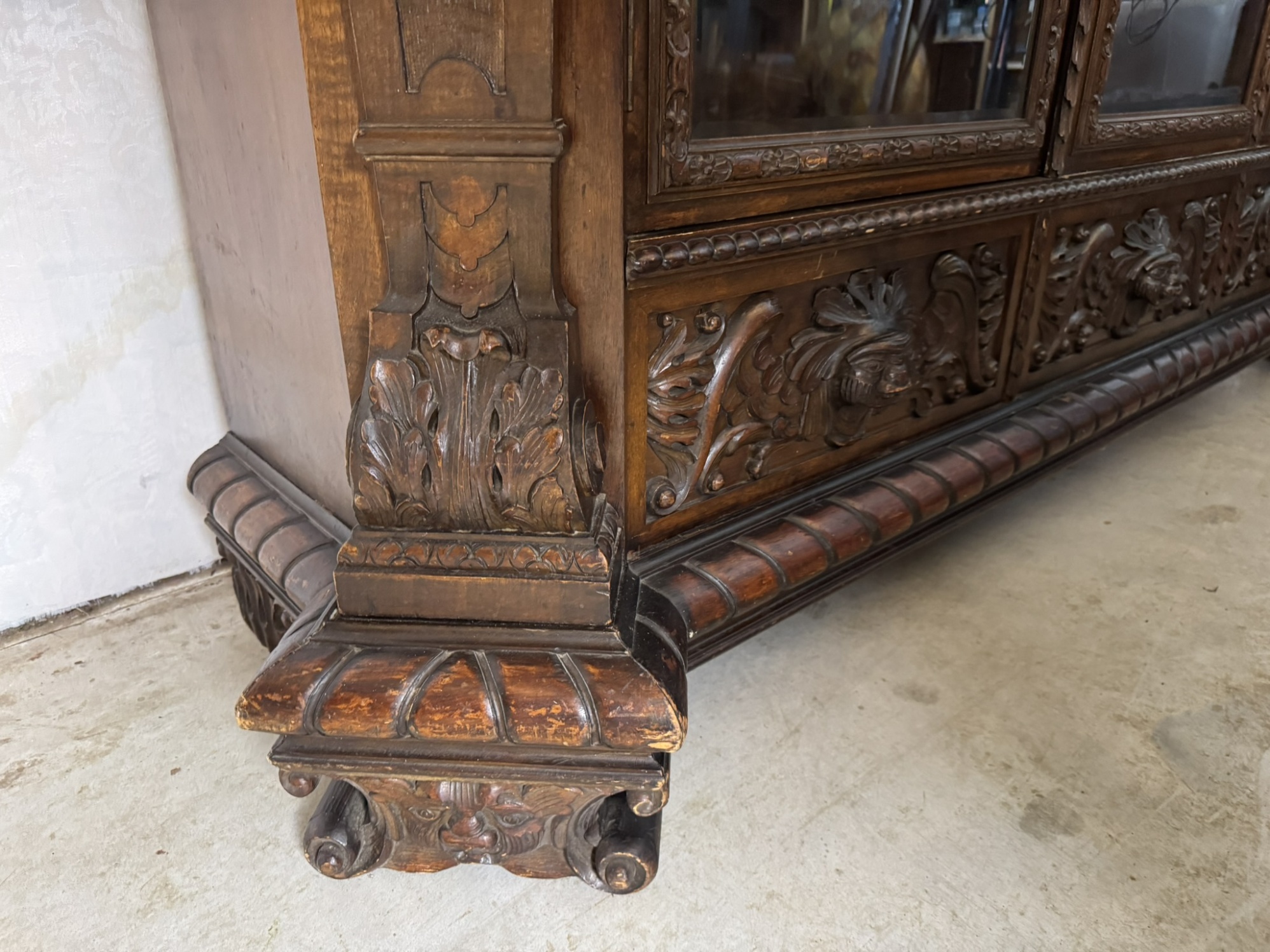 Psací stůl s bohatě zdobenou knihovnou, které dohromady tvoří reprezentativní kancelářský komplet. Stůl je zdoben detailními reliéfy s historickými výjevy, na bocích doplněný postavami atlantů. Knihovna s prosklenými dvířky má tři klenuté části, lemované bohatou řezbou s rostlinnými motivy. Na bocích se opakují figurální prvky. Rozměry: knihovna 250x77x208, psací stůl 160x90x79195 670 Kč
