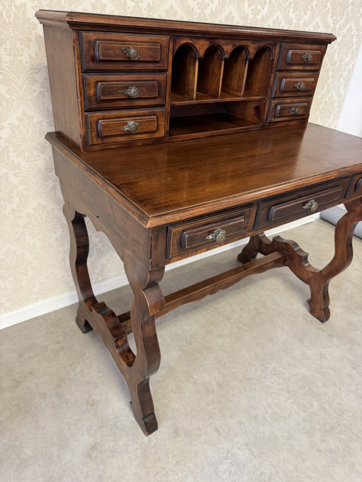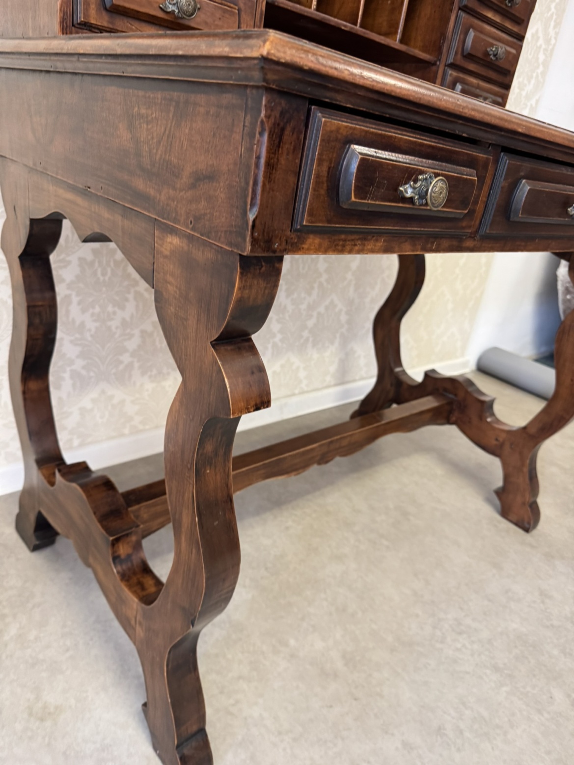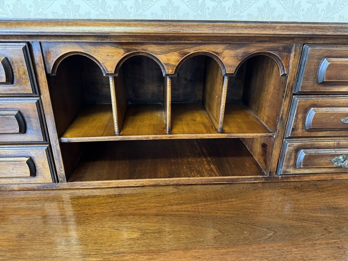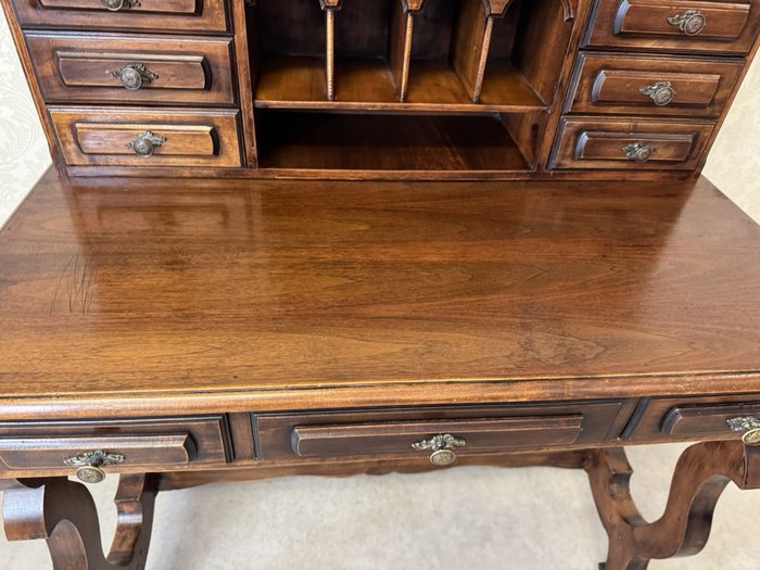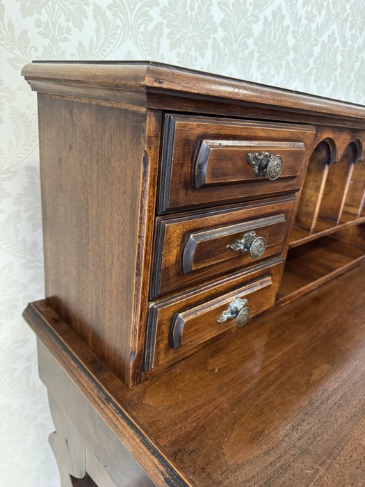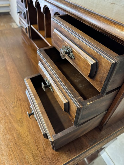 Psací stůl s horní nástavbou s menšími zásuvkami a přihrádkami s obloukovým zakončením. Spodní část tvoří hlubší zásuvky a vyřezávané boční nohy, spojené vodorovnou lištou. Povrch nese známky užívání, které podtrhují jeho dobový charakter.