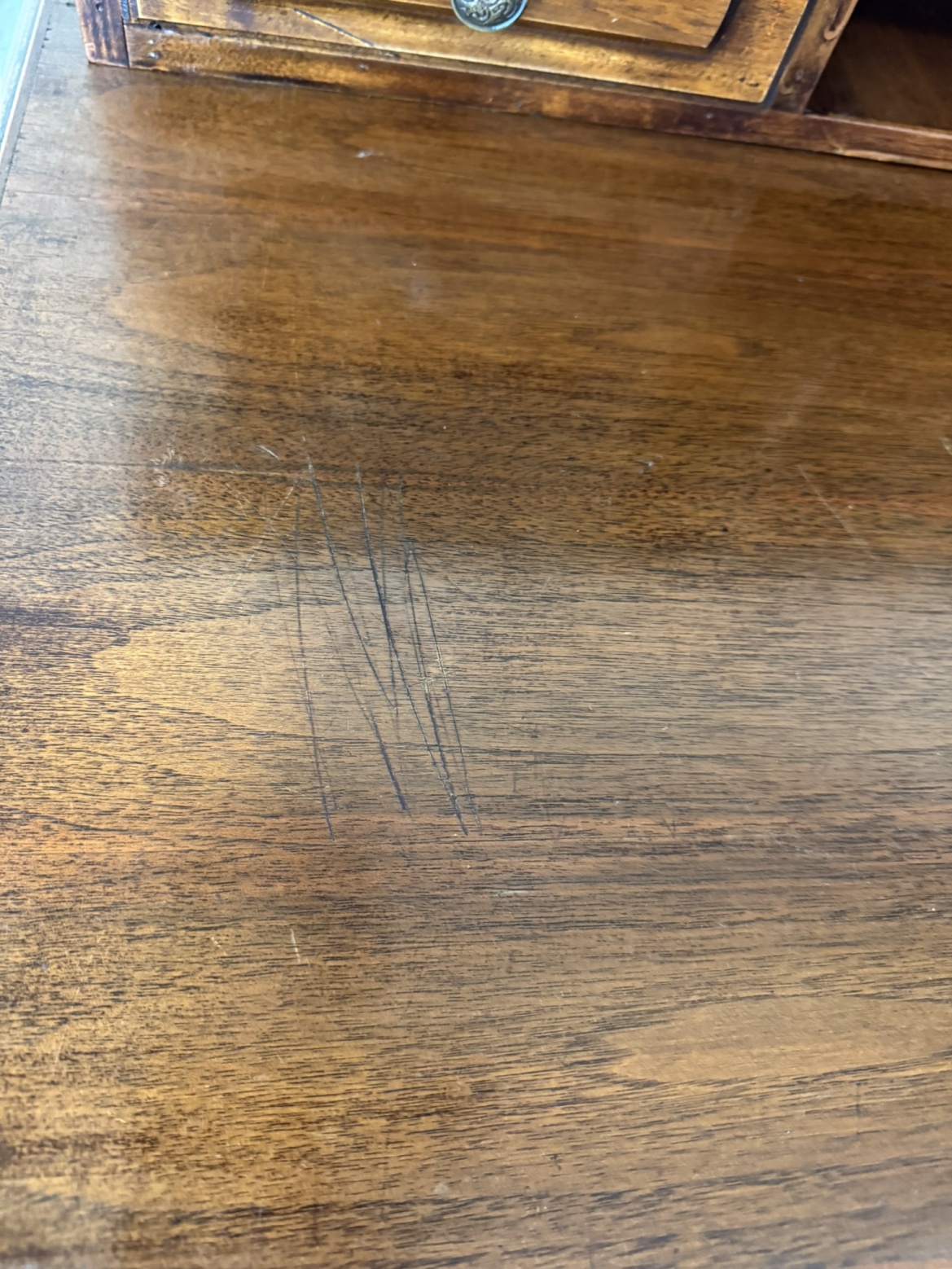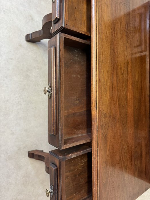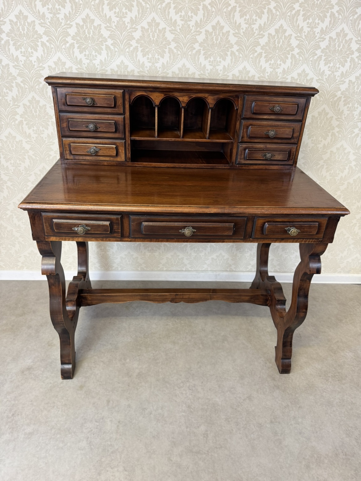 Psací stůl s horní nástavbou s menšími zásuvkami a přihrádkami s obloukovým zakončením. Spodní část tvoří hlubší zásuvky a vyřezávané boční nohy, spojené vodorovnou lištou. Povrch nese známky užívání, které podtrhují jeho dobový charakter.