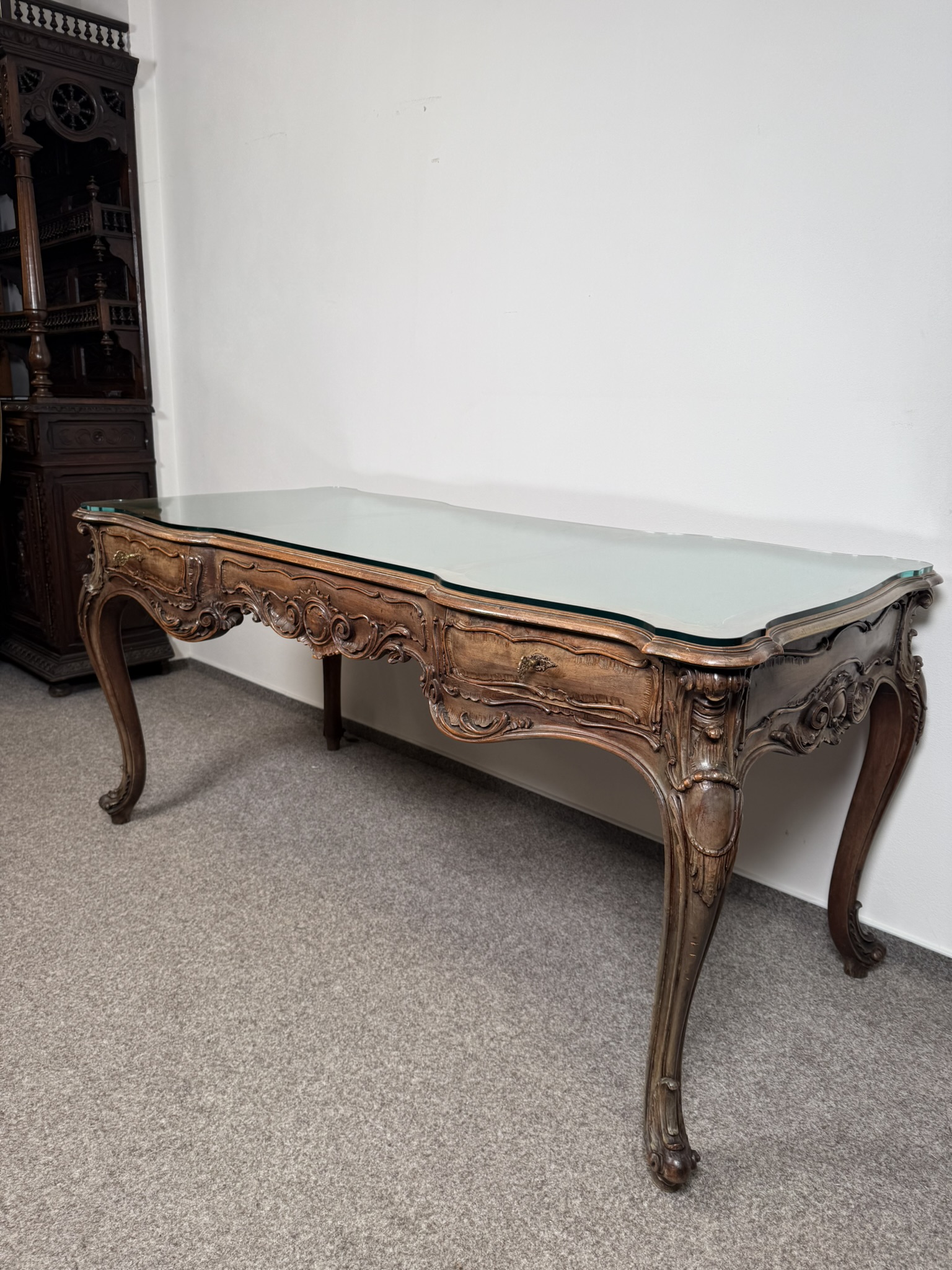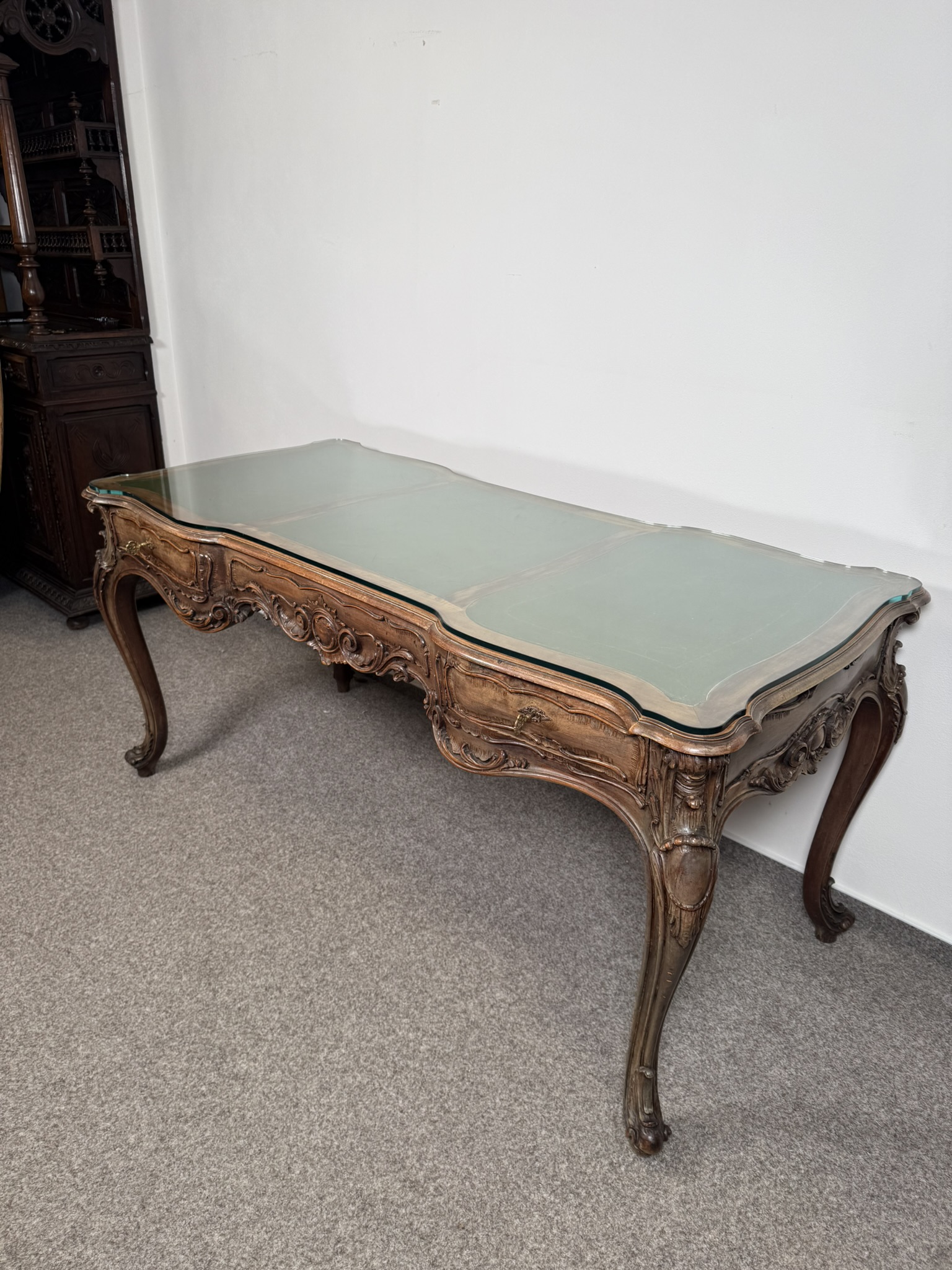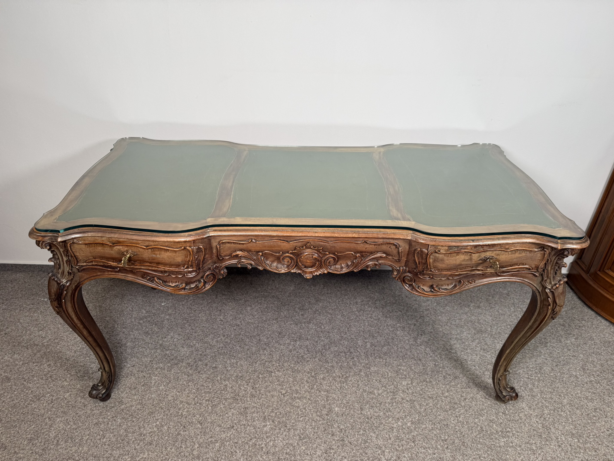 Psací stůl s bohatě tvarovanou konstrukcí, prohnutou přední linií a dvěma bočními zásuvkami s mosaznými úchyty. Deska je kryta sklem, pod nímž je zelená pracovní plocha, členěná do tří polí. Čelní i boční části zdobí řezby s motivy mušlí, nohy jsou esovitě prohnuté a zakončené jemnou profilací.