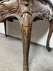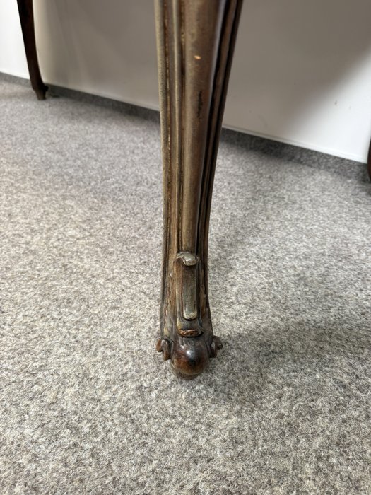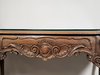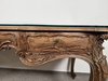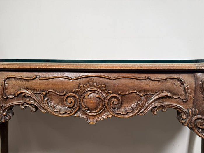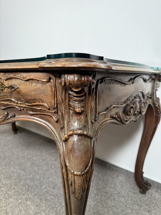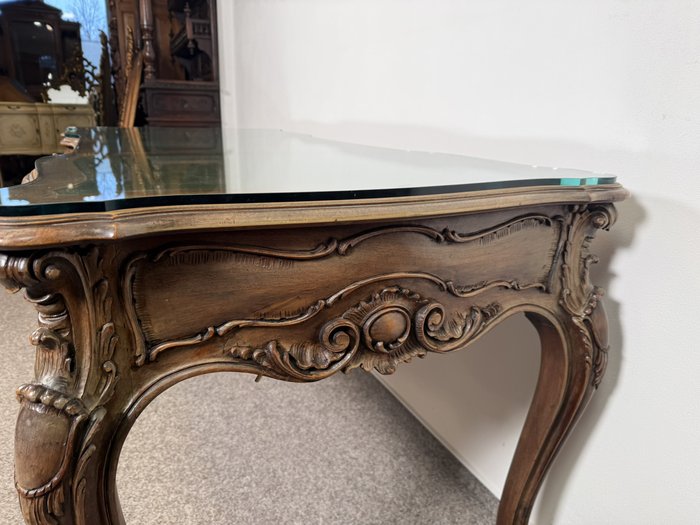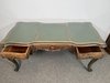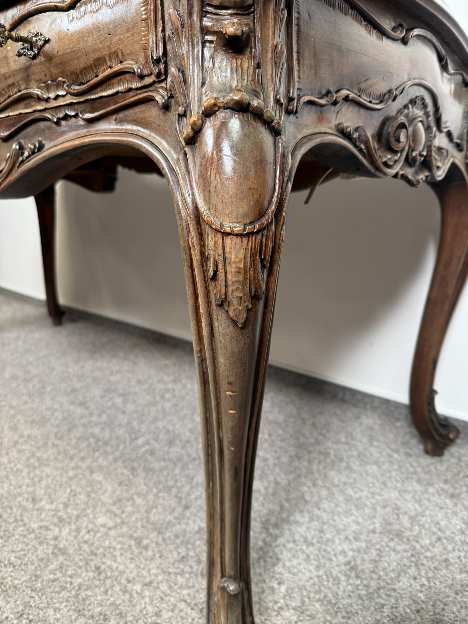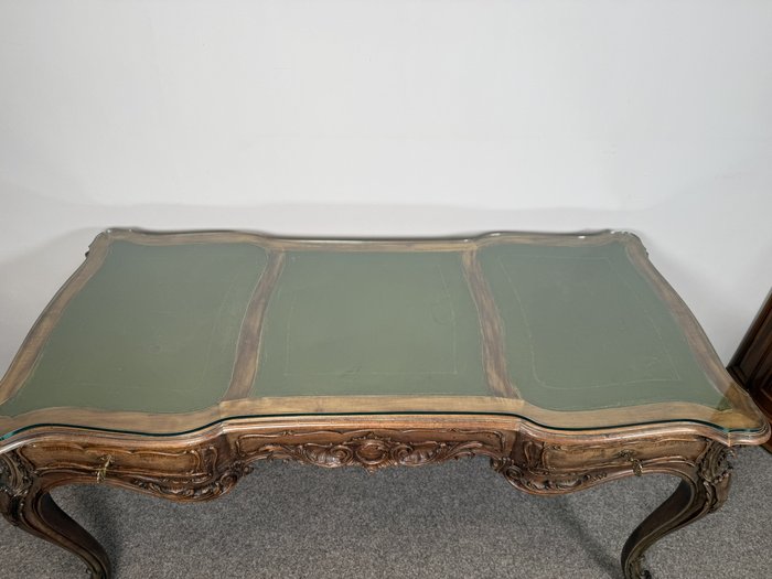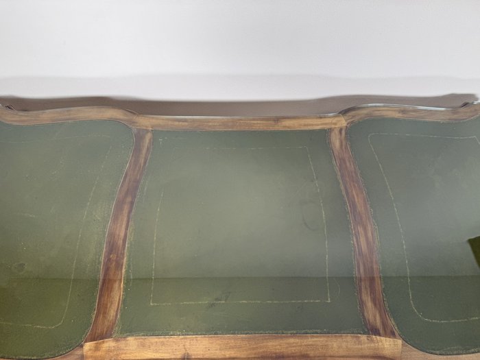 Psací stůl s bohatě tvarovanou konstrukcí, prohnutou přední linií a dvěma bočními zásuvkami s mosaznými úchyty. Deska je kryta sklem, pod nímž je zelená pracovní plocha, členěná do tří polí. Čelní i boční části zdobí řezby s motivy mušlí, nohy jsou esovitě prohnuté a zakončené jemnou profilací.