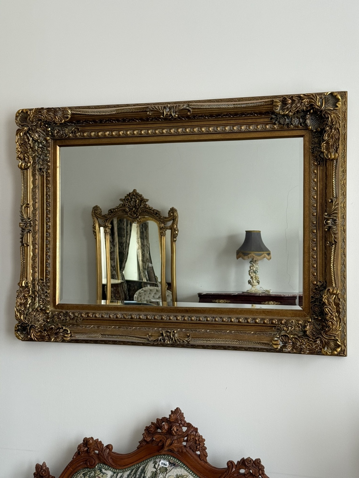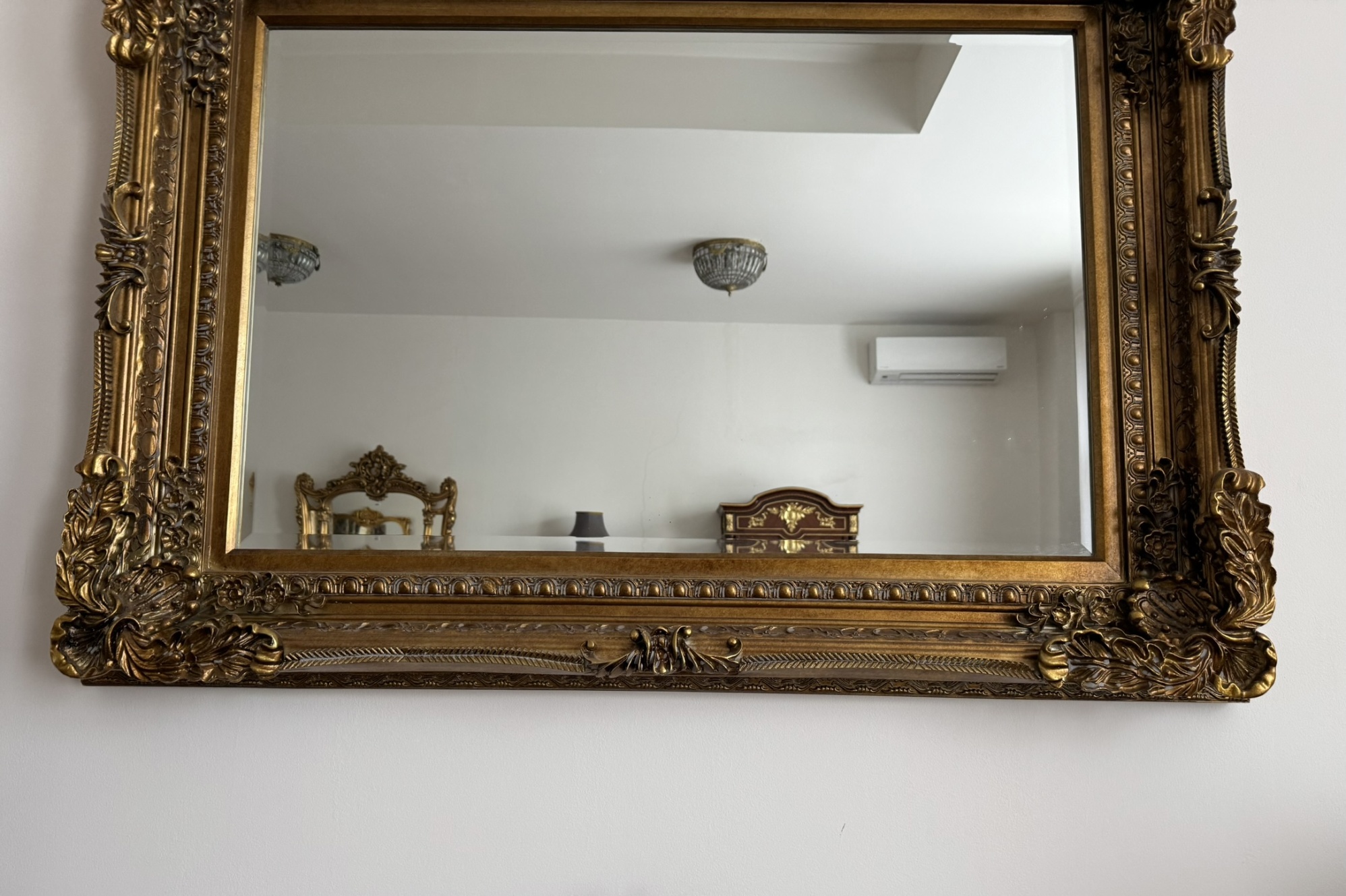 Obdélníkové nástěnné zrcadlo s rámem, dekorovaným reliéfními prvky akantu, květin a perlovce. Povrchová úprava dodává zrcadlu slavnostní charakter. Výrazné rohové prvky zvýrazňují barokní inspiraci a dělají z něj dominantní dekorativní prvek interiéru.7 880 Kč