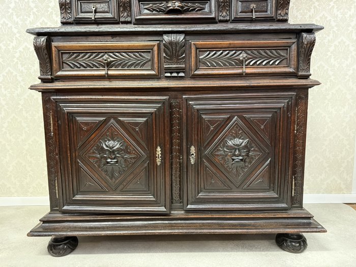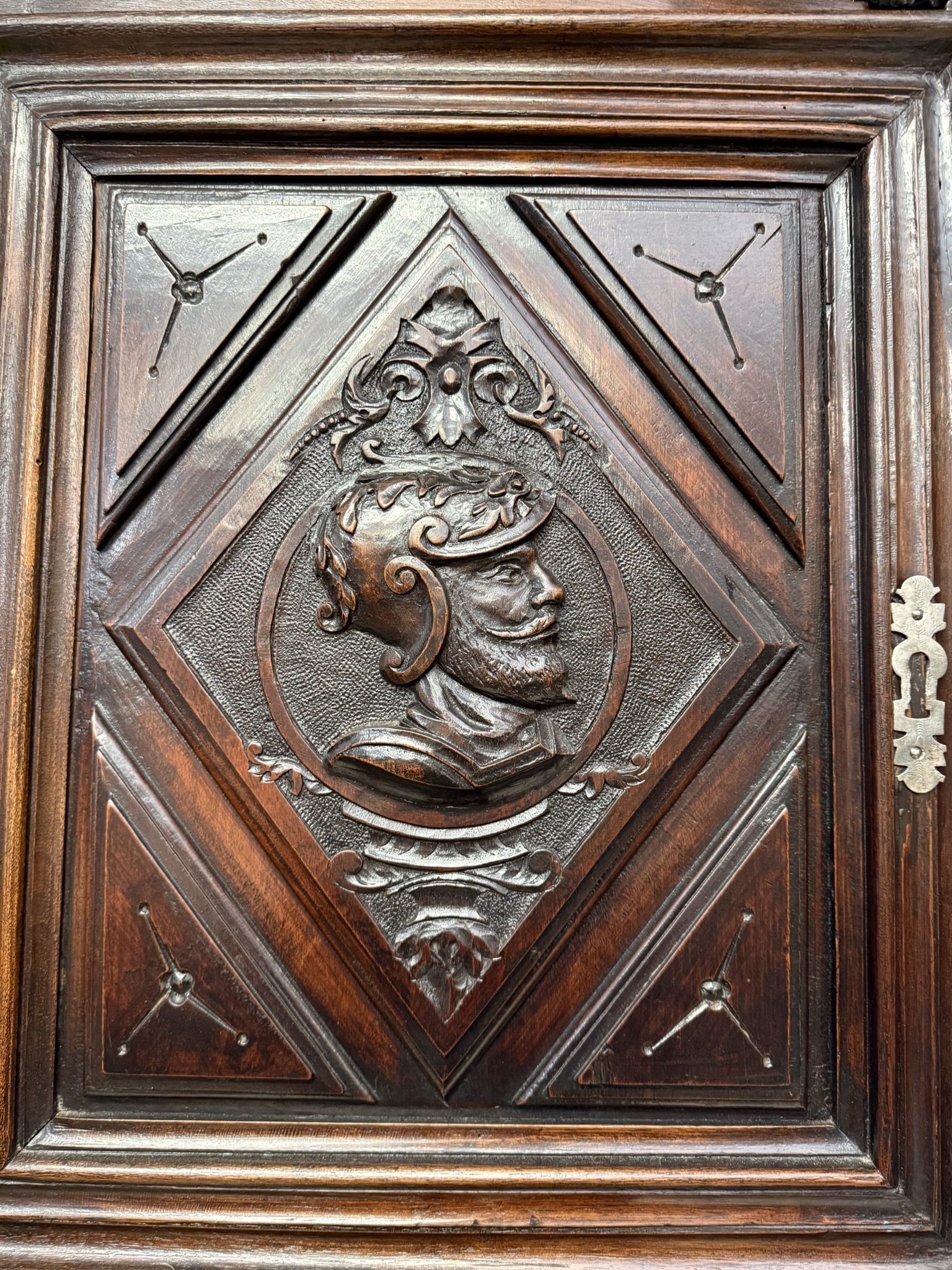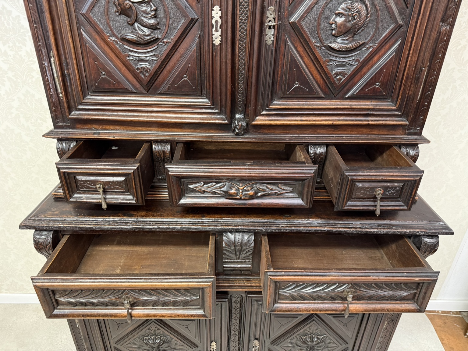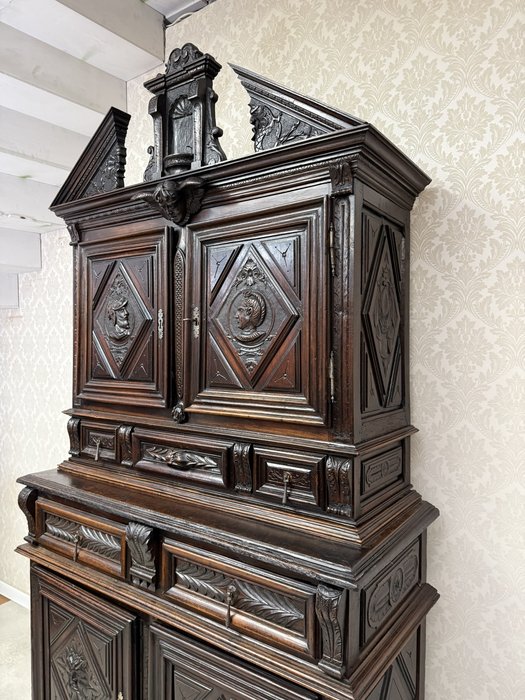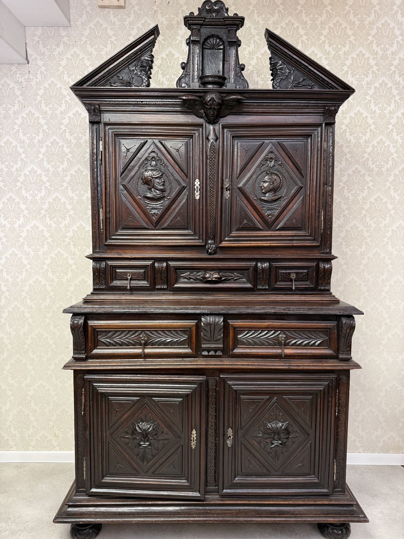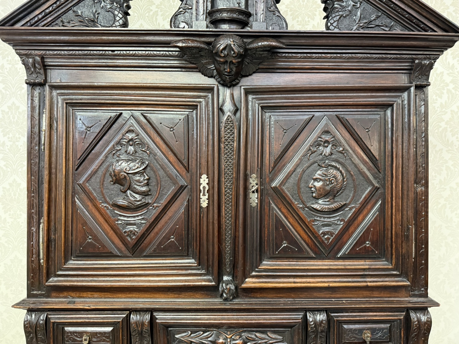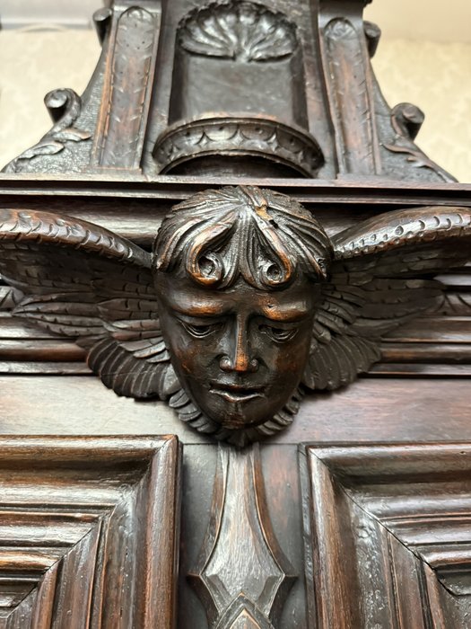 Monumentální dvoudílný kabinet s mimořádně bohatou ruční řezbou. Horní část je řešena jako uzavřená skříň s policí, spodní část nabízí zásuvky a uzavřený úložný prostor. Dvířka jsou zdobena reliéfy portrétů v kartuších, doplněnými geometrickým členěním a jemnými ornamenty. Výrazným prvkem je centrální andělská hlava s křídly.23 850 Kč