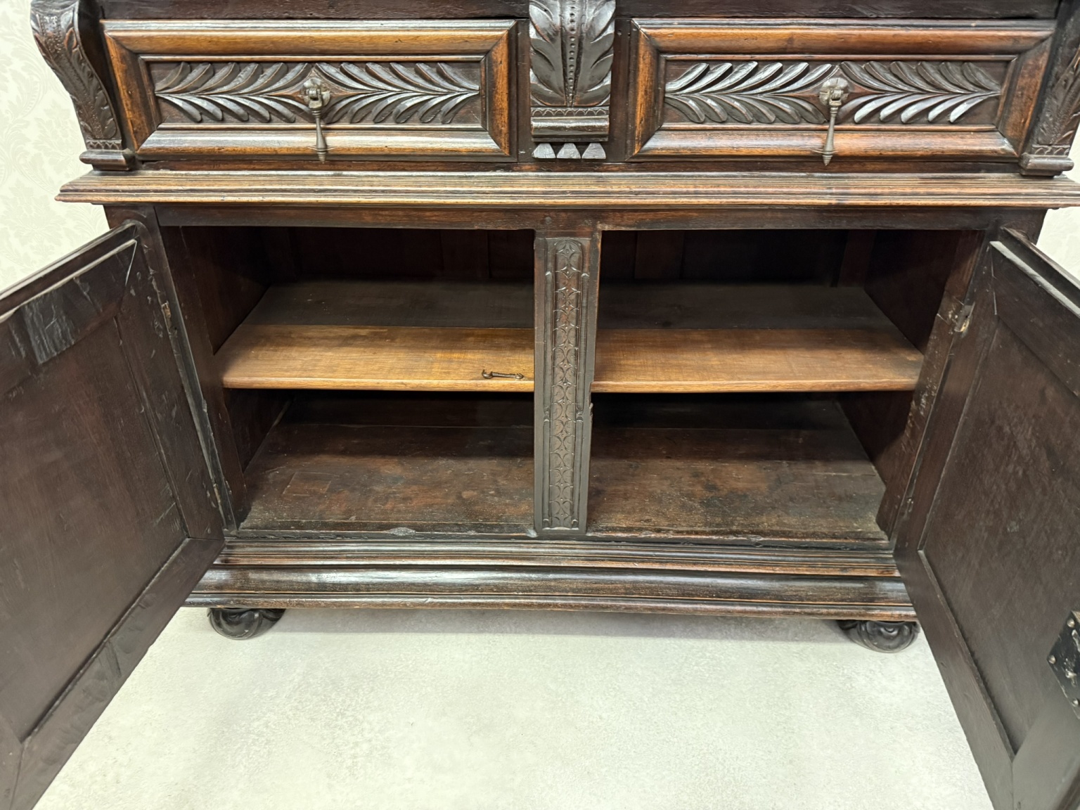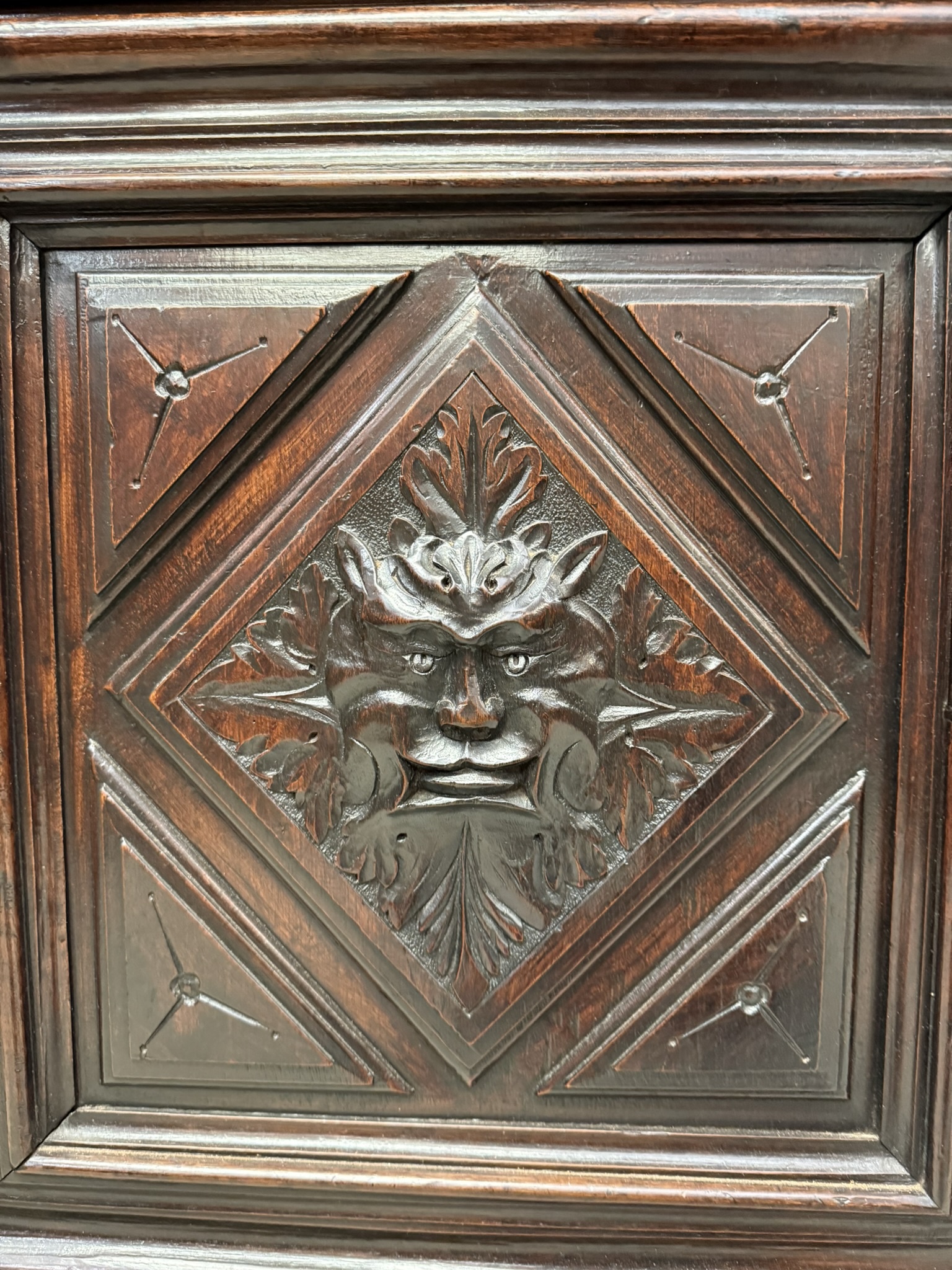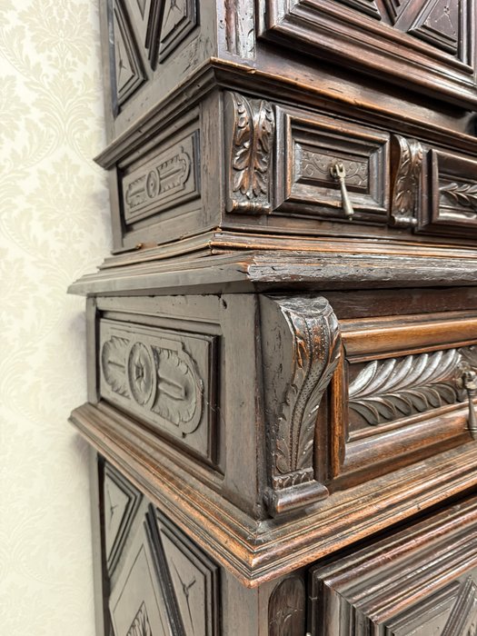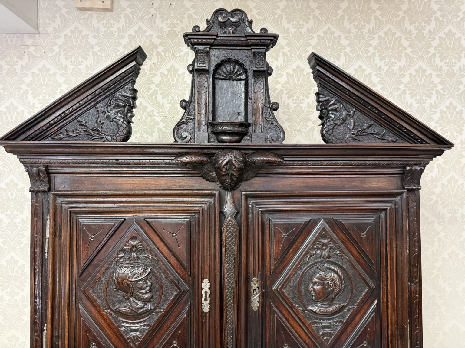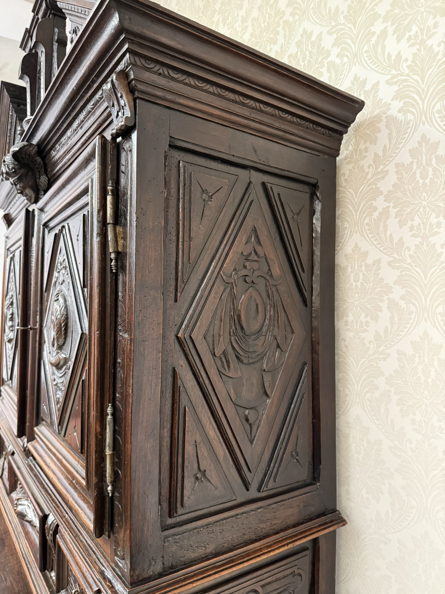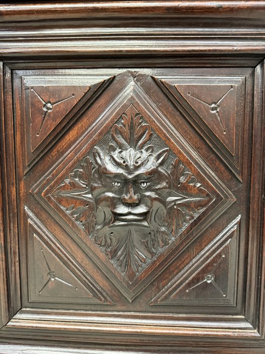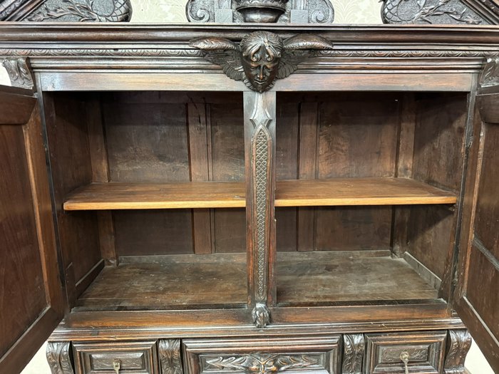 Monumentální dvoudílný kabinet s mimořádně bohatou ruční řezbou. Horní část je řešena jako uzavřená skříň s policí, spodní část nabízí zásuvky a uzavřený úložný prostor. Dvířka jsou zdobena reliéfy portrétů v kartuších, doplněnými geometrickým členěním a jemnými ornamenty. Výrazným prvkem je centrální andělská hlava s křídly.23 850 Kč