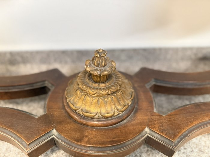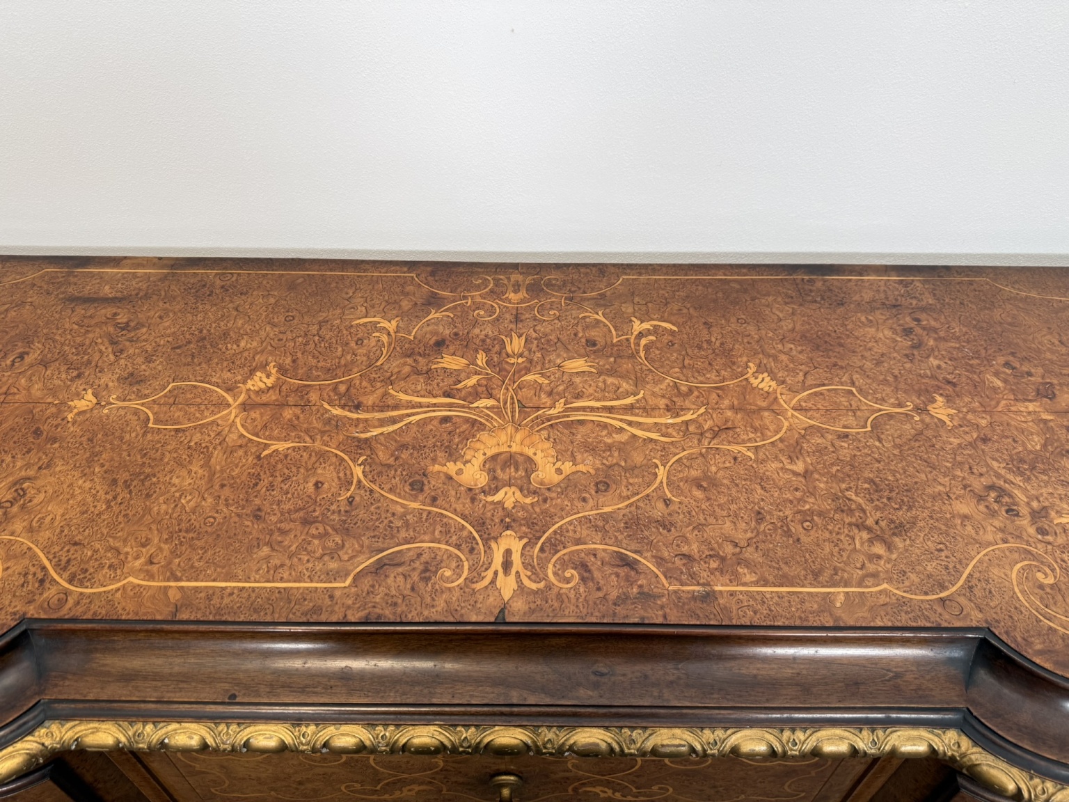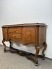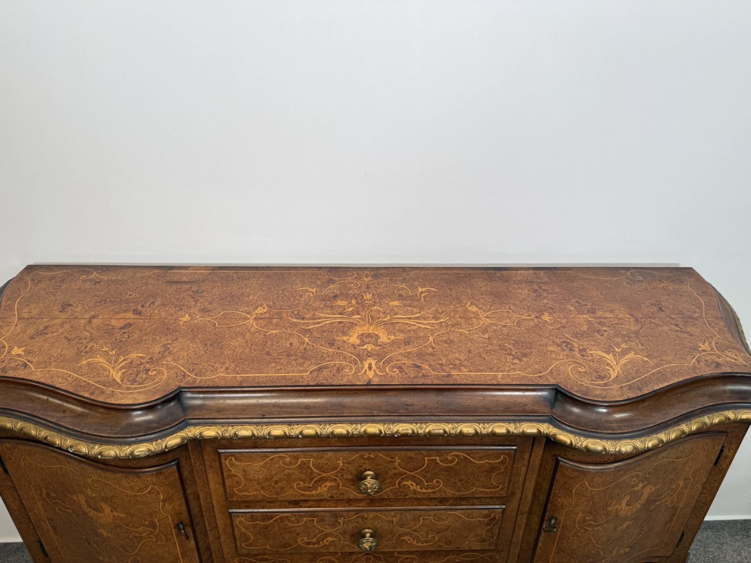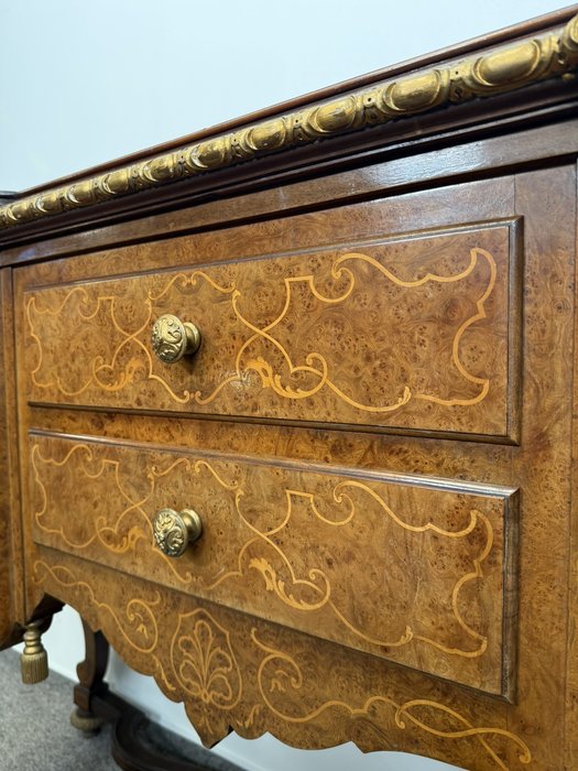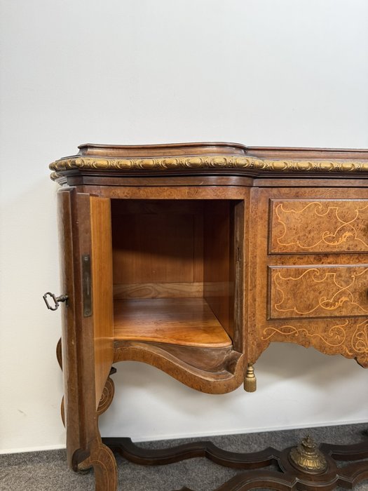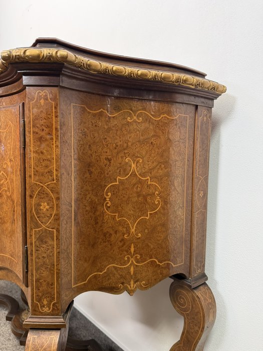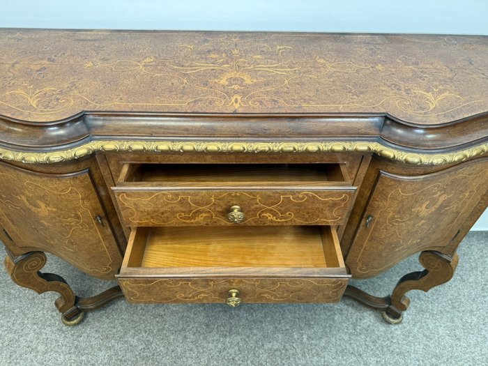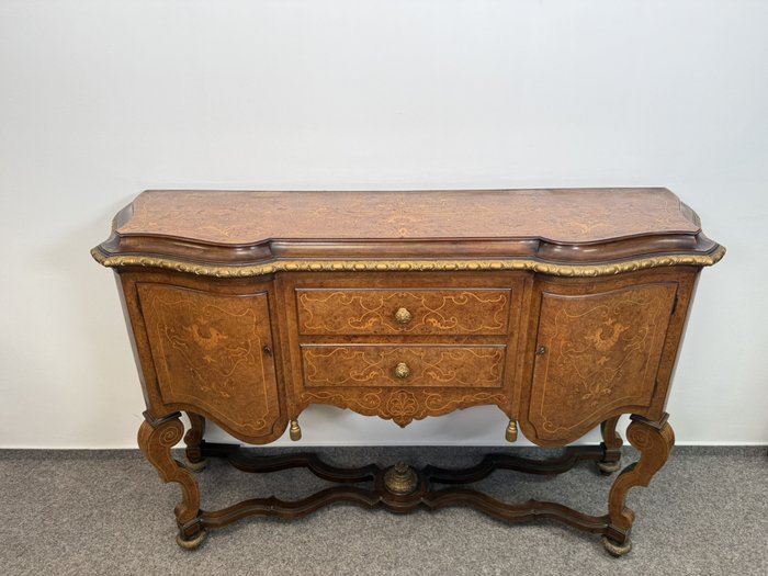 Komoda s členitým půdorysem, jemně tvarovanou deskou a precizně zpracovaným podnožím. Čelní část se zásuvkami a bočními dvířky je bohatě dekorována florální intarzií. Zásuvky i boční skříňky poskytují praktický úložný prostor.24 250 Kč