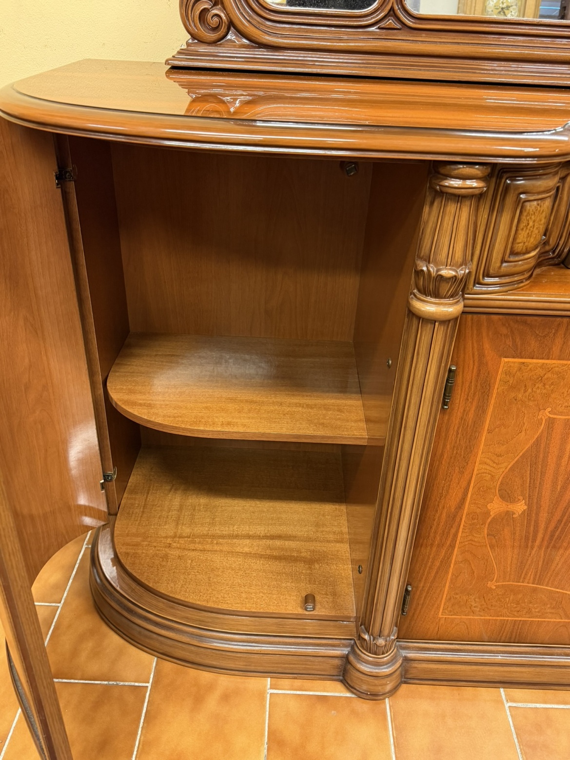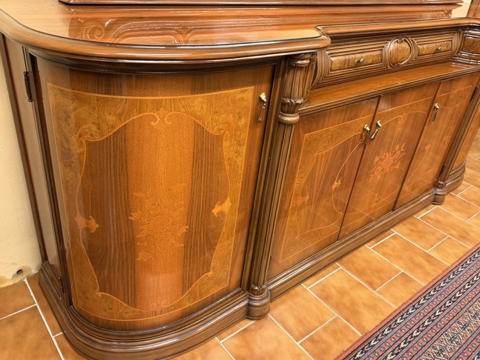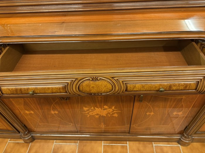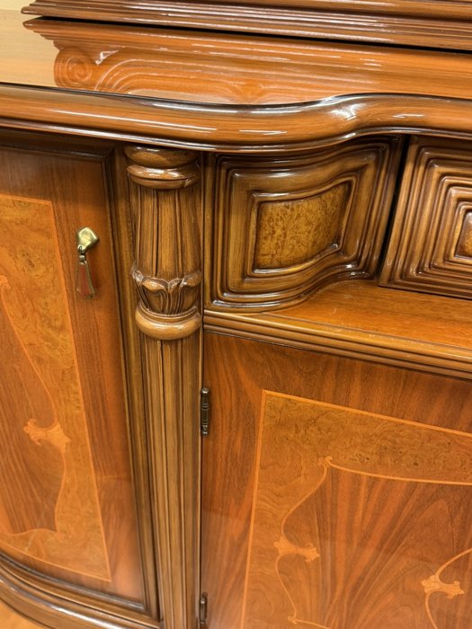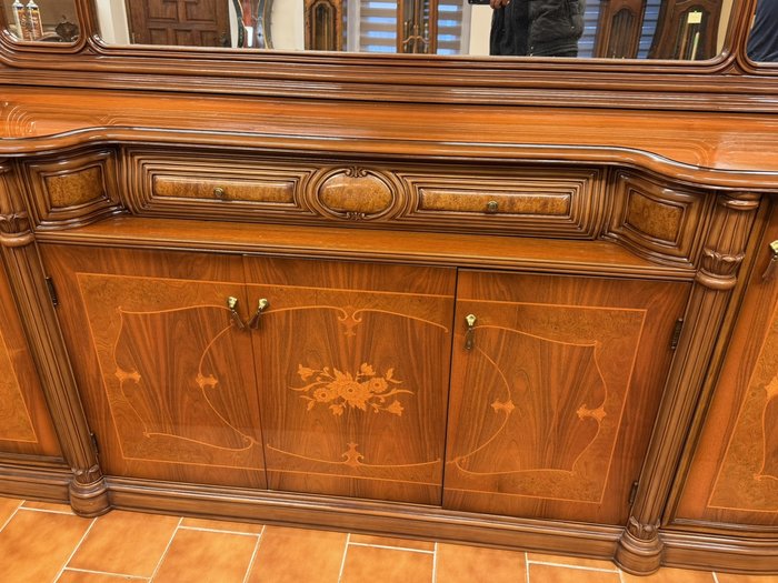 Velký příborník se zrcadlem, bohatě profilovaný a zdobený intarziemi s florálními motivy. Tvarované římsy, jemná symetrie a kombinace lesklých ploch s členitými detaily a dekorativními hranami odkazují na nábytkový design přelomu 19. a 20. století. Ideální pro jídelnu nebo reprezentační salon.